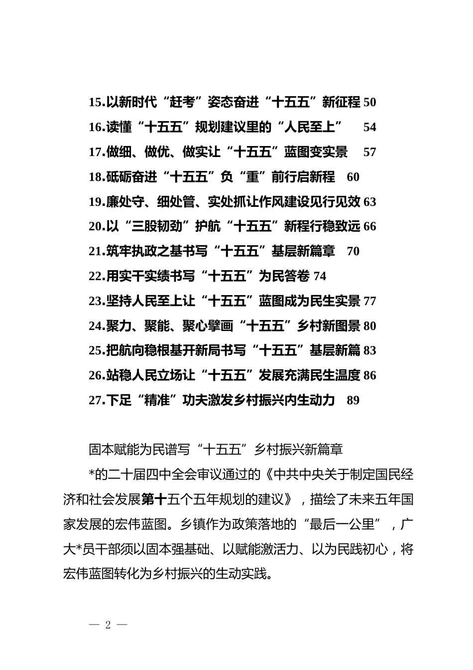 秘书之家—全网资源每日更新 www.mishuzj.com2025 年《中共中央关于制定国民经济和社会发展第十五个五年规划的建议》文稿汇编(27篇)目录1.固本赋能为民谱写“十五五”乡村振兴新篇章32.起笔、运笔、落笔绘就十五五“新画卷”63.让“投资于人”的温度暖透“十五五”民生答卷104.“真”意贯穿让全会精神在基层“声入人心”145.聚焦民声民盼民情加大保障和改善民生力度 176.以“三力”践使命绘就“十五五”民生实景图 217.锚定“十五五”新蓝图书写人民至上新答卷 248.以实干担当绘好“十五五”发展新图景279.想为、善为、敢为奋进“十五五”新征程3010.坚持党的领导锚定“十五五”目标奋楫扬帆3311.走心走深走实写好高质量发展“更”字篇章3712.知民亲民惠民把人民至上写进“十五五”答卷 3913.以高质量党建护航“十五五”征程行稳致远4314.蓄势起航让“十五五”蓝图化为幸福实景46— 1 —15.以新时代“赶考”姿态奋进“十五五”新征程 5016.读懂“十五五”规划建议里的“人民至上”5417.做细、做优、做实让“十五五”蓝图变实景5718.砥砺奋进“十五五”负“重”前行启新程6019.廉处守、细处管、实处抓让作风建设见行见效 6320.以“三股韧劲”护航“十五五”新程行稳致远 6621.筑牢执政之基书写“十五五”基层新篇章7022.用实干实绩书写“十五五”为民答卷 7423.坚持人民至上让“十五五”蓝图成为民生实景 7724.聚力、聚能、聚心擘画“十五五”乡村新图景 8025.把航向稳根基开新局书写“十五五”基层新篇 8326.站稳人民立场让“十五五”发展充满民生温度 8627.下足“精准”功夫激发乡村振兴内生动力89固本赋能为民谱写“十五五”乡村振兴新篇章*的二十届四中全会审议通过的《中共中央关于制定国民经济和社会发展第十五个五年规划的建议》,描绘了未来五年国家发展的宏伟蓝图。乡镇作为政策落地的“最后一公里”,广大*员干部须以固本强基础、以赋能激活力、以为民践初心,将宏伟蓝图转化为乡村振兴的生动实践。— 2 —秘书之家—全网资源每日更新 www.mishuzj.com以固本强基础,将组织优势转化为治理效能。乡村振兴,关键在*。基层*组织是团结带领群众推进振兴的“主心骨”。广大*员干部要坚持深化 dj 引领。健全“乡镇*委—村*组织—网格*小组—*员中心户”的组织体系,推动 dj 工作与网格治理深度融合,严格落实“三会一课”制度,全面推行“dj+网格”模式,将组织优势延伸到矛盾调解、产业发展和乡村治理一线,确保*的政策在基层落地见效。要注重培育骨干力量,为*组织注入“源头活水”。可从返乡青年、退役军人、优秀村民等群体中选拔后备干部,通过系统培养和动态管理,将优秀人才及时纳入村“两委”班子。面对新形势新要求,还需加强干部精准化培训,提升推动高质量发展、服务群众、防范化解风险的本领,树立在乡村振兴一线锻炼队伍的鲜明导向,推动*员干部展现“想干事、能干事、干成事”的实干作风。以赋能激活力,为乡村振兴注入强劲动能。乡村发展需坚持产业与人才双轮驱动,关键在于立足乡镇资源禀赋,因地制宜发展特色产业,深入践行“绿水青山就是金山银山”理念,打造“一村一品、一乡一特”的产业格局。******指出:“乡村要振兴,因地制宜选择富民产业是关键。”广大*员干部要积极推广“*支部+合作社+农户”等模式,发展智慧农业、生态旅游、休闲康养等新业态,推动农村一二三产业融合,并加强— 3 —高标准农田建设;发展农村电商、智慧物流,延伸产业链,将生态优势转化为经济优势。在人才支撑上,要实施“引凤还巢”工程吸引外出人员返乡创业,通过“一线实训”提升基层干部能力,挖掘培养“田专家”“土秀才”等本土实用人才。同时需优化创业政策,通过订单农业、保底分红、股份合作等利益联结机制,让农民更多分享产业增值收益,并推动企业、高校、科研院所与乡村合作,促进科技成果转化,为乡村振兴注入持续动能。以为民践初心,用真情服务凝聚一方人心。乡镇工作本质是为民服务,必须践行以人民为中心的发展思想,将“人民至上”融入日常。广大*员干部要坚持深入基层,通过干部下沉走访、民情恳谈会、入户走访、网格排查等多种方...