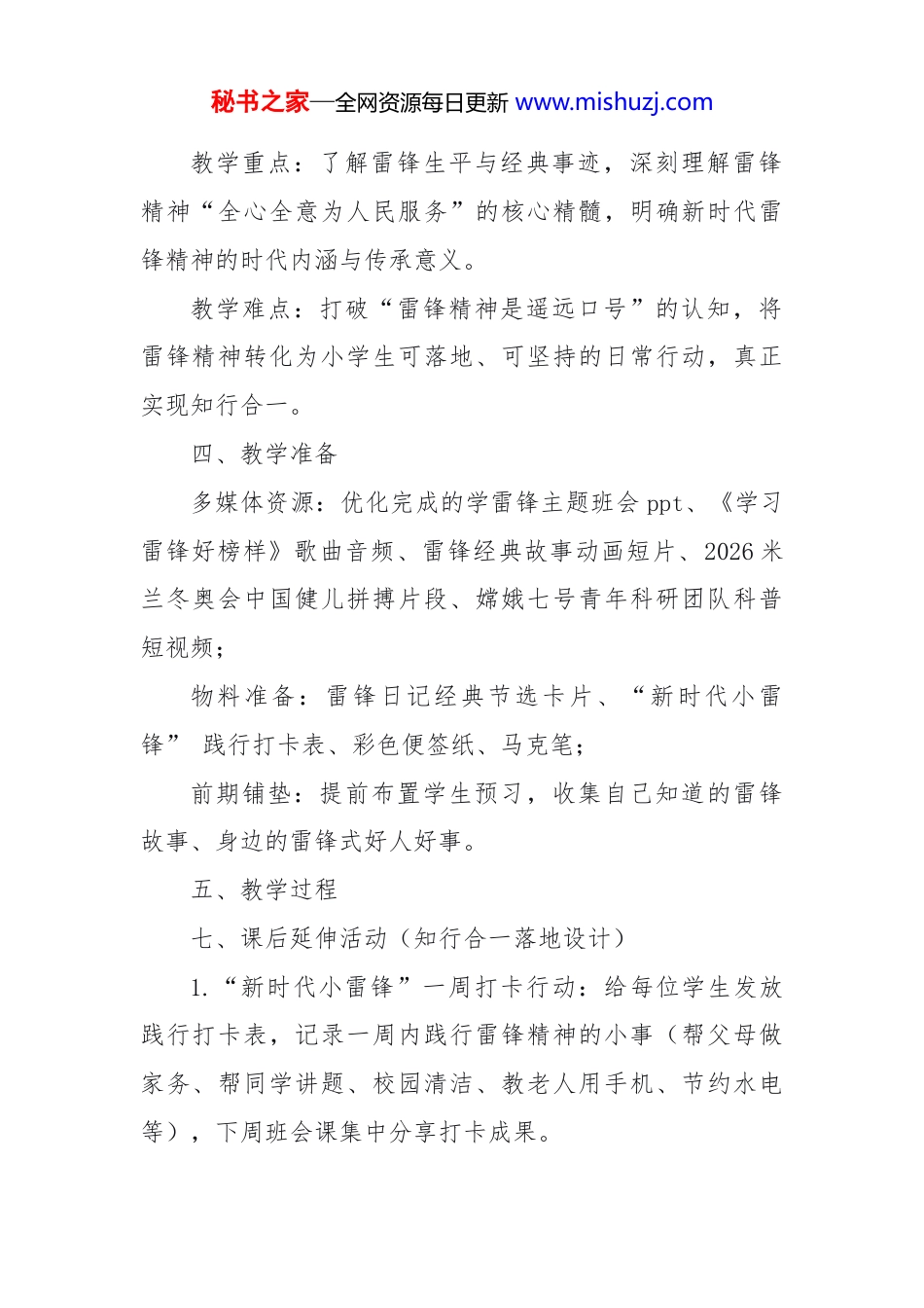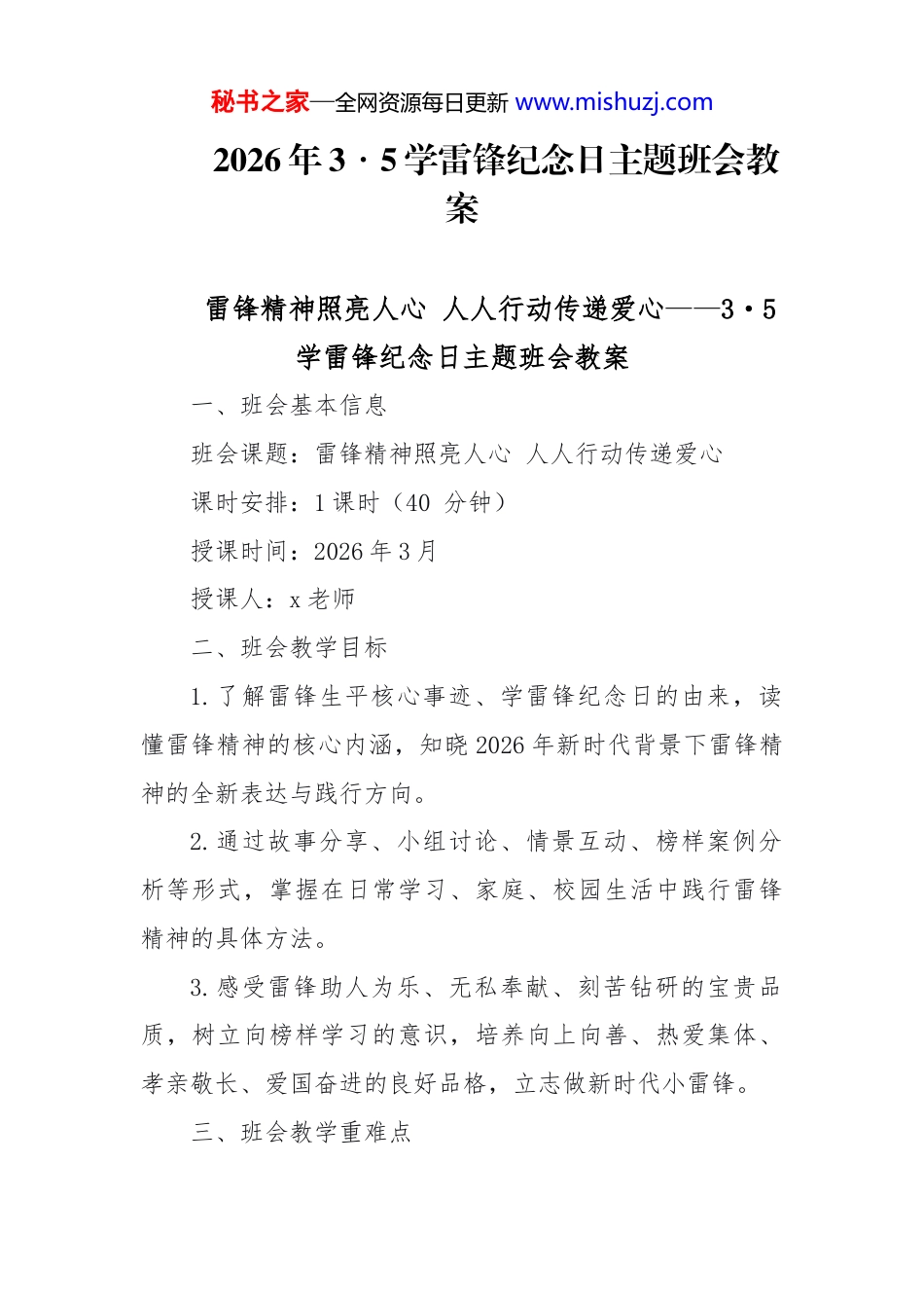 秘书之家—全网资源每日更新 www.mishuzj.com2026 年 3・5 学雷锋纪念日主题班会教案雷锋精神照亮人心 人人行动传递爱心——3・5学雷锋纪念日主题班会教案一、班会基本信息班会课题:雷锋精神照亮人心 人人行动传递爱心课时安排:1 课时(40 分钟)授课时间:2026 年 3 月授课人:x 老师二、班会教学目标1.了解雷锋生平核心事迹、学雷锋纪念日的由来,读懂雷锋精神的核心内涵,知晓 2026 年新时代背景下雷锋精神的全新表达与践行方向。2.通过故事分享、小组讨论、情景互动、榜样案例分析等形式,掌握在日常学习、家庭、校园生活中践行雷锋精神的具体方法。3.感受雷锋助人为乐、无私奉献、刻苦钻研的宝贵品质,树立向榜样学习的意识,培养向上向善、热爱集体、孝亲敬长、爱国奋进的良好品格,立志做新时代小雷锋。三、班会教学重难点秘书之家—全网资源每日更新 www.mishuzj.com教学重点:了解雷锋生平与经典事迹,深刻理解雷锋精神“全心全意为人民服务”的核心精髓,明确新时代雷锋精神的时代内涵与传承意义。教学难点:打破“雷锋精神是遥远口号”的认知,将雷锋精神转化为小学生可落地、可坚持的日常行动,真正实现知行合一。四、教学准备多媒体资源:优化完成的学雷锋主题班会 ppt、《学习雷锋好榜样》歌曲音频、雷锋经典故事动画短片、2026 米兰冬奥会中国健儿拼搏片段、嫦娥七号青年科研团队科普短视频;物料准备:雷锋日记经典节选卡片、“新时代小雷锋” 践行打卡表、彩色便签纸、马克笔;前期铺垫:提前布置学生预习,收集自己知道的雷锋故事、身边的雷锋式好人好事。五、教学过程七、课后延伸活动(知行合一落地设计)1.“新时代小雷锋”一周打卡行动:给每位学生发放践行打卡表,记录一周内践行雷锋精神的小事(帮父母做家务、帮同学讲题、校园清洁、教老人用手机、节约水电等),下周班会课集中分享打卡成果。秘书之家—全网资源每日更新 www.mishuzj.com2.班级“雷锋角”建设:在教室设立专属雷锋角,张贴学生的好人好事记录、雷锋日记摘抄、践行活动照片,每月评选 1 次“班级小雷锋”,树立班级榜样。3. 学雷锋志愿服务实践:以班级为单位,开展 1 次校园/社区志愿服务,可选方向:校园清洁美化、智慧助老进社区、闲置图书文具捐赠给乡村小学,让雷锋精神走出课堂、落到实处。4.雷锋日记仿写活动:让学生仿写一篇雷锋日记,记录自己做的好人好事与内心感悟,优秀作品可在班级雷锋角展示、校园广播站播出。八、教学反思(课后填写)1. 本次班会学生的整体参与度如何?互动讨论环节是否达到预期效果?2. 学生是否真正理解了新时代雷锋精神的内涵?能否清晰说出可落地的践行方法?3. 案例、故事与视频内容是否贴合对应学段学生的认知水平?哪些环节可以进一步优化?4. 课后延伸活动的落地情况如何?是否真正实现了“知行合一”的德育目标?