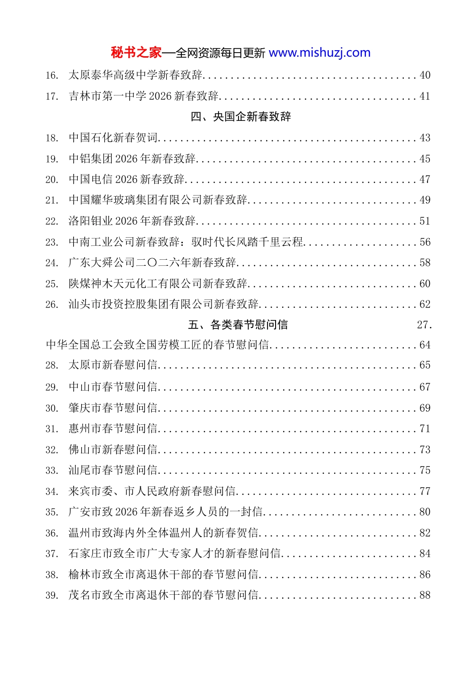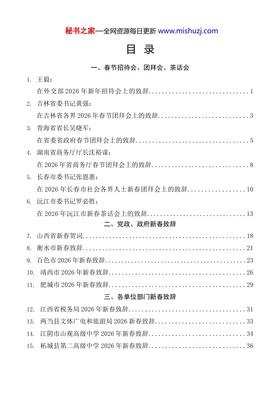 秘书之家—全网资源每日更新 www.mishuzj.com目 录一、春节招待会、团拜会、茶话会1. 王毅: 在外交部 2026 年新年招待会上的致辞..............................1 2. 吉林省委书记黄强: 在吉林省各界 2026 年春节团拜会上的致辞...........................3 3. 青海省省长吴晓军: 在省委省政府春节团拜会上的致辞..................................5 4. 湖南省商务厅厅长沈裕谋: 在 2026 年省商务厅春节团拜会上的致辞.............................8 5. 长春市委书记张恩惠: 在 2026 年长春市社会各界人士新春团拜会上的致辞.................10 6. 沅江市委书记罗必胜: 在 2026 年沅江市新春茶话会上的致辞..............................13 二、党政、政府新春致辞7. 山西省新春贺词.................................................18 8. 衡水市新春致辞.................................................21 9. 百色市 2026 年新春致辞...........................................23 10. 靖西市 2026 年新春致辞.........................................26 11. 肥城市 2026 年新春致辞.........................................29 三、各单位部门新春致辞 12. 江西省税务局 2026 年新春致辞...................................31 13. 两当县文体广电和旅游局 2026 新春致辞...........................33 14. 江阴市山观高级中学 2026 年新春致辞.............................34 15. 柘城县第二高级中学 2026 年新春致辞.............................36 秘书之家—全网资源每日更新 www.mishuzj.com16. 太原泰华高级中学新春致辞......................................40 17. 吉林市第一中学 2026 新春致辞...................................41 四、央国企新春致辞 18. 中国石化新春贺词..............................................43 19. 中铝集团 2026 年新春致辞.......................................45 20. 中国电信 2026 新春致辞.........................................47 21. 中国耀华玻璃集团有限公司新春致辞..............................49 22. 洛阳钼业 2026 年新春致辞.......................................51 23. 中南工业公司新春致辞:驭时代长风踏千里云程....................56 24. 广东大舜公司二〇二六年新春致辞................................58 25. 陕煤神木天元化工有限公司新春致辞..............................60 26. 汕头市投资控股集团有限公司新春致辞............................62 五、各类春节慰问信 27.中华全国总工会致全国劳模工匠的春节慰问信..........................64 28. 太原市新春慰问信..............................................65 29. 中山市春节慰问信..............................................67 30. 肇庆市春节慰问信..............................................69 31. 惠州市春节慰问信..............................................71 32. 佛山市新春慰问信..............................................73 33. 汕尾市春节慰问信..............................................75 34. 来宾市委、市人民政府新春慰问信................................77 35. 广安市致 2026 年新春返乡人员的一封信...........................80 36. 温州市致海内外全体温州人的新春贺信............................82 37. 石家庄市致全市广大专家人才的新春慰问信........................84 38. 榆林市致全市离退休干部的春节慰问信............................86 39. 茂名市致全市离退休干部的春节慰问信............................88秘书之家—全网资源每日更新 www.mishuzj.com在外交部 2026 年新年招待会上的致辞王毅(2026 年 2 月 5 日)很高兴在岁末年初,和驻华使团欢聚一堂、共迎新春。首先,我要代表外交部,向大...