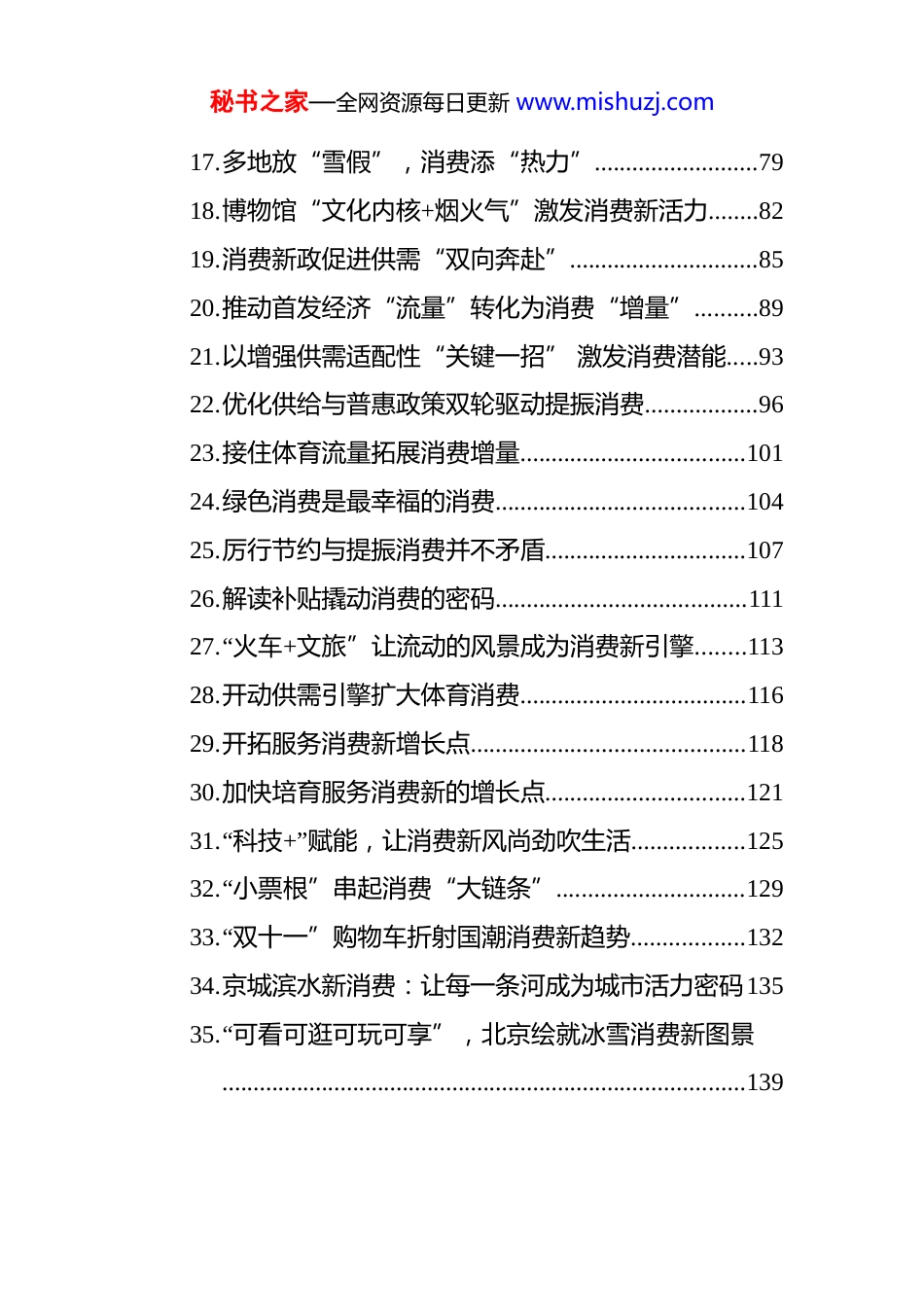 秘书之家—全网资源每日更新 www.mishuzj.com提振消费类文稿合集汇编(36 篇)目录1. 抓住情绪消费风口........................................................42. 政策+赛事+平台协同赋能,激活体育消费新引擎...73. 顺势培育服务消费新增长点......................................114. 从书展看文化消费新潮流..........................................155. 让赛事经济“燃动”消费新引擎..............................186. 打通服务消费供需衔接堵点......................................237. 促消费向稳向好需政策加力优化..............................268. 数字消费激活发展新动能..........................................339. 青年消费新图景及趋势应对......................................3610.“钟鼓和鸣”奏响北京跨年消费融合新乐章............5011.科技赋能,“冰雪+”点亮消费与经济双引擎..........5412.品特产、寻年味:让两节消费旺起来暖起来..........5813.多元路径提振消费......................................................6014.着力促进形成更多由内需主导、消费拉动、内生增长的经济发展模式......................................................6315.让预付式消费值得“托付”......................................7316.激活老字号消费新场景..............................................76秘书之家—全网资源每日更新 www.mishuzj.com17.多地放“雪假”,消费添“热力”..........................7918.博物馆“文化内核+烟火气”激发消费新活力........8219.消费新政促进供需“双向奔赴”..............................8520.推动首发经济“流量”转化为消费“增量”..........8921.以增强供需适配性“关键一招” 激发消费潜能.....9322.优化供给与普惠政策双轮驱动提振消费..................9623.接住体育流量拓展消费增量....................................10124.绿色消费是最幸福的消费........................................10425.厉行节约与提振消费并不矛盾................................10726.解读补贴撬动消费的密码........................................11127.“火车+文旅”让流动的风景成为消费新引擎........11328.开动供需引擎扩大体育消费....................................11629.开拓服务消费新增长点............................................11830.加快培育服务消费新的增长点................................12131.“科技+”赋能,让消费新风尚劲吹生活..................12532.“小票根”串起消费“大链条”..............................12933.“双十一”购物车折射国潮消费新趋势..................13234.京城滨水新消费:让每一条河成为城市活力密码13535.“可看可逛可玩可享”,北京绘就冰雪消费新图景....................................................................................139秘书之家—全网资源每日更新 www.mishuzj.com36.坚持扩大内需 以高品质消费需求塑造发展新动能....................................................................................142抓住情绪消费风口憨态可掬的浪浪山小妖怪联名挂件、各家博物馆争相推出的文物挂件……各种新潮可爱的小配饰成为不少人背包上的“包搭子”。包挂经济既展现了消费市场的新活力,也折射出情绪消费需求的快速增长。何为情绪消费?简而言之,不为需要,只为心动。主要指满足消费者情绪需求的经济形态,强调商品和消费过程中的情绪价值和情感链接,即消费者更注重产品或服务所带来的情感体验和心理满足,而不是只看重其实用功能。放眼整个消费领域,情绪消费正构成新消费热点,不断解锁新应用场景。比如,年轻人热衷通过抽盲盒、买“谷子”塑造身份认同、获取社交谈资。还有在社交媒体平台上,不少网友晒出自己购买的充满儿时回忆的文创玩偶。《2025 年轻人情绪消费趋势报告》显示,六成人愿意为自己的情绪消费,他们愿意为刹那的心动、突然的共鸣或者有参与感的体验花钱。秘书...