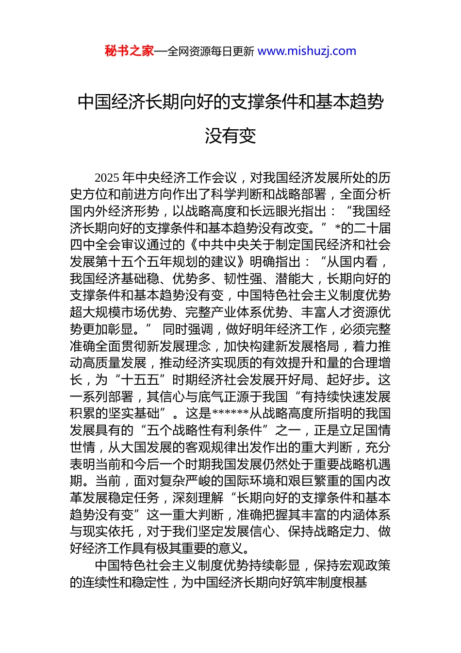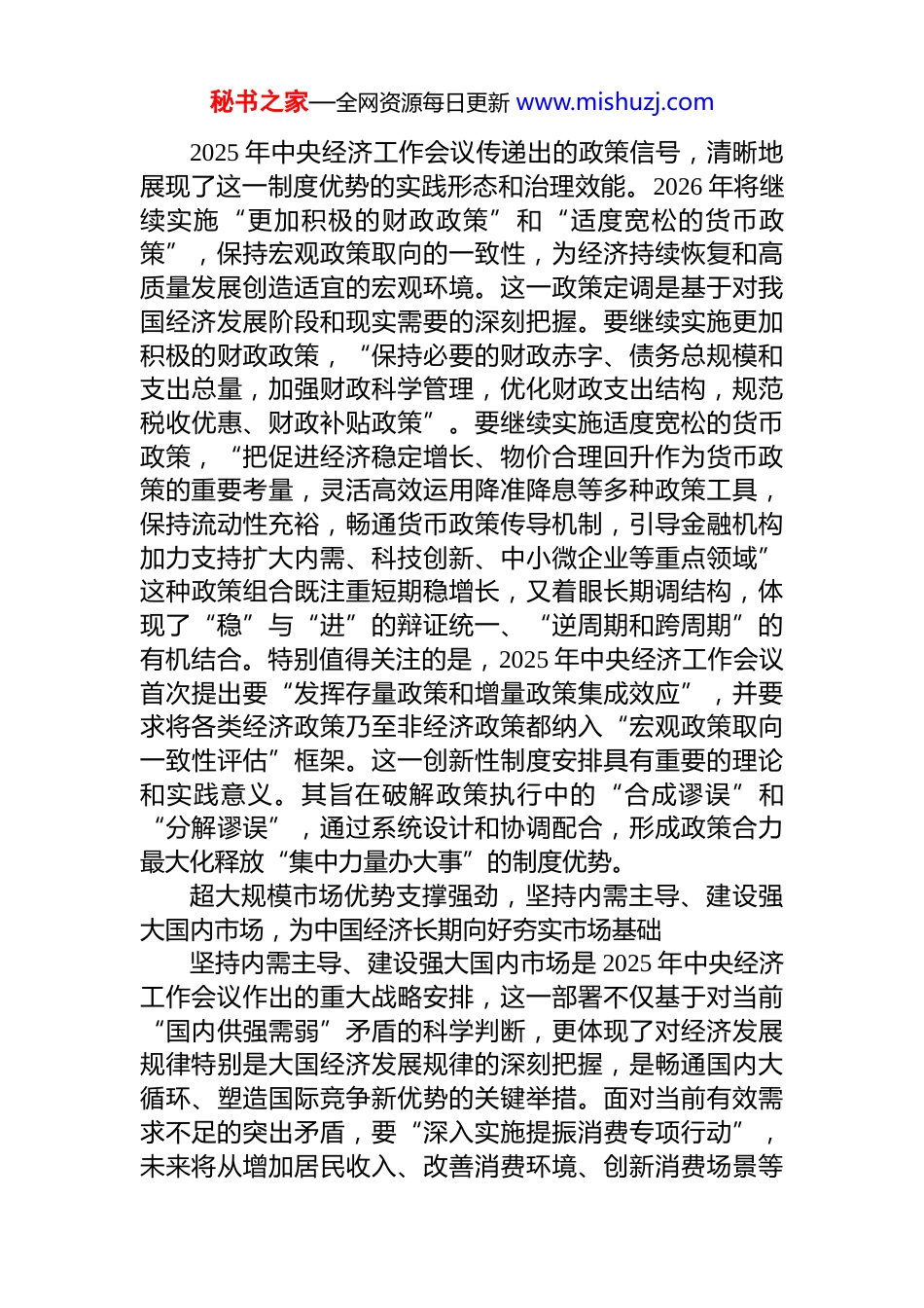 秘书之家—全网资源每日更新 www.mishuzj.com中国经济长期向好的支撑条件和基本趋势没有变2025 年中央经济工作会议,对我国经济发展所处的历史方位和前进方向作出了科学判断和战略部署,全面分析国内外经济形势,以战略高度和长远眼光指出:“我国经济长期向好的支撑条件和基本趋势没有改变。”*的二十届四中全会审议通过的《中共中央关于制定国民经济和社会发展第十五个五年规划的建议》明确指出:“从国内看,我国经济基础稳、优势多、韧性强、潜能大,长期向好的支撑条件和基本趋势没有变,中国特色社会主义制度优势超大规模市场优势、完整产业体系优势、丰富人才资源优势更加彰显。” 同时强调,做好明年经济工作,必须完整准确全面贯彻新发展理念,加快构建新发展格局,着力推动高质量发展,推动经济实现质的有效提升和量的合理增长,为“十五五”时期经济社会发展开好局、起好步。这一系列部署,其信心与底气正源于我国“有持续快速发展积累的坚实基础”。这是******从战略高度所指明的我国发展具有的“五个战略性有利条件”之一,正是立足国情世情,从大国发展的客观规律出发作出的重大判断,充分表明当前和今后一个时期我国发展仍然处于重要战略机遇期。当前,面对复杂严峻的国际环境和艰巨繁重的国内改革发展稳定任务,深刻理解“长期向好的支撑条件和基本趋势没有变”这一重大判断,准确把握其丰富的内涵体系与现实依托,对于我们坚定发展信心、保持战略定力、做好经济工作具有极其重要的意义。中国特色社会主义制度优势持续彰显,保持宏观政策的连续性和稳定性,为中国经济长期向好筑牢制度根基秘书之家—全网资源每日更新 www.mishuzj.com2025 年中央经济工作会议传递出的政策信号,清晰地展现了这一制度优势的实践形态和治理效能。2026 年将继续实施“更加积极的财政政策”和“适度宽松的货币政策”,保持宏观政策取向的一致性,为经济持续恢复和高质量发展创造适宜的宏观环境。这一政策定调是基于对我国经济发展阶段和现实需要的深刻把握。要继续实施更加积极的财政政策,“保持必要的财政赤字、债务总规模和支出总量,加强财政科学管理,优化财政支出结构,规范税收优惠、财政补贴政策”。要继续实施适度宽松的货币政策,“把促进经济稳定增长、物价合理回升作为货币政策的重要考量,灵活高效运用降准降息等多种政策工具,保持流动性充裕,畅通货币政策传导机制,引导金融机构加力支持扩大内需、科技创新、中小微企业等重点领域”这种政策组合既注重短期稳增长,又着眼长期调结构,体现了“稳”与“进”的辩证统一、“逆周期和跨周期”的有机结合。特别值得关注的是,2025 年中央经济工作会议首次提出要“发挥存量政策和增量政策集成效应”,并要求将各类经济政策乃至非经济政策都纳入“宏观政策取向一致性评估”框架。这一创新性制度安排具有重要的理论和实践意义。其旨在破解政策执行中的“合成谬误”和“分解谬误”,通过系统设计和协调配合,形成政策合力最大化释放“集中力量办大事”的制度优势。超大规模市场优势支撑强劲,坚持内需主导、建设强大国内市场,为中国经济长期向好夯实市场基础坚持内需主导、建设强大国内市场是 2025 年中央经济工作会议作出的重大战略安排,这一部署不仅基于对当前“国内供强需弱”矛盾的科学判断,更体现了对经济发展规律特别是大国经济发展规律的深刻把握,是畅通国内大循环、塑造国际竞争新优势的关键举措。面对当前有效需求不足的突出矛盾,要“深入实施提振消费专项行动”,未来将从增加居民收入、改善消费环境、创新消费场景等秘书之家—全网资源每日更新 www.mishuzj.com多维度综合施策。特别值得关注的是,2025 年中央经济工作会议明确要求“清理消费领域不合理限制措施”,破除制约消费升级的体制机制障碍,这有利于释放服务消费特别是教育、医疗、养老、文化、旅游等领域的巨大潜力。这一部署直击当前消费市场存在的堵点和痛点,体现了坚持问题导向、注重政策实效的工作思路。要“制定实施城乡居民增收计划”,从源头上夯实消费能力,培育内需增长基础,通过拓宽居民劳动收入和财产性收入渠道,完善再分配...
