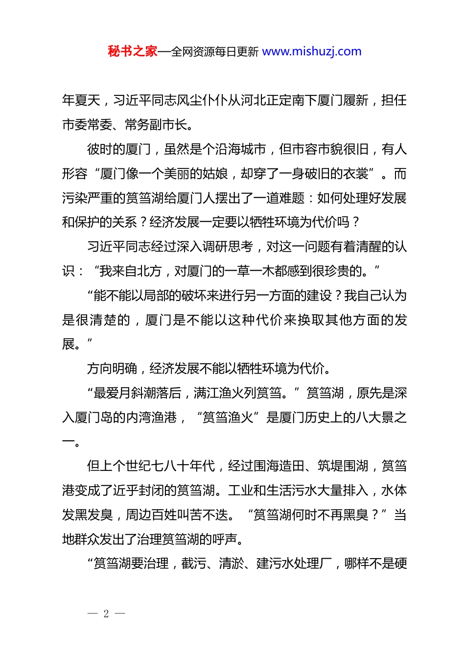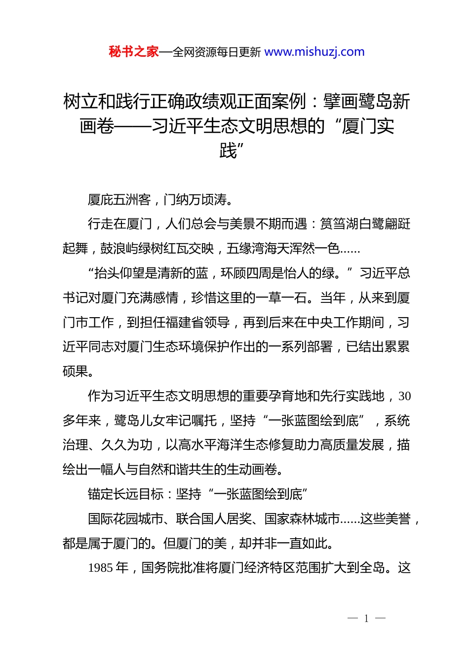 秘书之家—全网资源每日更新 www.mishuzj.com树立和践行正确政绩观正面案例:擘画鹭岛新画卷——习近平生态文明思想的“厦门实践”厦庇五洲客,门纳万顷涛。行走在厦门,人们总会与美景不期而遇:筼筜湖白鹭翩跹起舞,鼓浪屿绿树红瓦交映,五缘湾海天浑然一色……“抬头仰望是清新的蓝,环顾四周是怡人的绿。”习近平总书记对厦门充满感情,珍惜这里的一草一石。当年,从来到厦门市工作,到担任福建省领导,再到后来在中央工作期间,习近平同志对厦门生态环境保护作出的一系列部署,已结出累累硕果。作为习近平生态文明思想的重要孕育地和先行实践地,30多年来,鹭岛儿女牢记嘱托,坚持“一张蓝图绘到底”,系统治理、久久为功,以高水平海洋生态修复助力高质量发展,描绘出一幅人与自然和谐共生的生动画卷。锚定长远目标:坚持“一张蓝图绘到底”国际花园城市、联合国人居奖、国家森林城市……这些美誉,都是属于厦门的。但厦门的美,却并非一直如此。1985 年,国务院批准将厦门经济特区范围扩大到全岛。这— 1 —秘书之家—全网资源每日更新 www.mishuzj.com年夏天,习近平同志风尘仆仆从河北正定南下厦门履新,担任市委常委、常务副市长。彼时的厦门,虽然是个沿海城市,但市容市貌很旧,有人形容“厦门像一个美丽的姑娘,却穿了一身破旧的衣裳”。而污染严重的筼筜湖给厦门人摆出了一道难题:如何处理好发展和保护的关系?经济发展一定要以牺牲环境为代价吗?习近平同志经过深入调研思考,对这一问题有着清醒的认识:“我来自北方,对厦门的一草一木都感到很珍贵的。”“能不能以局部的破坏来进行另一方面的建设?我自己认为是很清楚的,厦门是不能以这种代价来换取其他方面的发展。”方向明确,经济发展不能以牺牲环境为代价。“最爱月斜潮落后,满江渔火列筼筜。”筼筜湖,原先是深入厦门岛的内湾渔港,“筼筜渔火”是厦门历史上的八大景之一。但上个世纪七八十年代,经过围海造田、筑堤围湖,筼筜港变成了近乎封闭的筼筜湖。工业和生活污水大量排入,水体发黑发臭,周边百姓叫苦不迭。“筼筜湖何时不再黑臭?”当地群众发出了治理筼筜湖的呼声。“筼筜湖要治理,截污、清淤、建污水处理厂,哪样不是硬— 2 —秘书之家—全网资源每日更新 www.mishuzj.com骨头?那时候厦门刚设立经济特区,恨不得一分钱掰成两半花,太难了!”81 岁的张益河是筼筜湖治理的亲历者之一,见证了筼筜湖从污水溢流、鱼虾绝迹到鸥鹭翔集、重现光彩的巨变。1988 年 3 月 30 日,习近平同志主持召开了一场专题会议,主题就是加强筼筜湖综合治理。在这次会上,厦门市成立了筼筜湖治理领导小组,明确了“市长亲自抓治湖”“市财政今明两年每年拨 1000 万元”,并创造性地将治湖方略总结为“依法治湖、截污处理、清淤筑岸、搞活水体、美化环境”20 字方针。“投入 1000 万元是什么概念?这相当于当时厦门一年基建投入的十分之一。”张益河感慨,“筼筜湖治理,开始动真格了!”截污处理,祛除“病根”。环湖周边工业企业全部关停、外迁,修建污水处理厂和实施环湖截污等工程,通过改造分流污水管和污水泵站以及多处排洪沟沟口,提升湖区水质。搞活水体,畅通“经脉”。技术人员因地制宜,创造出“引潮活水”技术。通过建设西堤闸门和导流堤,利用自然潮差,引西海域海水入湖,搞活水体。清淤筑岸,根治“顽疾”。污染物经年沉积,淤泥不清,水质难保障。筼筜湖开始大规模清淤,淤泥处理后筑岸,堆起— 3 —秘书之家—全网资源每日更新 www.mishuzj.com湖心岛,不仅因此改善了水质,还大大提升了防汛能力。1992 年,筼筜湖上迎来一场久违的龙舟赛。“那天,厦门市民聚集在筼筜湖两岸,不仅为比赛欢呼,更为筼筜湖的治理成效鼓掌。”张益河回忆说。30 多年来,厦门历届市委、市政府遵循习近平同志确立的工作方针,接续开展五轮筼筜湖综合整治工作,共投入资金约20 亿元。如今的筼筜湖水清岸绿、鱼翔浅底,被称为厦门的“城市会客厅”,市民和游客流连湖边,看候鸟翩跹,尽享生态之美。筼筜湖是厦门生态环境之变荡开的第一朵涟漪。从当年那次综合治理专题会议开始,36 年来,厦门...