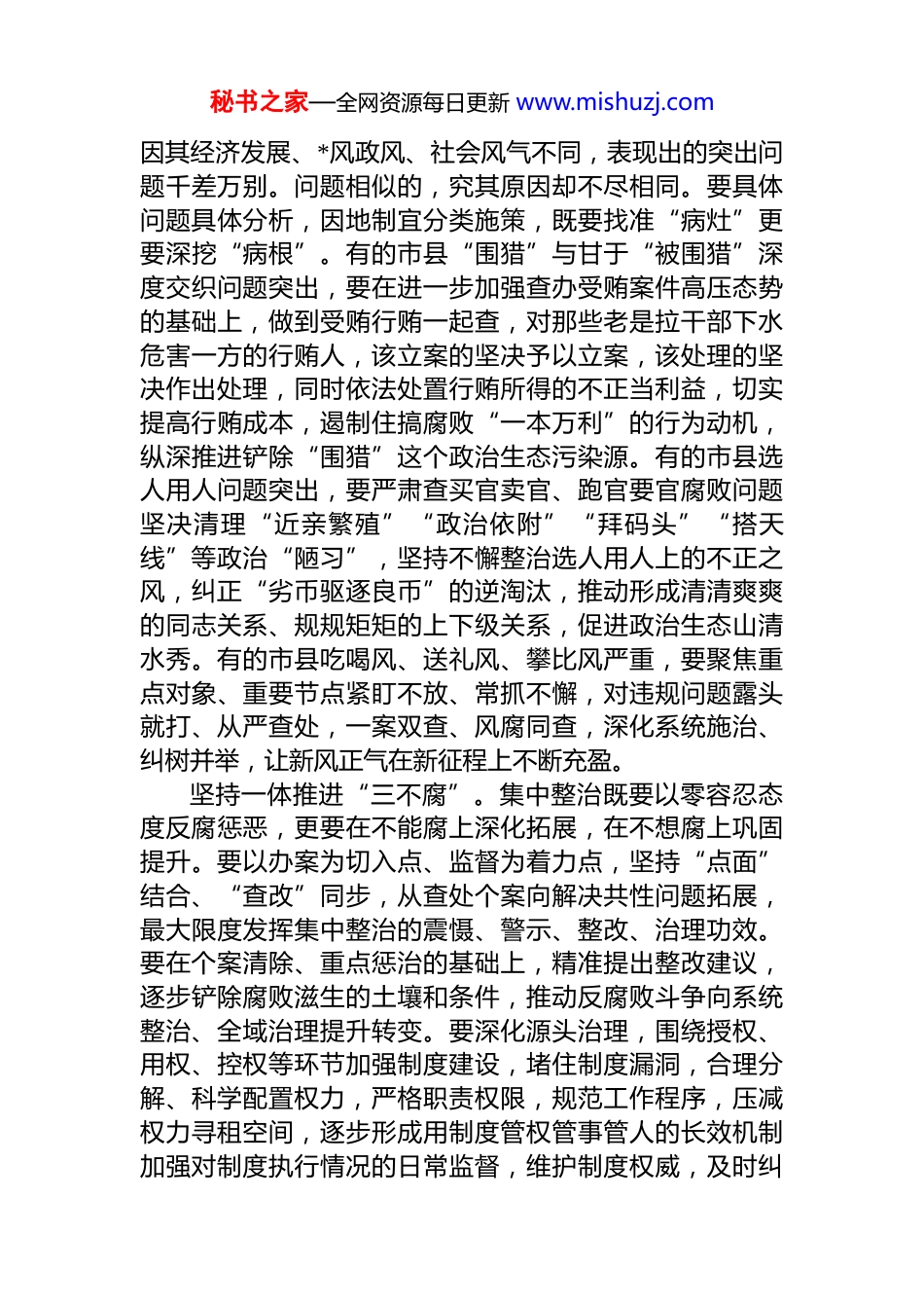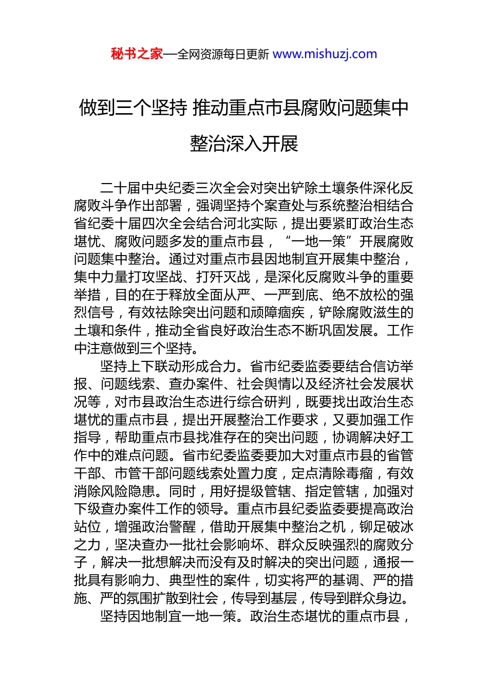 秘书之家—全网资源每日更新 www.mishuzj.com做到三个坚持 推动重点市县腐败问题集中整治深入开展二十届中央纪委三次全会对突出铲除土壤条件深化反腐败斗争作出部署,强调坚持个案查处与系统整治相结合省纪委十届四次全会结合河北实际,提出要紧盯政治生态堪忧、腐败问题多发的重点市县,“一地一策”开展腐败问题集中整治。通过对重点市县因地制宜开展集中整治,集中力量打攻坚战、打歼灭战,是深化反腐败斗争的重要举措,目的在于释放全面从严、一严到底、绝不放松的强烈信号,有效祛除突出问题和顽障痼疾,铲除腐败滋生的土壤和条件,推动全省良好政治生态不断巩固发展。工作中注意做到三个坚持。坚持上下联动形成合力。省市纪委监委要结合信访举报、问题线索、查办案件、社会舆情以及经济社会发展状况等,对市县政治生态进行综合研判,既要找出政治生态堪忧的重点市县,提出开展整治工作要求,又要加强工作指导,帮助重点市县找准存在的突出问题,协调解决好工作中的难点问题。省市纪委监委要加大对重点市县的省管干部、市管干部问题线索处置力度,定点清除毒瘤,有效消除风险隐患。同时,用好提级管辖、指定管辖,加强对下级查办案件工作的领导。重点市县纪委监委要提高政治站位,增强政治警醒,借助开展集中整治之机,铆足破冰之力,坚决查办一批社会影响坏、群众反映强烈的腐败分子,解决一批想解决而没有及时解决的突出问题,通报一批具有影响力、典型性的案件,切实将严的基调、严的措施、严的氛围扩散到社会,传导到基层,传导到群众身边。坚持因地制宜一地一策。政治生态堪忧的重点市县,秘书之家—全网资源每日更新 www.mishuzj.com因其经济发展、*风政风、社会风气不同,表现出的突出问题千差万别。问题相似的,究其原因却不尽相同。要具体问题具体分析,因地制宜分类施策,既要找准“病灶”更要深挖“病根”。有的市县“围猎”与甘于“被围猎”深度交织问题突出,要在进一步加强查办受贿案件高压态势的基础上,做到受贿行贿一起查,对那些老是拉干部下水危害一方的行贿人,该立案的坚决予以立案,该处理的坚决作出处理,同时依法处置行贿所得的不正当利益,切实提高行贿成本,遏制住搞腐败“一本万利”的行为动机,纵深推进铲除“围猎”这个政治生态污染源。有的市县选人用人问题突出,要严肃查买官卖官、跑官要官腐败问题坚决清理“近亲繁殖”“政治依附”“拜码头”“搭天线”等政治“陋习”,坚持不懈整治选人用人上的不正之风,纠正“劣币驱逐良币”的逆淘汰,推动形成清清爽爽的同志关系、规规矩矩的上下级关系,促进政治生态山清水秀。有的市县吃喝风、送礼风、攀比风严重,要聚焦重点对象、重要节点紧盯不放、常抓不懈,对违规问题露头就打、从严查处,一案双查、风腐同查,深化系统施治、纠树并举,让新风正气在新征程上不断充盈。坚持一体推进“三不腐”。集中整治既要以零容忍态度反腐惩恶,更要在不能腐上深化拓展,在不想腐上巩固提升。要以办案为切入点、监督为着力点,坚持“点面”结合、“查改”同步,从查处个案向解决共性问题拓展,最大限度发挥集中整治的震慑、警示、整改、治理功效。要在个案清除、重点惩治的基础上,精准提出整改建议,逐步铲除腐败滋生的土壤和条件,推动反腐败斗争向系统整治、全域治理提升转变。要深化源头治理,围绕授权、用权、控权等环节加强制度建设,堵住制度漏洞,合理分解、科学配置权力,严格职责权限,规范工作程序,压减权力寻租空间,逐步形成用制度管权管事管人的长效机制加强对制度执行情况的日常监督,维护制度权威,及时纠秘书之家—全网资源每日更新 www.mishuzj.com正和查处设租寻租、权力越界等问题,通过制度硬约束促进*员干部做到为民用权、依法用权、秉公用权、廉洁用权。加强廉洁从政教育,把*章*规 dj 教育作为各级*组织理论学习中心组和干部教育培训的必修课,促进*员干部增强纪律意识。加大警示教育力度,以案明纪、以案释法,深化运用违纪违法干部忏悔录和典型案例,促进*员干部受警醒、明底线、知敬畏。深化以案为鉴、以案促改促治。将深化以案促改作为集中整治的规定动作,以做好“整篇文...
