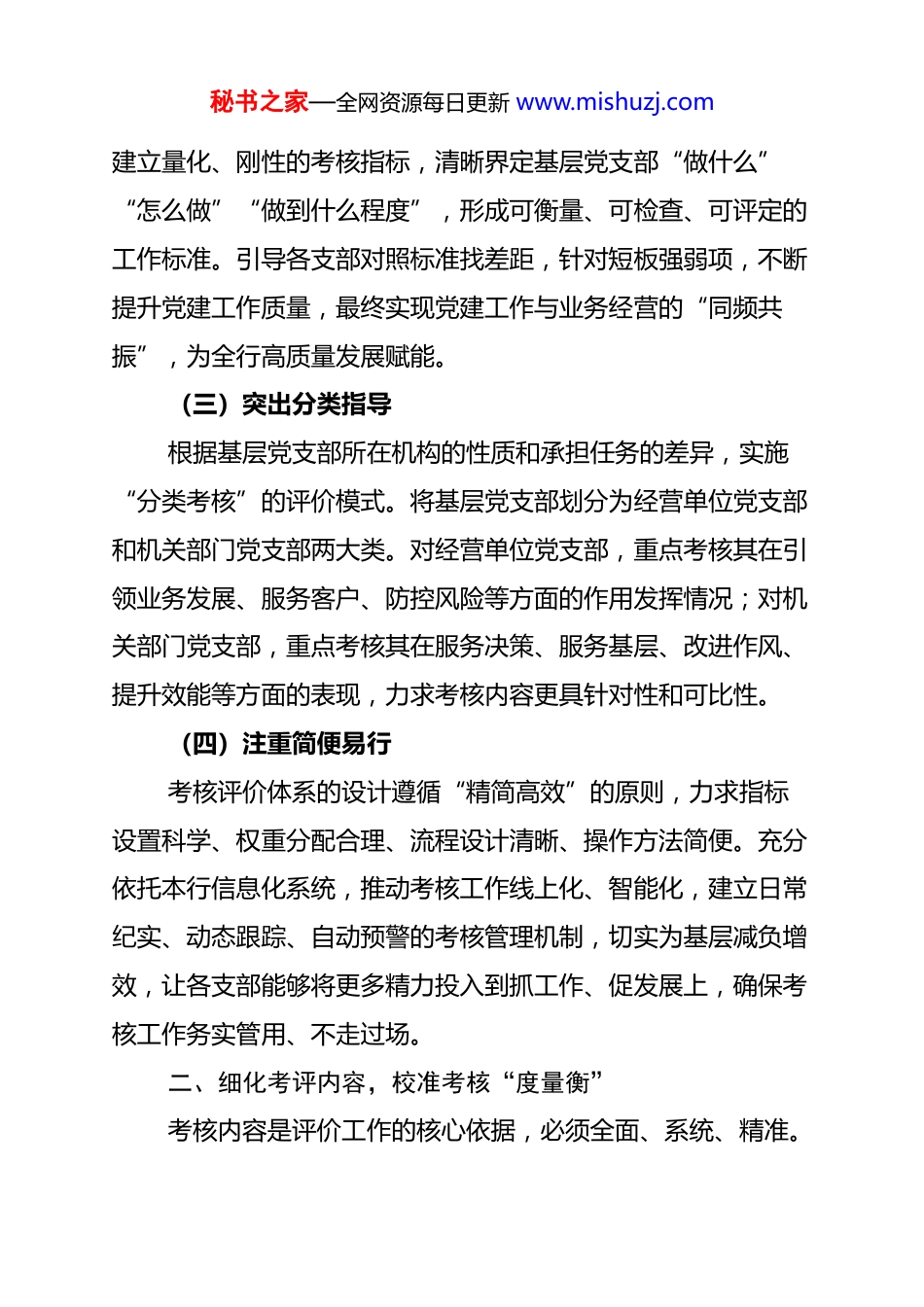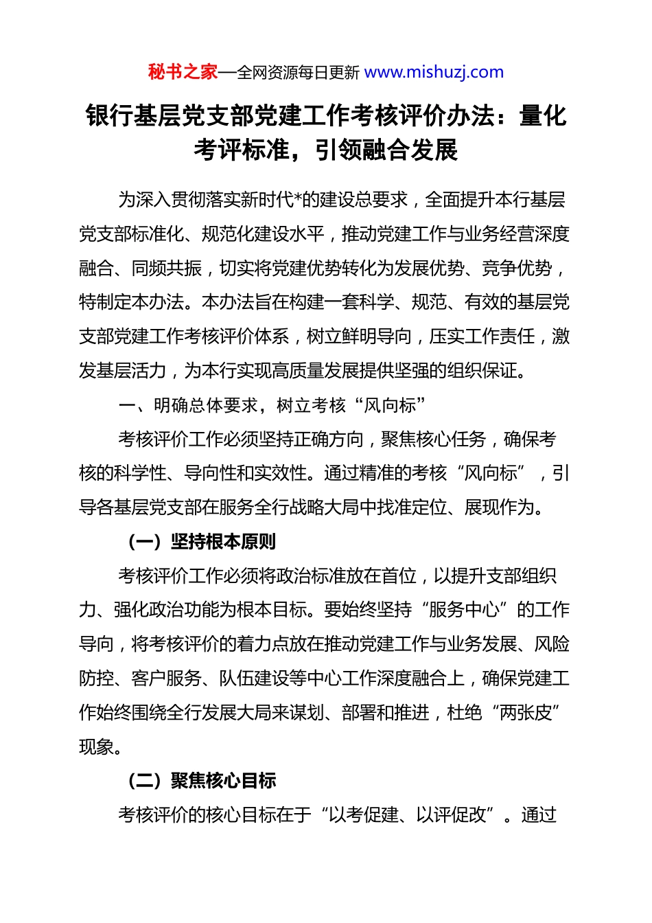 秘书之家—全网资源每日更新 www.mishuzj.com银行基层党支部党建工作考核评价办法:量化考评标准,引领融合发展为深入贯彻落实新时代*的建设总要求,全面提升本行基层党支部标准化、规范化建设水平,推动党建工作与业务经营深度融合、同频共振,切实将党建优势转化为发展优势、竞争优势,特制定本办法。本办法旨在构建一套科学、规范、有效的基层党支部党建工作考核评价体系,树立鲜明导向,压实工作责任,激发基层活力,为本行实现高质量发展提供坚强的组织保证。一、明确总体要求,树立考核“风向标”考核评价工作必须坚持正确方向,聚焦核心任务,确保考核的科学性、导向性和实效性。通过精准的考核“风向标”,引导各基层党支部在服务全行战略大局中找准定位、展现作为。(一)坚持根本原则考核评价工作必须将政治标准放在首位,以提升支部组织力、强化政治功能为根本目标。要始终坚持“服务中心”的工作导向,将考核评价的着力点放在推动党建工作与业务发展、风险防控、客户服务、队伍建设等中心工作深度融合上,确保党建工作始终围绕全行发展大局来谋划、部署和推进,杜绝“两张皮”现象。(二)聚焦核心目标考核评价的核心目标在于“以考促建、以评促改”。通过秘书之家—全网资源每日更新 www.mishuzj.com建立量化、刚性的考核指标,清晰界定基层党支部“做什么”“怎么做”“做到什么程度”,形成可衡量、可检查、可评定的工作标准。引导各支部对照标准找差距,针对短板强弱项,不断提升党建工作质量,最终实现党建工作与业务经营的“同频共振”,为全行高质量发展赋能。(三)突出分类指导根据基层党支部所在机构的性质和承担任务的差异,实施“分类考核”的评价模式。将基层党支部划分为经营单位党支部和机关部门党支部两大类。对经营单位党支部,重点考核其在引领业务发展、服务客户、防控风险等方面的作用发挥情况;对机关部门党支部,重点考核其在服务决策、服务基层、改进作风、提升效能等方面的表现,力求考核内容更具针对性和可比性。(四)注重简便易行考核评价体系的设计遵循“精简高效”的原则,力求指标设置科学、权重分配合理、流程设计清晰、操作方法简便。充分依托本行信息化系统,推动考核工作线上化、智能化,建立日常纪实、动态跟踪、自动预警的考核管理机制,切实为基层减负增效,让各支部能够将更多精力投入到抓工作、促发展上,确保考核工作务实管用、不走过场。二、细化考评内容,校准考核“度量衡”考核内容是评价工作的核心依据,必须全面、系统、精准。秘书之家—全网资源每日更新 www.mishuzj.com本办法设置“政治建设、组织建设、队伍建设、融合发展”四大一级指标,构成科学精准的考核“度量衡”。考核总分设置为100 分,并设置加分项和减分项。(一)突出政治建设“引领力”(xx 分)重点考核党支部在强化政治引领方面的实际成效。一是看理论学习是否扎实,是否严格落实“第一议题”制度,定期组织*员学习*的创新理论,引导*员深刻领悟“两个确立”的决定性意义。二是看决策部署是否贯通,能否不折不扣地贯彻执行上级*委的各项决策部署,确保全行战略在基层有效落地。三是看思想引导是否有力,能否及时掌握*员思想动态,做好思想政治工作,营造积极向上的良好氛围。(二)夯实组织建设“支撑力”(xx 分)重点考核党支部标准化、规范化建设水平。一是看组织生活是否严格,是否按规定频次和质量要求,认真落实“三会一课”、主题*日、组织生活会、民主评议*员等制度。二是看支部班子是否建强,支委班子结构是否健全,工作职责是否明确,整体功能是否有效发挥。三是看*员发展管理是否规范,能否严格按照程序做好*员发展、教育、监督和管理工作,*费收缴是否及时足额。(三)彰显队伍建设“战斗力”(xx 分)重点考核*员队伍在日常工作中的先锋模范作用。一是看*秘书之家—全网资源每日更新 www.mishuzj.com员身份是否“亮出来”,是否通过设立*员示范岗、*员责任区等方式,引导*员在关键岗位、重点任务中主动担当作为。二是看先锋作用是否“看出来”,考核*员在存款营销、贷款投放、风险化解、服务提升等中心工作中的业绩贡献和表率作...