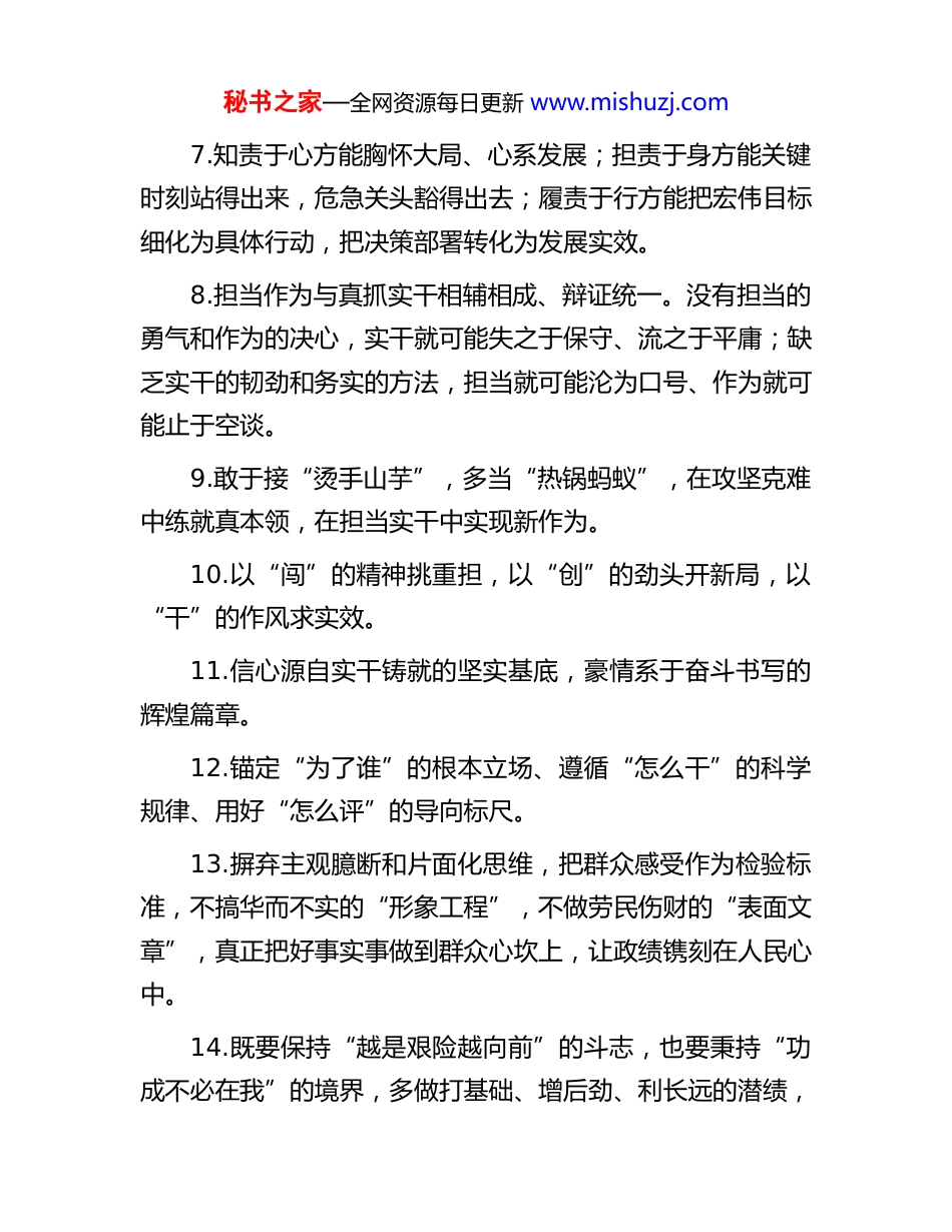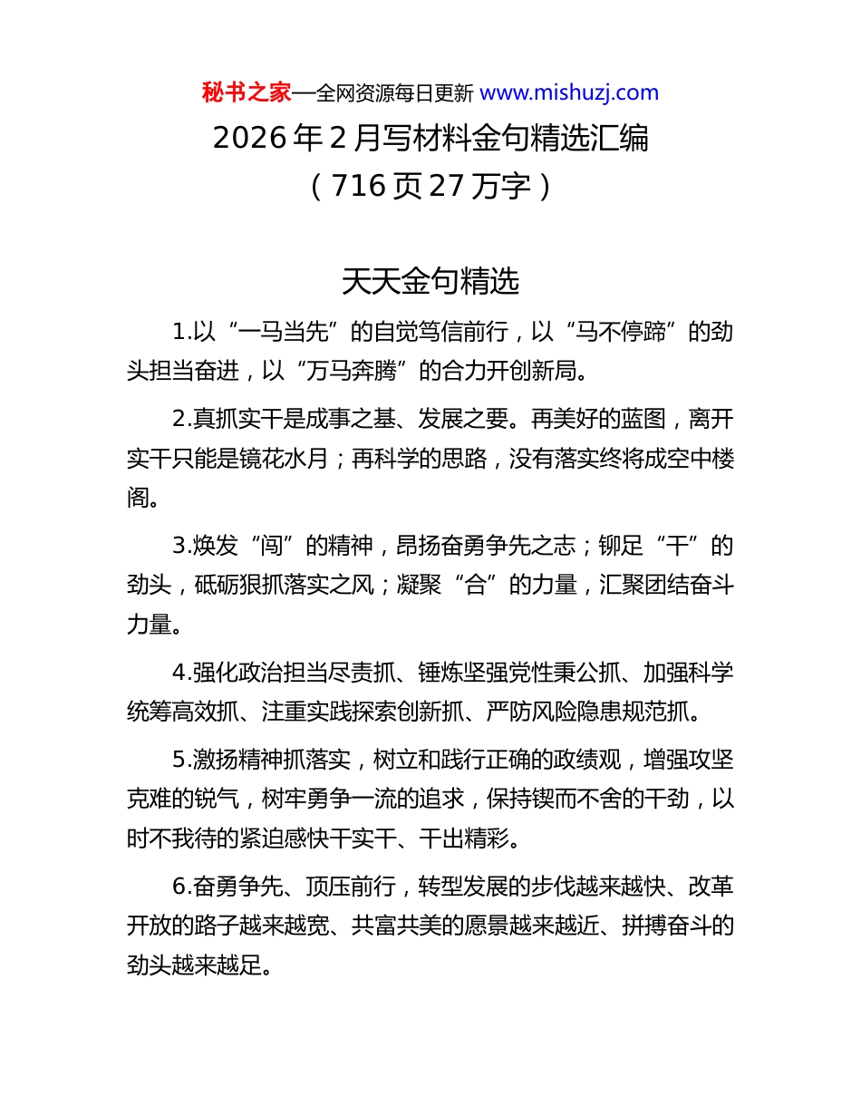 秘书之家—全网资源每日更新 www.mishuzj.com2026 年 2 月写材料金句精选汇编(716 页 27 万字)天天金句精选1.以“一马当先”的自觉笃信前行,以“马不停蹄”的劲头担当奋进,以“万马奔腾”的合力开创新局。2.真抓实干是成事之基、发展之要。再美好的蓝图,离开实干只能是镜花水月;再科学的思路,没有落实终将成空中楼阁。3.焕发“闯”的精神,昂扬奋勇争先之志;铆足“干”的劲头,砥砺狠抓落实之风;凝聚“合”的力量,汇聚团结奋斗力量。4.强化政治担当尽责抓、锤炼坚强党性秉公抓、加强科学统筹高效抓、注重实践探索创新抓、严防风险隐患规范抓。5.激扬精神抓落实,树立和践行正确的政绩观,增强攻坚克难的锐气,树牢勇争一流的追求,保持锲而不舍的干劲,以时不我待的紧迫感快干实干、干出精彩。6.奋勇争先、顶压前行,转型发展的步伐越来越快、改革开放的路子越来越宽、共富共美的愿景越来越近、拼搏奋斗的劲头越来越足。秘书之家—全网资源每日更新 www.mishuzj.com7.知责于心方能胸怀大局、心系发展;担责于身方能关键时刻站得出来,危急关头豁得出去;履责于行方能把宏伟目标细化为具体行动,把决策部署转化为发展实效。8.担当作为与真抓实干相辅相成、辩证统一。没有担当的勇气和作为的决心,实干就可能失之于保守、流之于平庸;缺乏实干的韧劲和务实的方法,担当就可能沦为口号、作为就可能止于空谈。9.敢于接“烫手山芋”,多当“热锅蚂蚁”,在攻坚克难中练就真本领,在担当实干中实现新作为。10.以“闯”的精神挑重担,以“创”的劲头开新局,以“干”的作风求实效。11.信心源自实干铸就的坚实基底,豪情系于奋斗书写的辉煌篇章。12.锚定“为了谁”的根本立场、遵循“怎么干”的科学规律、用好“怎么评”的导向标尺。13.摒弃主观臆断和片面化思维,把群众感受作为检验标准,不搞华而不实的“形象工程”,不做劳民伤财的“表面文章”,真正把好事实事做到群众心坎上,让政绩镌刻在人民心中。14.既要保持“越是艰险越向前”的斗志,也要秉持“功成不必在我”的境界,多做打基础、增后劲、利长远的潜绩,秘书之家—全网资源每日更新 www.mishuzj.com以钉钉子精神一茬接着一茬干。15.提高政治素养,学会“关起门来当书记”,跳出一域看大局,努力在干好琐碎事务的过程中沉淀积累、提高素养,形成独到的认识见解、科学的思维方式、正确的价值取向。16.提升“身在兵位、胸为帅谋”境界和格局,把思维放宽、目光放远、格局放大,正确认识组织需要和个人成长之间的关系,乐于为他人的成功喝彩,始终向优秀的干部看齐,营造比学赶超的良好氛围,树牢“出成绩才能出干部”的鲜明导向。17.坚守底线,时刻铭记“当官发财两条道,当官就不要发财,发财就不要当官”的谆谆告诫,牢记“权不能变成利、公私必须分明”。18.吃透支持政策,保持战略上的敏锐性,提升战术上的敏捷度,用足用好政策工具包,努力把政策红利转化为发展红利。19.把准正确方向、持续筑牢对党忠诚“定盘星”,聚焦中心大局、持续奏响服务发展“主旋律”,坚守人民立场、持续搭好为民服务“连心桥”,广泛凝聚力量、持续画好团结奋进“同心圆”。20.坚定书写一心向党的政治答卷,认真书写务实担当的履职答卷,合力书写同舟共济的团结答卷,潜心书写活力迸发秘书之家—全网资源每日更新 www.mishuzj.com的创新答卷。21.以更高站位锤炼过硬品质,以更高追求淬炼过硬品格,以更高标准修炼过硬本领,以更高要求磨炼过硬作风。22.守牢安全发展底线,学会“端着一盆水走路”,处理好“油门”和“刹车”的关系,有效防范化解各领域风险隐患。23.压紧压实责任,强化担当作为抓落实、强化创先争优抓落实、强化宣传引导抓落实。24.敢于强者比试,敢向第一挑战,纵向创纪录,横向争先进,做到出手的工作是最高水平,办成的事情是最高标准,自己的修养是最高品味,个人的品格是最高魅力,勇于挑战自我、超越自我,树立一流的境界,坚持一流的水准,争创一流的业绩。25.承担的任务越来越重,负责的事情越来越多,工作的领域越来越宽,肩上的责任也越来越大。26.干部在压力中得到锻炼、意志在压力中经受考验、境...