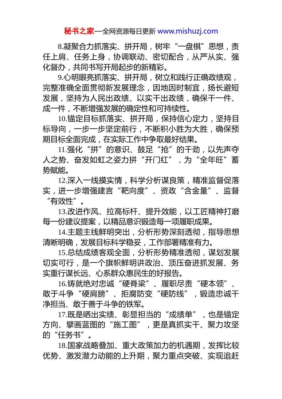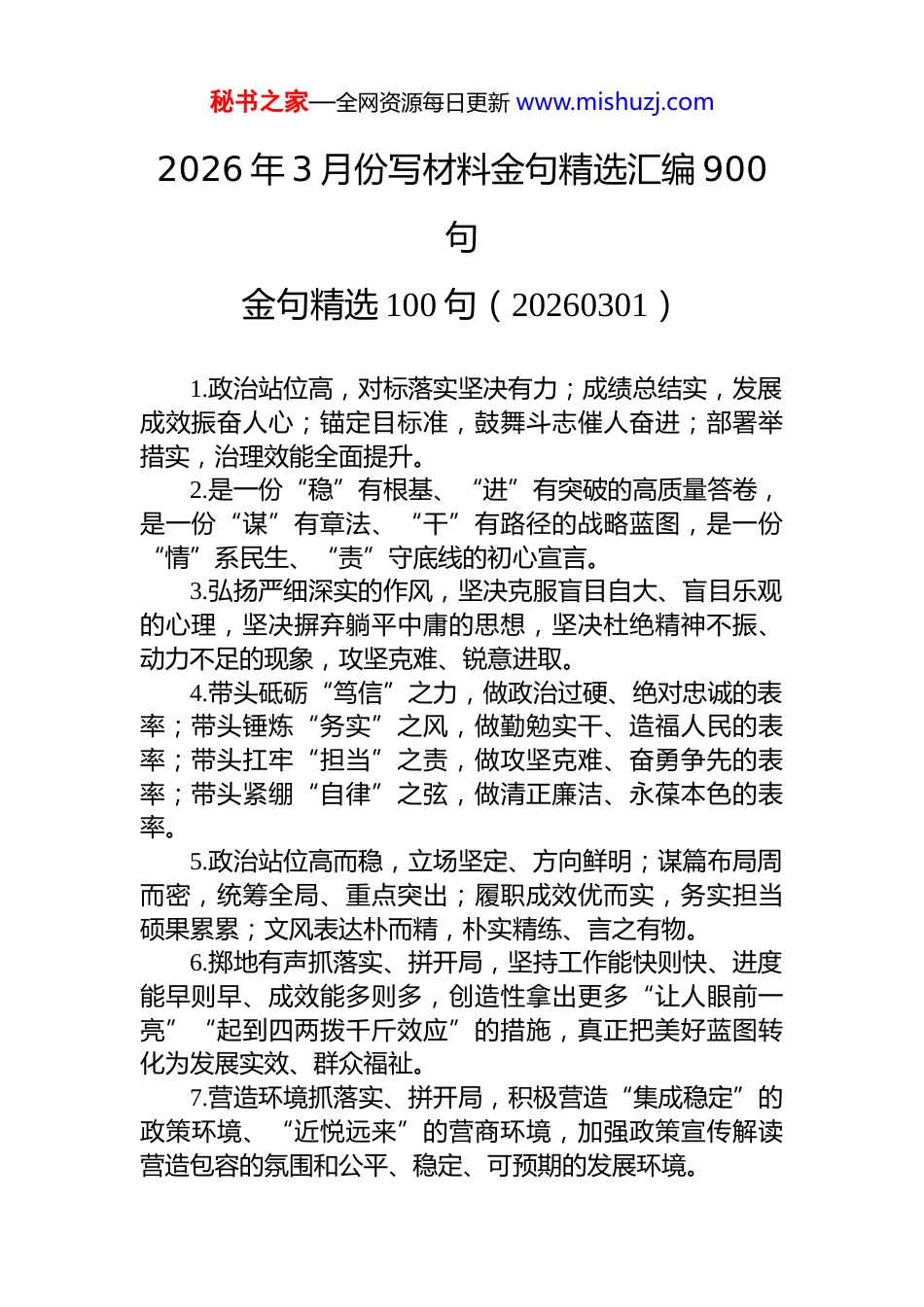 秘书之家—全网资源每日更新 www.mishuzj.com2026 年 3 月份写材料金句精选汇编 900句金句精选 100 句(20260301)1.政治站位高,对标落实坚决有力;成绩总结实,发展成效振奋人心;锚定目标准,鼓舞斗志催人奋进;部署举措实,治理效能全面提升。2.是一份“稳”有根基、“进”有突破的高质量答卷,是一份“谋”有章法、“干”有路径的战略蓝图,是一份“情”系民生、“责”守底线的初心宣言。3.弘扬严细深实的作风,坚决克服盲目自大、盲目乐观的心理,坚决摒弃躺平中庸的思想,坚决杜绝精神不振、动力不足的现象,攻坚克难、锐意进取。4.带头砥砺“笃信”之力,做政治过硬、绝对忠诚的表率;带头锤炼“务实”之风,做勤勉实干、造福人民的表率;带头扛牢“担当”之责,做攻坚克难、奋勇争先的表率;带头紧绷“自律”之弦,做清正廉洁、永葆本色的表率。5.政治站位高而稳,立场坚定、方向鲜明;谋篇布局周而密,统筹全局、重点突出;履职成效优而实,务实担当硕果累累;文风表达朴而精,朴实精练、言之有物。6.掷地有声抓落实、拼开局,坚持工作能快则快、进度能早则早、成效能多则多,创造性拿出更多“让人眼前一亮”“起到四两拨千斤效应”的措施,真正把美好蓝图转化为发展实效、群众福祉。7.营造环境抓落实、拼开局,积极营造“集成稳定”的政策环境、“近悦远来”的营商环境,加强政策宣传解读营造包容的氛围和公平、稳定、可预期的发展环境。秘书之家—全网资源每日更新 www.mishuzj.com8.凝聚合力抓落实、拼开局,树牢“一盘棋”思想,责任上肩、任务上身,协调联动、密切配合,从严从实、强化督办,共同书写开局起步的新精彩。9.心明眼亮抓落实、拼开局,树立和践行正确政绩观,完整准确全面贯彻新发展理念,因地因时制宜,扬长避短发展,坚持为人民出政绩、以实干出政绩,确保干一件、成一件,不断增强发展的确定性和可持续性。10.锚定目标抓落实、拼开局,保持信心定力,坚持目标导向,一步一步坚定前行,不断积小胜为大胜,确保预期目标全面完成,在实际工作中争取最好结果。11.强化“拼”的意识、鼓足“抢”的干劲,以先声夺人之势、奋发如虹之姿力拼“开门红”,为“全年旺”蓄势赋能。12.深入一线摸实情,科学分析谋良策,精准监督促落实,进一步增强建言“靶向度”、资政“含金量”、监督“有效性”。13.改进作风、拉高标杆、提升效能,以工匠精神打磨每一份建议提案,以精品意识锻造每一项履职成果。14.主题主线鲜明突出,分析形势深刻透彻,指导思想清晰明确,发展目标科学稳妥,工作部署精准有力。15.总结成绩客观全面,分析形势精准透彻,谋划发展切实可行,是一个旗帜鲜明讲政治、顶压奋进抓发展、务实重行谋长远、心系群众惠民生的好报告。16.铸就绝对忠诚“硬脊梁”、履职尽责“硬本领”、敢于斗争“硬肩膀”、拒腐防变“硬防线”,锻造忠诚干净担当、敢于善于斗争的铁军。17.既是晒出实绩、彰显担当的“成绩单”,也是锚定方向、擘画蓝图的“施工图”,更是真抓实干、聚力攻坚的“任务书”。18.国家战略叠加、重大政策加力的机遇期,发挥比较优势、激发潜力动能的上升期,聚力重点突破、实现追赶秘书之家—全网资源每日更新 www.mishuzj.com进位的窗口期。19.树立和践行正确政绩观,辩证看待“显绩”与“潜绩”,一切从实际出发,一张蓝图绘到底,以“功成不必在我”的境界和“功成必定有我”的担当狠抓落实、推动发展、造福群众。20.以绝对忠诚的政治担当、奋勇争先的进取精神、敢闯敢试的创新之举、远谋近施的系统思维,在生态文明引领高质量发展上迈出坚实步伐,呈现出稳中有进、量质齐升、动力强劲的良好势头。21.为人民出政绩、以实干出政绩的政治立场,坚持稳中求进、聚力攻坚克难的政治担当,增强大局观、提高执行力的政治自觉。22.以高质量立法引领改革发展、以高效能监督推动工作落实、以高水平代表工作汇聚民智。23.在“标本兼治”上深耕细作,既要重视制度执行的“形”,更要涵养文化浸润的“神”,推动法治与德治相结合,有效化解社会治理矛盾、提升基层治理效能。24.以上率下扛牢政治责任,刀刃向内深化自我革命,以身作则弘扬新风...