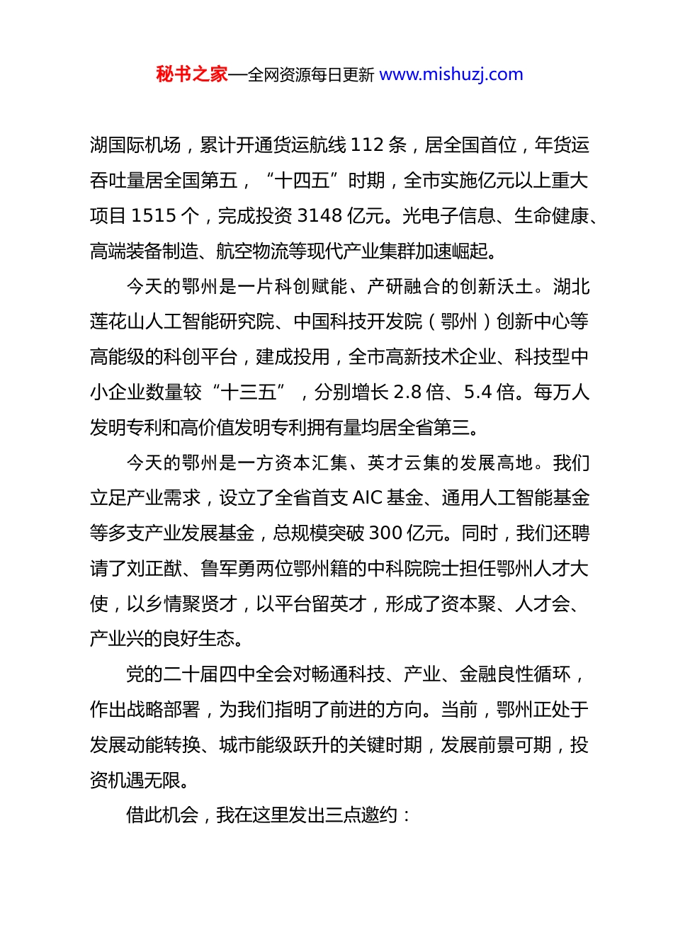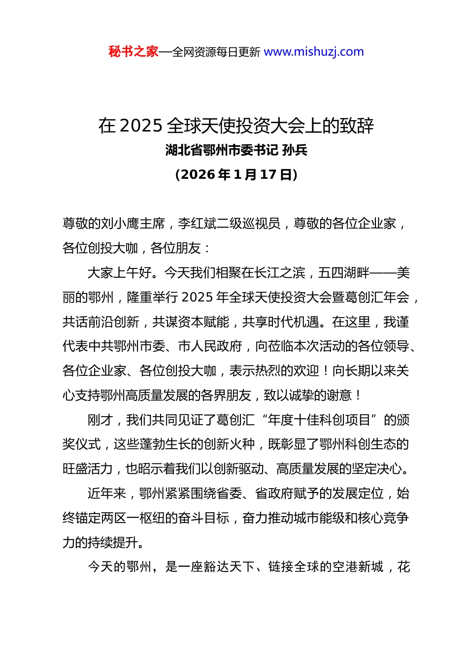 秘书之家—全网资源每日更新 www.mishuzj.com在 2025 全球天使投资大会上的致辞湖北省鄂州市委书记 孙兵(2026 年 1 月 17 日)尊敬的刘小鹰主席,李红斌二级巡视员,尊敬的各位企业家,各位创投大咖,各位朋友:大家上午好。今天我们相聚在长江之滨,五四湖畔——美丽的鄂州,隆重举行 2025 年全球天使投资大会暨葛创汇年会,共话前沿创新,共谋资本赋能,共享时代机遇。在这里,我谨代表中共鄂州市委、市人民政府,向莅临本次活动的各位领导、各位企业家、各位创投大咖,表示热烈的欢迎!向长期以来关心支持鄂州高质量发展的各界朋友,致以诚挚的谢意!刚才,我们共同见证了葛创汇“年度十佳科创项目”的颁奖仪式,这些蓬勃生长的创新火种,既彰显了鄂州科创生态的旺盛活力,也昭示着我们以创新驱动、高质量发展的坚定决心。近年来,鄂州紧紧围绕省委、省政府赋予的发展定位,始终锚定两区一枢纽的奋斗目标,奋力推动城市能级和核心竞争力的持续提升。今天的鄂州,是一座豁达天下、链接全球的空港新城,花秘书之家—全网资源每日更新 www.mishuzj.com湖国际机场,累计开通货运航线 112 条,居全国首位,年货运吞吐量居全国第五,“十四五”时期,全市实施亿元以上重大项目 1515 个,完成投资 3148 亿元。光电子信息、生命健康、高端装备制造、航空物流等现代产业集群加速崛起。今天的鄂州是一片科创赋能、产研融合的创新沃土。湖北莲花山人工智能研究院、中国科技开发院(鄂州)创新中心等高能级的科创平台,建成投用,全市高新技术企业、科技型中小企业数量较“十三五”,分别增长 2.8 倍、5.4 倍。每万人发明专利和高价值发明专利拥有量均居全省第三。今天的鄂州是一方资本汇集、英才云集的发展高地。我们立足产业需求,设立了全省首支 AIC 基金、通用人工智能基金等多支产业发展基金,总规模突破 300 亿元。同时,我们还聘请了刘正猷、鲁军勇两位鄂州籍的中科院院士担任鄂州人才大使,以乡情聚贤才,以平台留英才,形成了资本聚、人才会、产业兴的良好生态。党的二十届四中全会对畅通科技、产业、金融良性循环,作出战略部署,为我们指明了前进的方向。当前,鄂州正处于发展动能转换、城市能级跃升的关键时期,发展前景可期,投资机遇无限。借此机会,我在这里发出三点邀约:秘书之家—全网资源每日更新 www.mishuzj.com诚邀大家做鄂州创新最先一公里的同行者。希望各位投资人将目光更多投向鄂州的科创实验室、产业孵化器,敏锐捕捉前沿技术的星星之火,勇于成为初创企业的天使投资人。我们也将着力的优化“募投管退”,全链条服务,坚定支持投早投小投硬科技,让每一颗创新的种子都能在鄂州破土萌发。诚邀大家做鄂州产业攀登进阶的助力者。希望各位投资人不仅注入资金活水,更为鄂州的企业带来先进理念、管理经验和市场渠道。我们也将围绕光电子信息、智能制造、生物医药等产业链,紧盯人工智能,低空经济等新赛道,与大家深化技术共研、市场共拓、产能共链,携手提升鄂州产业链的韧性与竞争力。诚邀大家做鄂州未来长期价值的投资者。希望各位投资人深度参与鄂州两区一枢纽建成建设,成为投资未来的城市合伙人,共同书写鄂州“十五五”高质量发展的新篇章,为湖北推动支点建设取得决定性进展,作出新的更大的贡献。我们也将以稳定、可持续的政策环境为资本前瞻布局,保驾护航,让每一份远见和坚守都能够在这里收获满满。最后,预祝本次大会取得圆满成功,祝各位嘉宾身体健康工作顺利,事业兴旺,马年大吉,谢谢大家。