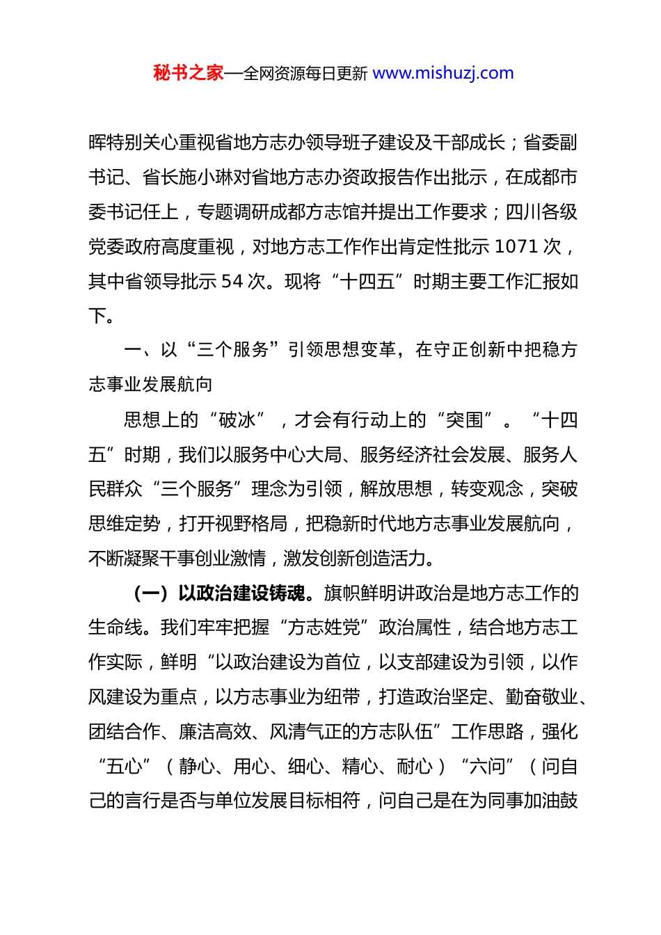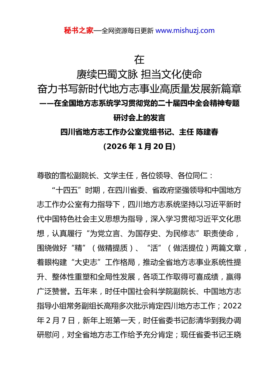 秘书之家—全网资源每日更新 www.mishuzj.com在赓续巴蜀文脉 担当文化使命奋力书写新时代地方志事业高质量发展新篇章——在全国地方志系统学习贯彻党的二十届四中全会精神专题研讨会上的发言四川省地方志工作办公室党组书记、主任 陈建春(2026 年 1 月 20 日)尊敬的雪松副院长、文学主任,各位领导、各位同仁:“十四五”时期,在四川省委、省政府坚强领导和中国地方志工作办公室有力指导下,四川地方志系统坚持以习近平新时代中国特色社会主义思想为指导,深入学习贯彻习近平文化思想,认真履行“为党立言、为国存史、为民修志”职责使命,围绕做好“精”(做精提质)、“活”(做活提位)两篇文章,着眼构建“大史志”工作格局,推动全省地方志事业系统性提升、整体性重塑和全局性发展,各项工作取得可喜成绩,赢得广泛赞誉。五年来,时任中国社会科学院副院长、中国地方志指导小组常务副组长高翔多次批示肯定四川地方志工作;2022年 2 月 7 日,新年上班第一天,时任省委书记彭清华到我办调研慰问,对全省地方志工作给予充分肯定;现任省委书记王晓秘书之家—全网资源每日更新 www.mishuzj.com晖特别关心重视省地方志办领导班子建设及干部成长;省委副书记、省长施小琳对省地方志办资政报告作出批示,在成都市委书记任上,专题调研成都方志馆并提出工作要求;四川各级党委政府高度重视,对地方志工作作出肯定性批示 1071 次,其中省领导批示 54 次。现将“十四五”时期主要工作汇报如下。一、以“三个服务”引领思想变革,在守正创新中把稳方志事业发展航向思想上的“破冰”,才会有行动上的“突围”。“十四五”时期,我们以服务中心大局、服务经济社会发展、服务人民群众“三个服务”理念为引领,解放思想,转变观念,突破思维定势,打开视野格局,把稳新时代地方志事业发展航向,不断凝聚干事创业激情,激发创新创造活力。(一)以政治建设铸魂。旗帜鲜明讲政治是地方志工作的生命线。我们牢牢把握“方志姓党”政治属性,结合地方志工作实际,鲜明“以政治建设为首位,以支部建设为引领,以作风建设为重点,以方志事业为纽带,打造政治坚定、勤奋敬业、团结合作、廉洁高效、风清气正的方志队伍”工作思路,强化“五心”(静心、用心、细心、精心、耐心)“六问”(问自己的言行是否与单位发展目标相符,问自己是在为同事加油鼓秘书之家—全网资源每日更新 www.mishuzj.com劲还是扎针泄气,问自己是在积极出谋划策还是袖手旁观,问自己工作是积极作为还是消极被动,问自己是乐于担负重任还是推诿塞责,问自己负责的工作是否是自己最高能力水平的体现)“七要”(要谨小节、要慎交友、要戒贪欲、要知敬畏、要多谋事、要懂感恩、要明是非)作风要求,教育引导党员、干部深刻领悟“两个确立”的决定性意义,增强“四个意识”、坚定“四个自信”、做到“两个维护”,自觉在思想上政治上行动上同以习近平同志为核心的党中央保持高度一致。(二)以理念变革破冰。理念革新是地方志事业高质量发展的动力源泉。面对长期以来形成的“闭门修志”“一本书主义”等惯性思维,我们坚持思想打头、理念先行,鲜明提出服务中心大局、服务经济社会发展、服务人民群众“三个服务”工作理念。“观念一变天地宽”。立足地方志“三个服务”理念的导向定位,我们先后提出“志鉴编纂是立业之基,开发利用、宣传弘扬是兴业之本”,强调“地方志部门是中华优秀传统文化传承部门”“地方志部门是典型的意识形态部门”“地方志工作者是历史文化守护者,传统文化、红色文化传播者,民族文化、本土文化挖掘者”,推动全省地方志工作由“一本书主义”向“十业并举”全面跃升,逐步形成并不断完善以一个目标(高质量发展)、两个理念(“三个服务”和开放合作秘书之家—全网资源每日更新 www.mishuzj.com理念)、三个重点(修志编鉴、宣传弘扬、资政辅治)、四个建设(质量体系建设、核心品牌建设、史志阵地建设、干部队伍建设)为主体内容的“1234”工作思路和规划体系,探索出一条具有方志特点、四川特色、时代特质的地方志事业高质量发展“四川路径”。(三)以开放合作聚力。开放合...