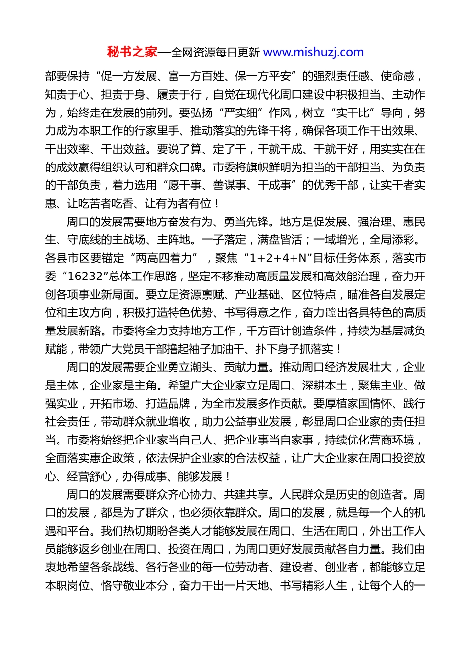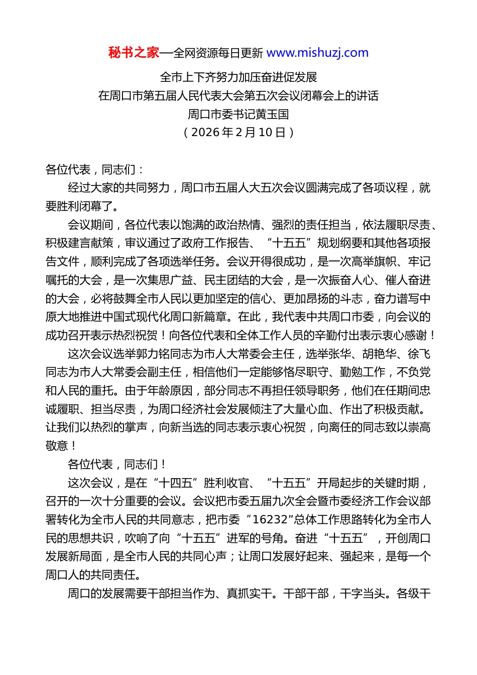 秘书之家—全网资源每日更新 www.mishuzj.com全市上下齐努力加压奋进促发展在周口市第五届人民代表大会第五次会议闭幕会上的讲话周口市委书记黄玉国(2026 年 2 月 10 日)各位代表,同志们:经过大家的共同努力,周口市五届人大五次会议圆满完成了各项议程,就要胜利闭幕了。会议期间,各位代表以饱满的政治热情、强烈的责任担当,依法履职尽责、积极建言献策,审议通过了政府工作报告、“十五五”规划纲要和其他各项报告文件,顺利完成了各项选举任务。会议开得很成功,是一次高举旗帜、牢记嘱托的大会,是一次集思广益、民主团结的大会,是一次振奋人心、催人奋进的大会,必将鼓舞全市人民以更加坚定的信心、更加昂扬的斗志,奋力谱写中原大地推进中国式现代化周口新篇章。在此,我代表中共周口市委,向会议的成功召开表示热烈祝贺!向各位代表和全体工作人员的辛勤付出表示衷心感谢!这次会议选举郭力铭同志为市人大常委会主任,选举张华、胡艳华、徐飞同志为市人大常委会副主任,相信他们一定能够恪尽职守、勤勉工作,不负党和人民的重托。由于年龄原因,部分同志不再担任领导职务,他们在任期间忠诚履职、担当尽责,为周口经济社会发展倾注了大量心血、作出了积极贡献。让我们以热烈的掌声,向新当选的同志表示衷心祝贺,向离任的同志致以崇高敬意!各位代表,同志们!这次会议,是在“十四五”胜利收官、“十五五”开局起步的关键时期,召开的一次十分重要的会议。会议把市委五届九次全会暨市委经济工作会议部署转化为全市人民的共同意志,把市委“16232”总体工作思路转化为全市人民的思想共识,吹响了向“十五五”进军的号角。奋进“十五五”,开创周口发展新局面,是全市人民的共同心声;让周口发展好起来、强起来,是每一个周口人的共同责任。周口的发展需要干部担当作为、真抓实干。干部干部,干字当头。各级干秘书之家—全网资源每日更新 www.mishuzj.com部要保持“促一方发展、富一方百姓、保一方平安”的强烈责任感、使命感,知责于心、担责于身、履责于行,自觉在现代化周口建设中积极担当、主动作为,始终走在发展的前列。要弘扬“严实细”作风,树立“实干比”导向,努力成为本职工作的行家里手、推动落实的先锋干将,确保各项工作干出效果、干出效率、干出效益。要说了算、定了干,干就干成、干就干好,用实实在在的成效赢得组织认可和群众口碑。市委将旗帜鲜明为担当的干部担当、为负责的干部负责,着力选用“愿干事、善谋事、干成事”的优秀干部,让实干者实惠、让吃苦者吃香、让有为者有位!周口的发展需要地方奋发有为、勇当先锋。地方是促发展、强治理、惠民生、守底线的主战场、主阵地。一子落定,满盘皆活;一域增光,全局添彩。各县市区要锚定“两高四着力”,聚焦“1+2+4+N”目标任务体系,落实市委“16232”总体工作思路,坚定不移推动高质量发展和高效能治理,奋力开创各项事业新局面。要立足资源禀赋、产业基础、区位特点,瞄准各自发展定位和主攻方向,积极打造特色优势、书写得意之作,奋力蹚出各具特色的高质量发展新路。市委将全力支持地方工作,千方百计创造条件,持续为基层减负赋能,带领广大党员干部撸起袖子加油干、扑下身子抓落实!周口的发展需要企业勇立潮头、贡献力量。推动周口经济发展壮大,企业是主体,企业家是主角。希望广大企业家立足周口、深耕本土,聚焦主业、做强实业,开拓市场、打造品牌,为全市发展多作贡献。要厚植家国情怀、践行社会责任,带动群众就业增收,助力公益事业发展,彰显周口企业家的责任担当。市委将始终把企业家当自己人、把企业事当自家事,持续优化营商环境,全面落实惠企政策,依法保护企业家的合法权益,让广大企业家在周口投资放心、经营舒心,办得成事、能够发展!周口的发展需要群众齐心协力、共建共享。人民群众是历史的创造者。周口的发展,都是为了群众,也必须依靠群众。周口的发展,就是每一个人的机遇和平台。我们热切期盼各类人才能够发展在周口、生活在周口,外出工作人员能够返乡创业在周口、投资在周口,为周口更好发展贡献各自力量。我们由衷地希望各条战线、各行各业的每一位劳...