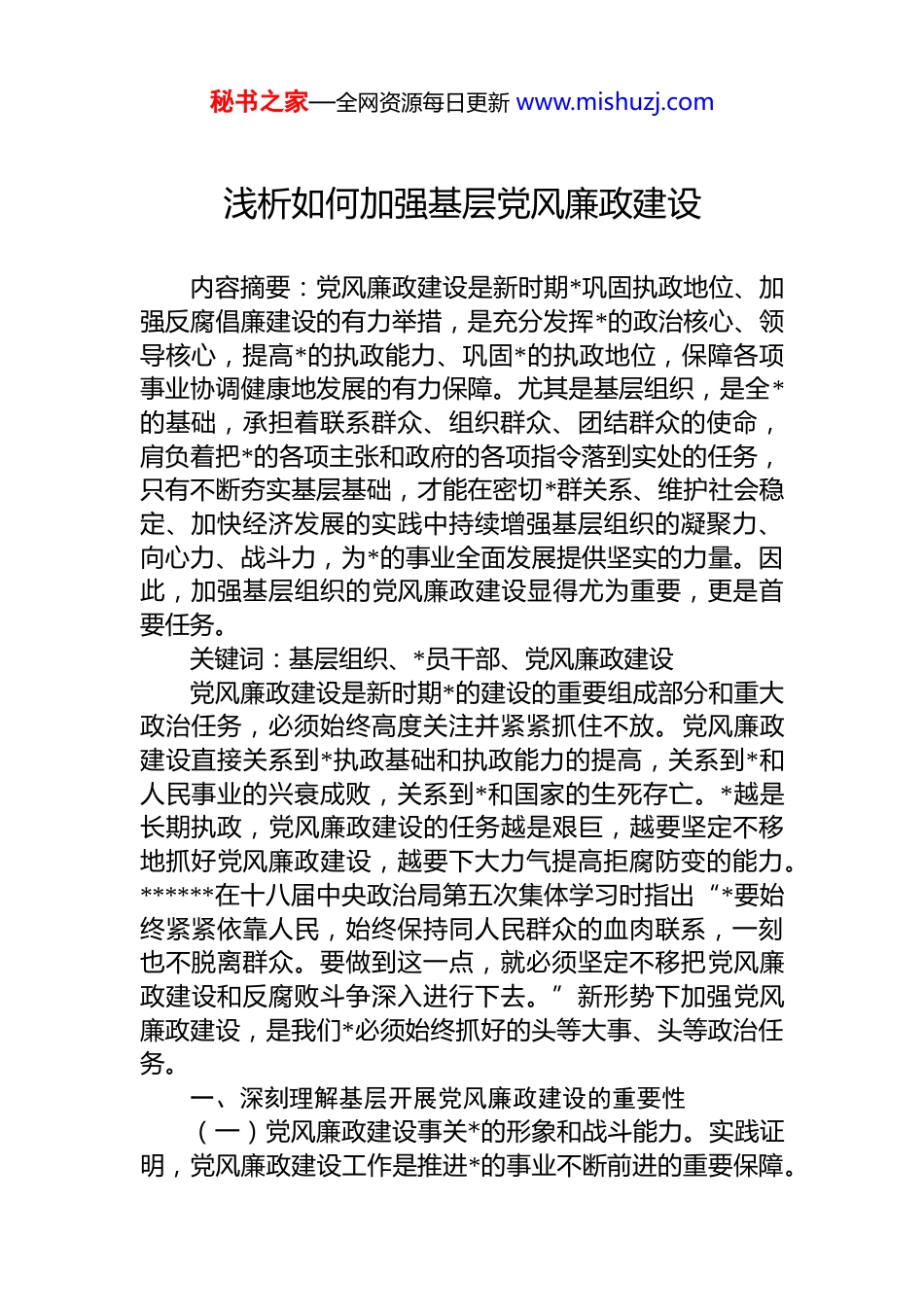 秘书之家—全网资源每日更新 www.mishuzj.com浅析如何加强基层党风廉政建设内容摘要:党风廉政建设是新时期*巩固执政地位、加强反腐倡廉建设的有力举措,是充分发挥*的政治核心、领导核心,提高*的执政能力、巩固*的执政地位,保障各项事业协调健康地发展的有力保障。尤其是基层组织,是全*的基础,承担着联系群众、组织群众、团结群众的使命,肩负着把*的各项主张和政府的各项指令落到实处的任务,只有不断夯实基层基础,才能在密切*群关系、维护社会稳定、加快经济发展的实践中持续增强基层组织的凝聚力、向心力、战斗力,为*的事业全面发展提供坚实的力量。因此,加强基层组织的党风廉政建设显得尤为重要,更是首要任务。关键词:基层组织、*员干部、党风廉政建设党风廉政建设是新时期*的建设的重要组成部分和重大政治任务,必须始终高度关注并紧紧抓住不放。党风廉政建设直接关系到*执政基础和执政能力的提高,关系到*和人民事业的兴衰成败,关系到*和国家的生死存亡。*越是长期执政,党风廉政建设的任务越是艰巨,越要坚定不移地抓好党风廉政建设,越要下大力气提高拒腐防变的能力。******在十八届中央政治局第五次集体学习时指出“*要始终紧紧依靠人民,始终保持同人民群众的血肉联系,一刻也不脱离群众。要做到这一点,就必须坚定不移把党风廉政建设和反腐败斗争深入进行下去。”新形势下加强党风廉政建设,是我们*必须始终抓好的头等大事、头等政治任务。一、深刻理解基层开展党风廉政建设的重要性(一)党风廉政建设事关*的形象和战斗能力。实践证明,党风廉政建设工作是推进*的事业不断前进的重要保障。秘书之家—全网资源每日更新 www.mishuzj.com*在长期斗争实践中,形成了理论和实践相结合、密切联系人民群众、批评与自我批评等优良作风,这是共产*区别于其他任何政*的显著标志,是使*成为领导革命事业的坚强核心,*的路线、方针、政策得以顺利贯彻,受到全国各族人民衷心拥护的根本保证。随着时代发展,党风廉政建设被赋予新发展、新内容,但*始终坚持把党风廉政建设贯穿各项事业始终,并团结带领全*全国各族人民取得了伟大成就。但也要清醒的认识到,个别*员干部存在着精神懈怠、能力不足、脱离群众、消极腐败等问题。这些问题动摇着*的执政地位和国家政权的巩固,阻碍着中国特色社会主义事业的发展前途。实践证明,必须从事关推进改革、保持稳定、促进发展的高度认识党风廉政建设工作,把党风廉政建设作为加强*的领导与*的建设一个重要问题来抓。(二)党风廉政建设事关*群干群关系和人心向背。古人云:“得民心者得天下。”古往今来,决定政权存亡的诸多因素中,最重要的就是人心。不管时代如何发展、形势如何变化,我们*必须始终把人民放在心中最高位置,保持同人民群众的血肉联系,解决好人民群众的急难愁盼问题,实现好、维护好、发展好最广大人民根本利益,这样才能得到广大人民群众的支持和衷心拥护。实践证明,人心所向是决定我们*发展壮大、事业兴旺和国家长治久安的基础和根本保证,必须要珍惜、巩固、扩大这个基础。全*上下必须清醒地认识到,由于*的长期执政,有些*员干部受各种消极因素的侵蚀,抵御不住各种诱惑,用手中的权利来谋取私利、贪污受贿、腐化堕落,这些是与*的性质和宗旨根本对立的,必会为人民群众所不满、被人民群众所唾弃。这种情况,必须引起全*上下的高度重视,决不可麻木不仁、掉以轻心。 (三)党风廉政建设事关*和国家的生死存亡。江山就是人民,人民就是江山。******指出,*的最大政治优势是密切联系群众,*执政后的最大危险是脱离群众;民心是最秘书之家—全网资源每日更新 www.mishuzj.com大的政治,一个政*,一个政权,其前途和命运最终取决于人心向背;老百姓是天,老百姓是地,忘记了人民,脱离了人民,我们就会成为无源之水、无本之木,就会一事无成。近年来,我们*在从严治*方面取得了长足进步,但在一些地方和部门,还存在选人用人不正,形式主义、官僚主义、享乐主义和奢靡之风屡禁不止的现象。如果不下决心去解决这些问题,就会使我们*脱离群众、脱离实际,就会动摇我们*的执政根基,这是极其危险的。对于事关*和...