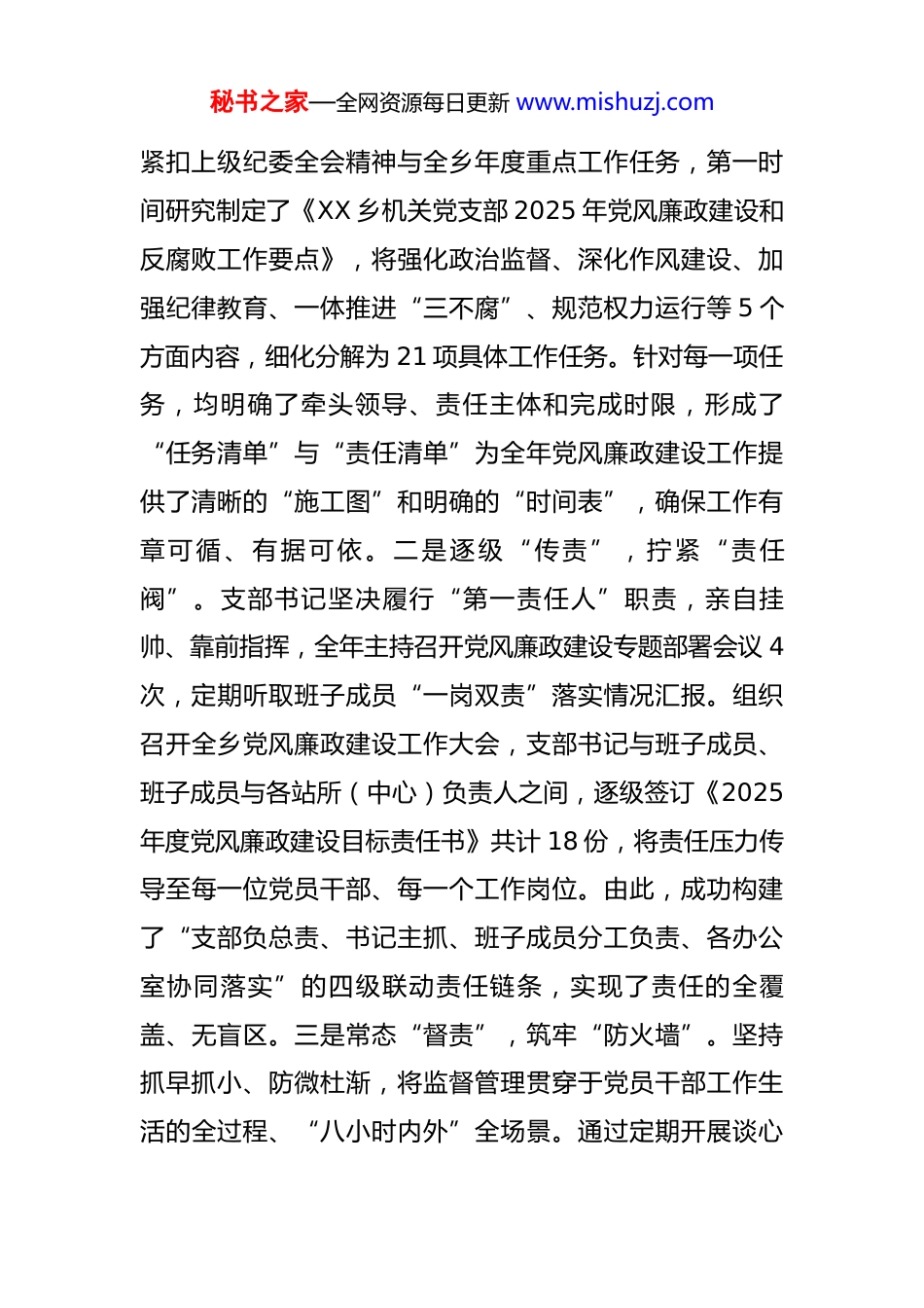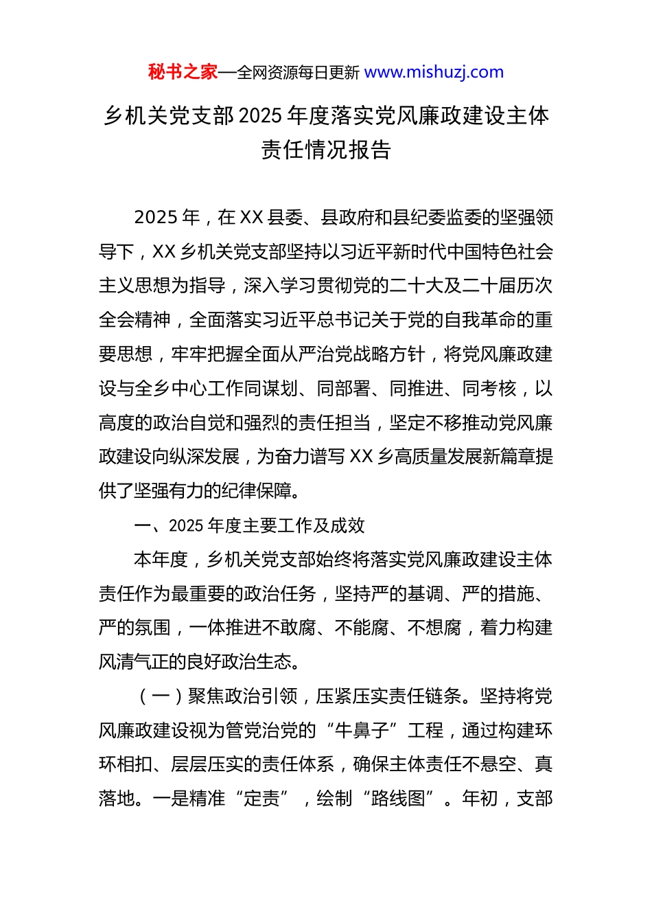 秘书之家—全网资源每日更新 www.mishuzj.com乡机关党支部 2025 年度落实党风廉政建设主体责任情况报告 2025 年,在 XX 县委、县政府和县纪委监委的坚强领导下,XX 乡机关党支部坚持以习近平新时代中国特色社会主义思想为指导,深入学习贯彻党的二十大及二十届历次全会精神,全面落实习近平总书记关于党的自我革命的重要思想,牢牢把握全面从严治党战略方针,将党风廉政建设与全乡中心工作同谋划、同部署、同推进、同考核,以高度的政治自觉和强烈的责任担当,坚定不移推动党风廉政建设向纵深发展,为奋力谱写 XX 乡高质量发展新篇章提供了坚强有力的纪律保障。一、2025 年度主要工作及成效本年度,乡机关党支部始终将落实党风廉政建设主体责任作为最重要的政治任务,坚持严的基调、严的措施、严的氛围,一体推进不敢腐、不能腐、不想腐,着力构建风清气正的良好政治生态。(一)聚焦政治引领,压紧压实责任链条。坚持将党风廉政建设视为管党治党的“牛鼻子”工程,通过构建环环相扣、层层压实的责任体系,确保主体责任不悬空、真落地。一是精准“定责”,绘制“路线图”。年初,支部秘书之家—全网资源每日更新 www.mishuzj.com紧扣上级纪委全会精神与全乡年度重点工作任务,第一时间研究制定了《XX 乡机关党支部 2025 年党风廉政建设和反腐败工作要点》,将强化政治监督、深化作风建设、加强纪律教育、一体推进“三不腐”、规范权力运行等 5 个方面内容,细化分解为 21 项具体工作任务。针对每一项任务,均明确了牵头领导、责任主体和完成时限,形成了“任务清单”与“责任清单”为全年党风廉政建设工作提供了清晰的“施工图”和明确的“时间表”,确保工作有章可循、有据可依。二是逐级“传责”,拧紧“责任阀”。支部书记坚决履行“第一责任人”职责,亲自挂帅、靠前指挥,全年主持召开党风廉政建设专题部署会议 4次,定期听取班子成员“一岗双责”落实情况汇报。组织召开全乡党风廉政建设工作大会,支部书记与班子成员、班子成员与各站所(中心)负责人之间,逐级签订《2025年度党风廉政建设目标责任书》共计 18 份,将责任压力传导至每一位党员干部、每一个工作岗位。由此,成功构建了“支部负总责、书记主抓、班子成员分工负责、各办公室协同落实”的四级联动责任链条,实现了责任的全覆盖、无盲区。三是常态“督责”,筑牢“防火墙”。坚持抓早抓小、防微杜渐,将监督管理贯穿于党员干部工作生活的全过程、“八小时内外”全场景。通过定期开展谈心秘书之家—全网资源每日更新 www.mishuzj.com谈话、不定期进行座谈交流等方式,动态掌握干部思想状况。全年共开展廉政谈话 10 余次,覆盖全体干部职工;针对苗头性、倾向性问题,及时开展提醒谈话 6 人次。聚焦重点领域和关键岗位,组织开展廉政风险点大排查,共梳理排查出廉政风险点 23 个,并针对性制定了 23 条具体防控措施,建立了《廉政风险点及防控措施台账》,做到了精准预警、靶向防控,有效防止了小问题演变成大错误。(二)突出思想铸魂,筑牢廉洁自律防线。始终将思想政治建设摆在首位,坚持以理想信念强基固本,通过“理论武装、警示教育、文化浸润”三维一体的教育模式,不断夯实全体党员干部拒腐防变的思想根基。一是强化理论武装,补足精神之“钙”。构建并深化“支部引领学、党员日常学、专题研讨学、线上线下融合学”的四位一体学习机制。严格落实“第一议题”制度,将学习习近平新时代中国特色社会主义思想、习近平总书记关于全面从严治党的重要论述以及新修订的《中国共产党纪律处分条例》等作为支部委员会、党员大会的固定内容。全年累计开展集中学习研讨 50 余次,组织 24 名干部参加 XX 干部网络学院专题培训班。通过系统深入的学习,引导全体党员干部深刻领悟“两个确立”的决定性意义,增强“四个意识”、坚定“四个自信”、做到“两个维护”,从思秘书之家—全网资源每日更新 www.mishuzj.com想源头上筑牢廉洁防线。二是深化警示教育,常敲思想“警钟”。紧盯元旦、春节、中秋等重要时间节点,通过下发廉洁过节通知、发送廉政提醒短信等方式,开展“节点反腐...