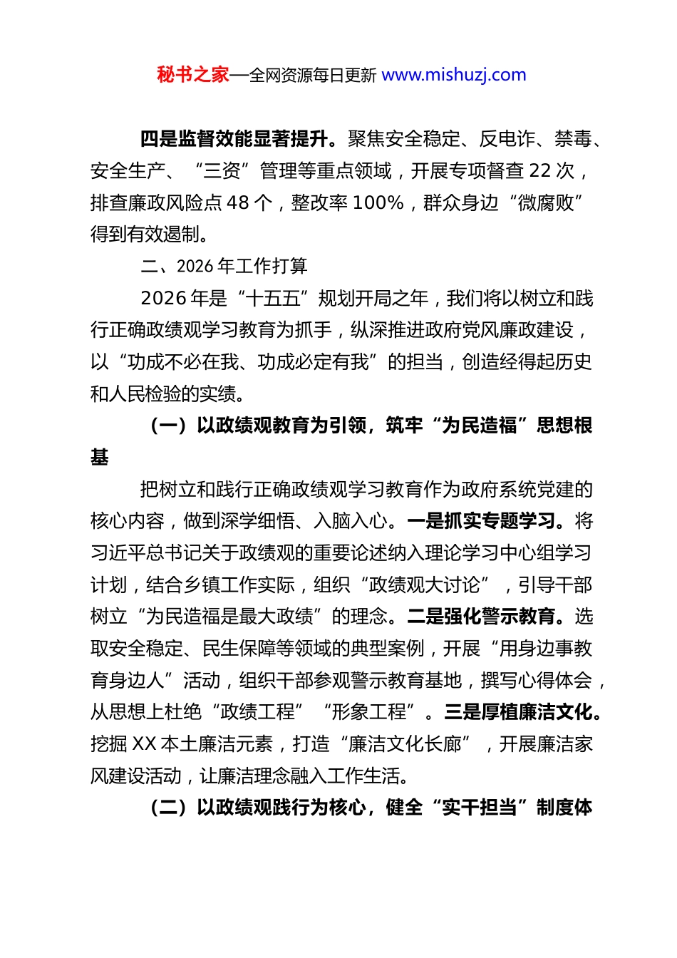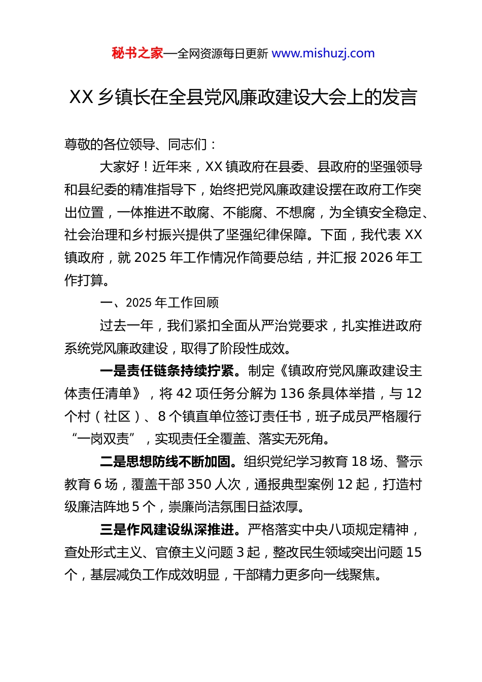 秘书之家—全网资源每日更新 www.mishuzj.comXX 乡镇长在全县党风廉政建设大会上的发言尊敬的各位领导、同志们:大家好!近年来,XX 镇政府在县委、县政府的坚强领导和县纪委的精准指导下,始终把党风廉政建设摆在政府工作突出位置,一体推进不敢腐、不能腐、不想腐,为全镇安全稳定、社会治理和乡村振兴提供了坚强纪律保障。下面,我代表 XX镇政府,就 2025 年工作情况作简要总结,并汇报 2026 年工作打算。一、2025 年工作回顾过去一年,我们紧扣全面从严治党要求,扎实推进政府系统党风廉政建设,取得了阶段性成效。一是责任链条持续拧紧。制定《镇政府党风廉政建设主体责任清单》,将 42 项任务分解为 136 条具体举措,与 12个村(社区)、8 个镇直单位签订责任书,班子成员严格履行“一岗双责”,实现责任全覆盖、落实无死角。二是思想防线不断加固。组织党纪学习教育 18 场、警示教育 6 场,覆盖干部 350 人次,通报典型案例 12 起,打造村级廉洁阵地 5 个,崇廉尚洁氛围日益浓厚。三是作风建设纵深推进。严格落实中央八项规定精神,查处形式主义、官僚主义问题 3 起,整改民生领域突出问题 15个,基层减负工作成效明显,干部精力更多向一线聚焦。秘书之家—全网资源每日更新 www.mishuzj.com四是监督效能显著提升。聚焦安全稳定、反电诈、禁毒、安全生产、“三资”管理等重点领域,开展专项督查 22 次,排查廉政风险点 48 个,整改率 100%,群众身边“微腐败”得到有效遏制。二、2026 年工作打算2026 年是“十五五”规划开局之年,我们将以树立和践行正确政绩观学习教育为抓手,纵深推进政府党风廉政建设,以“功成不必在我、功成必定有我”的担当,创造经得起历史和人民检验的实绩。(一)以政绩观教育为引领,筑牢“为民造福”思想根基把树立和践行正确政绩观学习教育作为政府系统党建的核心内容,做到深学细悟、入脑入心。一是抓实专题学习。将习近平总书记关于政绩观的重要论述纳入理论学习中心组学习计划,结合乡镇工作实际,组织“政绩观大讨论”,引导干部树立“为民造福是最大政绩”的理念。二是强化警示教育。选取安全稳定、民生保障等领域的典型案例,开展“用身边事教育身边人”活动,组织干部参观警示教育基地,撰写心得体会,从思想上杜绝“政绩工程”“形象工程”。三是厚植廉洁文化。挖掘 XX 本土廉洁元素,打造“廉洁文化长廊”,开展廉洁家风建设活动,让廉洁理念融入工作生活。(二)以政绩观践行为核心,健全“实干担当”制度体秘书之家—全网资源每日更新 www.mishuzj.com系将政绩观要求融入政府工作全流程,用制度保障实干导向。一是压实主体责任。修订完善党风廉政建设责任清单,将政绩观践行情况纳入班子成员“一岗双责”考核,形成“主要领导负总责、分管领导具体抓、各部门抓落实”的工作格局。二是完善考核评价。建立“民生导向、实干导向、长效导向”的考核体系,增设安全稳定、反电诈、安全生产、民生改善等指标权重,实施“短期评估+长期跟踪”动态考核,探索政绩追溯机制。三是规范权力运行。健全村级小微权力清单,聚焦行政审批、项目建设、资金使用等关键环节,推行“清单化管理、阳光化运行”,确保权力在监督下规范行使。(三)以政绩观落地为抓手,锤炼“求真务实”工作作风把践行正确政绩观转化为干事创业的实际行动,以优良作风推动工作落实。一是深化作风整治。持续整治形式主义,精简会议文件,减少不必要的督查考核,让干部腾出更多精力抓落实。坚决纠治“不作为、慢作为、乱作为”,树立“重实干、重实绩”的用人导向。二是聚焦民生实事。围绕群众急难愁盼,实施人居环境整治、养老服务提升、医疗资源下沉等 10件民生实事,建立“清单化推进、销号式管理”机制,确保事事有回音、件件有着落。三是强化担当作为。在安全稳定、反电诈、禁毒、乡村振兴等一线设立“攻坚岗”,鼓励干部迎难秘书之家—全网资源每日更新 www.mishuzj.com而上,对表现突出的予以表彰奖励,让实干者有舞台、有为者有位。(四)以政绩观护航为保障,绷紧“廉洁自律”纪律之弦坚持严的基调不动摇,为践行正确政绩...