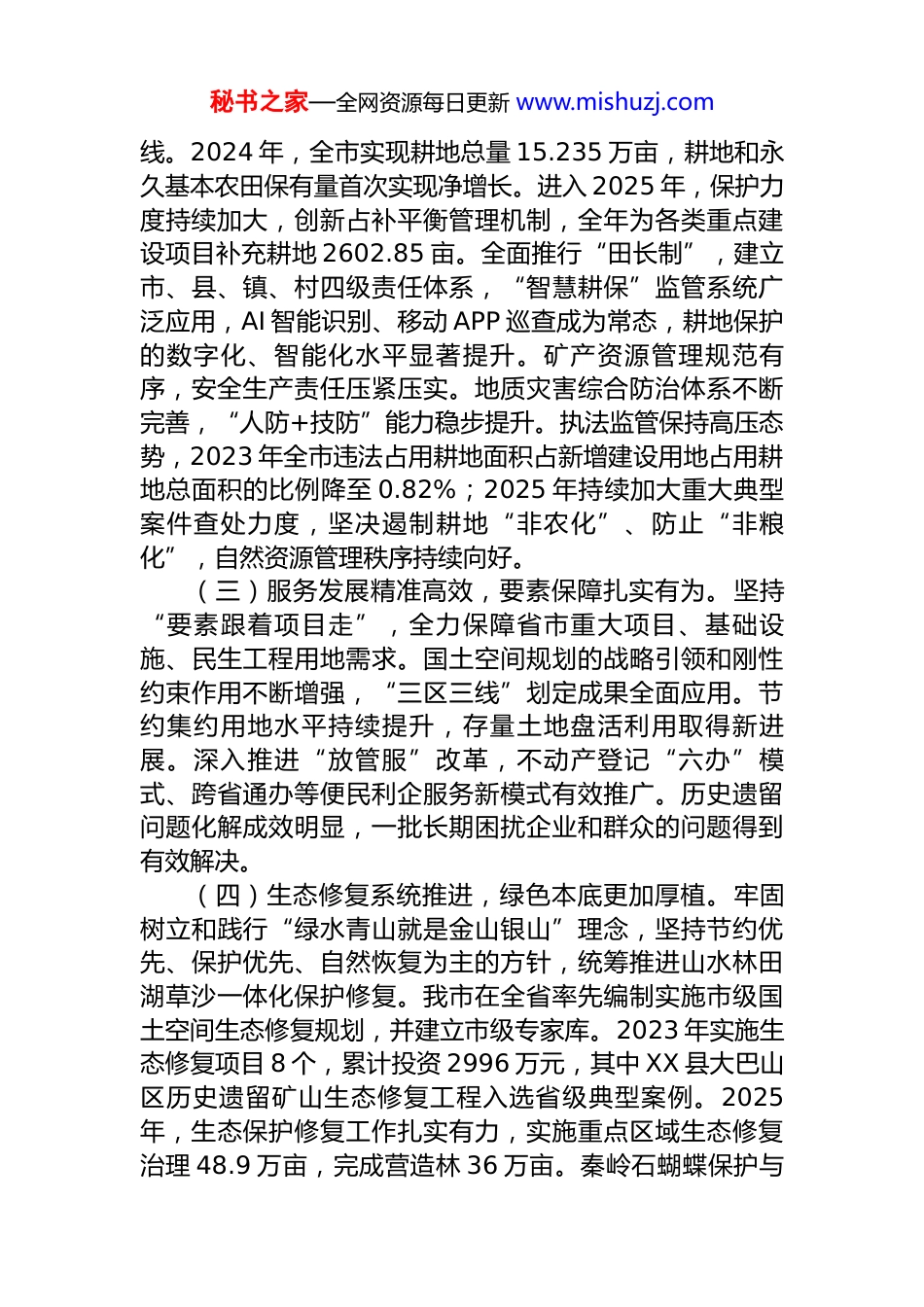 秘书之家—全网资源每日更新 www.mishuzj.com在市自然资源局 2026 年度全市自然资源暨党风廉政建设工作会议上的讲话同志们:今天,我们召开 2026 年度全市自然资源暨党风廉政建设工作会议。这次会议的主要任务是,深入学习贯彻党的二十大和二十届历次全会精神,全面落实部、省自然资源工作会议部署及市委、市政府工作要求,总结回顾过去一年工作,分析研判当前形势,安排部署新一年度重点任务,动员全系统干部职工以更加昂扬的斗志、更加务实的作风,奋力开创全市自然资源事业高质量发展新局面。下面,我讲几点意见。一、回顾过往,砥砺前行,2025 年工作成效显著2025 年是全面完成“十四五”规划目标的收官之年。全市自然资源系统在省厅党组和市委、市政府的坚强领导下,紧紧围绕中心、服务大局,忠诚履行“两统一”核心职责,攻坚克难,担当作为,各项事业取得扎实进展。(一)政治统领坚强有力,全面从严治党纵深推进。始终坚持把党的政治建设摆在首位,持续深化理论武装,引导全系统干部职工深刻领悟“两个确立”的决定性意义,坚决做到“两个维护”。作风建设成果持续巩固拓展,“勤快严实精细廉”作风要求深入人心。管党治党政治责任层层压实,贯通协同的监督体系不断完善。深化以案促改警示教育,围绕近年来全系统发生的违纪违法典型案例开展深入剖析,组织观看警示教育片,发放《案例选编》用身边事教育身边人。党风廉政建设与业务工作同部署、同落实、同考核,风清气正的政治生态持续优化。(二)资源保护坚决有效,安全底线牢牢筑稳。坚决扛起耕地保护政治责任,全面落实党政同责,严守耕地红秘书之家—全网资源每日更新 www.mishuzj.com线。2024 年,全市实现耕地总量 15.235 万亩,耕地和永久基本农田保有量首次实现净增长。进入 2025 年,保护力度持续加大,创新占补平衡管理机制,全年为各类重点建设项目补充耕地 2602.85 亩。全面推行“田长制”,建立市、县、镇、村四级责任体系,“智慧耕保”监管系统广泛应用,AI 智能识别、移动 APP 巡查成为常态,耕地保护的数字化、智能化水平显著提升。矿产资源管理规范有序,安全生产责任压紧压实。地质灾害综合防治体系不断完善,“人防+技防”能力稳步提升。执法监管保持高压态势,2023 年全市违法占用耕地面积占新增建设用地占用耕地总面积的比例降至 0.82%;2025 年持续加大重大典型案件查处力度,坚决遏制耕地“非农化”、防止“非粮化”,自然资源管理秩序持续向好。(三)服务发展精准高效,要素保障扎实有为。坚持“要素跟着项目走”,全力保障省市重大项目、基础设施、民生工程用地需求。国土空间规划的战略引领和刚性约束作用不断增强,“三区三线”划定成果全面应用。节约集约用地水平持续提升,存量土地盘活利用取得新进展。深入推进“放管服”改革,不动产登记“六办”模式、跨省通办等便民利企服务新模式有效推广。历史遗留问题化解成效明显,一批长期困扰企业和群众的问题得到有效解决。(四)生态修复系统推进,绿色本底更加厚植。牢固树立和践行“绿水青山就是金山银山”理念,坚持节约优先、保护优先、自然恢复为主的方针,统筹推进山水林田湖草沙一体化保护修复。我市在全省率先编制实施市级国土空间生态修复规划,并建立市级专家库。2023 年实施生态修复项目 8 个,累计投资 2996 万元,其中 XX 县大巴山区历史遗留矿山生态修复工程入选省级典型案例。2025年,生态保护修复工作扎实有力,实施重点区域生态修复治理 48.9 万亩,完成营造林 36 万亩。秦岭石蝴蝶保护与秘书之家—全网资源每日更新 www.mishuzj.com野外回归实现新突破,朱鹦国家保护研究中心落地 XX,生物多样性保护取得显著成效。全市累计完成矿山生态修复治理面积 736 公顷,嘉陵江上游 XX 座尾矿库综合治理全面完成,秦巴生态安全屏障更加牢固。过去一年的成绩来之不易,这是省厅和市委、市政府正确领导的结果,是全系统广大干部职工团结拼搏、辛勤付出的结果。在此,我代表局党组,向大家表示衷心的感谢!二、认清形势,把握机遇,切实增强做好 2026 年工作的责任感和使命感2026 年是实施“...