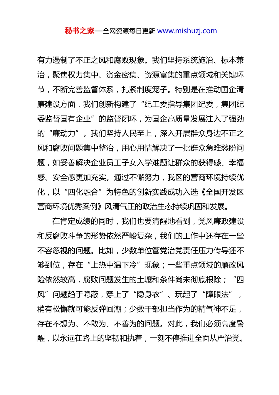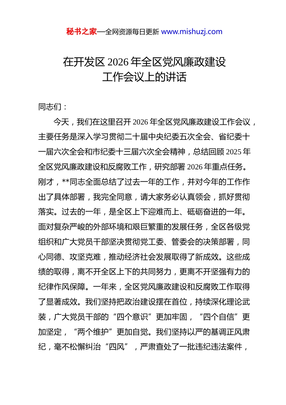 秘书之家—全网资源每日更新 www.mishuzj.com在开发区 2026 年全区党风廉政建设工作会议上的讲话 同志们:今天,我们在这里召开 2026 年全区党风廉政建设工作会议,主要任务是深入学习贯彻二十届中央纪委五次全会、省纪委十一届六次全会和市纪委十三届六次全会精神,总结回顾 2025 年全区党风廉政建设和反腐败工作,研究部署 2026 年重点任务。刚才,**同志全面总结了过去一年的工作,并对今年的工作作出了具体部署,我完全同意,请大家务必认真领会,抓好贯彻落实。过去的一年,是全区上下迎难而上、砥砺奋进的一年。面对复杂严峻的外部环境和艰巨繁重的发展任务,全区各级党组织和广大党员干部坚决贯彻党工委、管委会的决策部署,同心同德、攻坚克难,推动经济社会发展取得了新成效。这些成绩的取得,离不开全区上下的共同努力,更离不开坚强有力的纪律作风保障。一年来,全区党风廉政建设和反腐败工作取得了显著成效。我们坚持把政治建设摆在首位,持续深化理论武装,广大党员干部的“四个意识”更加牢固,“四个自信”更加坚定,“两个维护”更加自觉。我们坚持以严的基调正风肃纪,毫不松懈纠治“四风”,严肃查处了一批违纪违法案件,秘书之家—全网资源每日更新 www.mishuzj.com有力遏制了不正之风和腐败现象。我们坚持系统施治、标本兼治,聚焦权力集中、资金密集、资源富集的重点领域和关键环节,不断完善监督体系,扎紧制度笼子。特别是在推动国企清廉建设方面,我们创新构建了“纪工委指导集团纪委,集团纪委监督国有企业”的监督闭环,为国企高质量发展注入了强劲的“廉动力”。我们坚持人民至上,深入开展群众身边不正之风和腐败问题集中整治,用心用情解决了一批群众急难愁盼问题,如妥善解决企业员工子女入学难题让群众的获得感、幸福感、安全感更加充实。通过不懈努力,我区的营商环境持续优化,以“四化融合”为特色的创新实践成功入选《全国开发区营商环境优秀案例》风清气正的政治生态持续巩固和发展。在肯定成绩的同时,我们也要清醒地看到,党风廉政建设和反腐败斗争的形势依然严峻复杂,我们的工作中还存在一些不容忽视的问题。比如,少数单位管党治党责任压力传导还不够到位,存在“上热中温下冷”现象;一些重点领域的廉政风险依然较高,腐败问题发生的土壤和条件尚未彻底根除;“四风”问题趋于隐蔽,穿上了“隐身衣”、玩起了“障眼法”,稍有松懈就可能反弹回潮;少数干部担当作为的精气神不足,存在不想为、不敢为、不善为的问题。对此,我们必须高度警醒,以永远在路上的坚韧和执着,一刻不停推进全面从严治党。秘书之家—全网资源每日更新 www.mishuzj.com2026 年是实施“十五五”规划的开局之年,做好今年的党风廉政建设和反腐败工作,意义重大、责任重大。我们要深刻认识到,抓好党风廉政建设,不仅是必须扛起的政治责任,更是推动开发区高质量发展的内在要求和根本保障。一个地方的发展,短期靠项目,中期靠政策,长期靠环境。而风清气正的政治生态,正是营商环境的核心竟争力。只有把全面从严治党引向深入,才能为全区经济社会发展扫清障碍、保驾护航,确保“十五五”开好局、起好步。下面,我讲四点意见。一、聚焦“两个维护”,在服务中心大局中彰显政治监督新高度政治监督是纪检监察工作的首要职责。全区各级党组织和纪检监察机构必须把监督的镜头对准中心工作,确保党中央决策部署和省委、市委工作要求在开发区不折不扣落地生根。一是要围绕“国之大者”强化跟进监督。要紧紧围绕“十五五”规划开局起步、构建新发展格局、推动高质量发展等重大战略部署,结合党工委、管委会关于经济发展、科技创新、民生保障、安全生产等方面的具体安排,及时更新完善政治监督台账,建立任务清单、责任清单、问题清单,实行销号管理。要常态化开展落实情况“回头看”,对执行不力、进展缓慢、效果不彰的,要及时预警提醒、督促整改,确保各项部署件件秘书之家—全网资源每日更新 www.mishuzj.com有着落、事事见成效。二是要围绕发展要务强化精准监督。良好的营商环境是开发区发展的生命线。纪检监察机关要主动作为,把监督保障营商环境优化作...