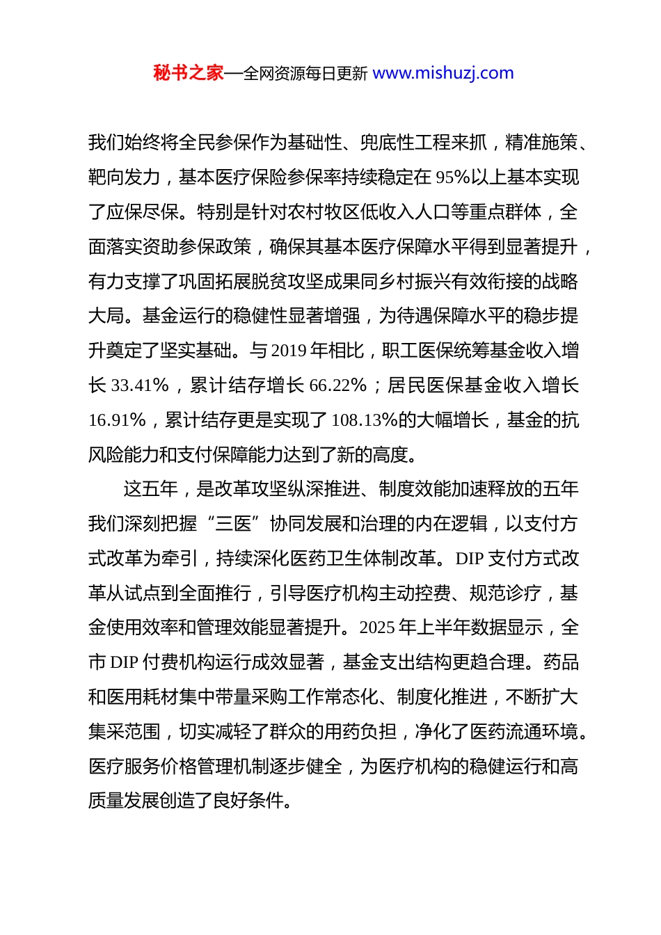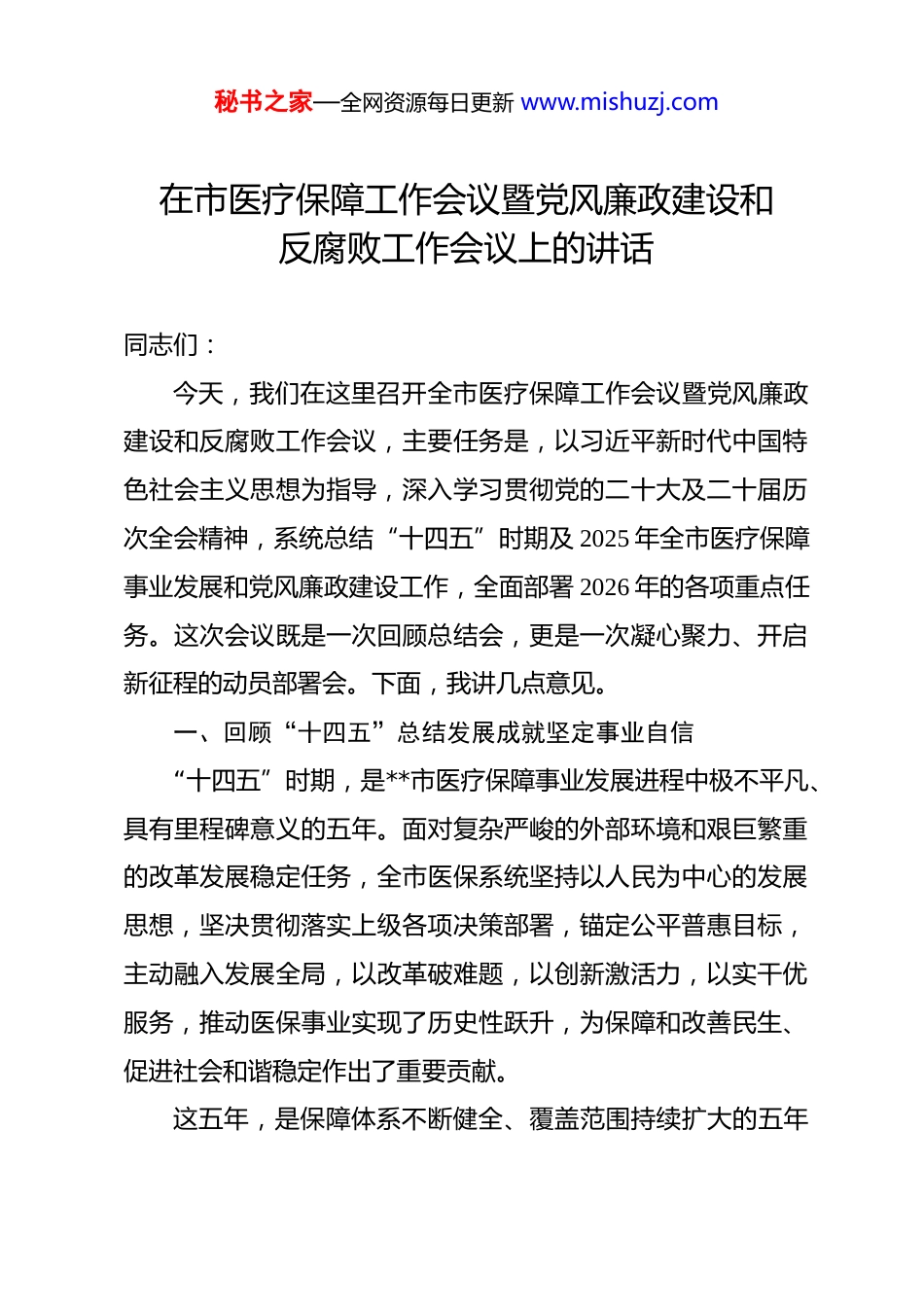秘书之家—全网资源每日更新 www.mishuzj.com在市医疗保障工作会议暨党风廉政建设和反腐败工作会议上的讲话 同志们:今天,我们在这里召开全市医疗保障工作会议暨党风廉政建设和反腐败工作会议,主要任务是,以习近平新时代中国特色社会主义思想为指导,深入学习贯彻党的二十大及二十届历次全会精神,系统总结“十四五”时期及 2025 年全市医疗保障事业发展和党风廉政建设工作,全面部署 2026 年的各项重点任务。这次会议既是一次回顾总结会,更是一次凝心聚力、开启新征程的动员部署会。下面,我讲几点意见。一、回顾“十四五”总结发展成就坚定事业自信“十四五”时期,是**市医疗保障事业发展进程中极不平凡、具有里程碑意义的五年。面对复杂严峻的外部环境和艰巨繁重的改革发展稳定任务,全市医保系统坚持以人民为中心的发展思想,坚决贯彻落实上级各项决策部署,锚定公平普惠目标,主动融入发展全局,以改革破难题,以创新激活力,以实干优服务,推动医保事业实现了历史性跃升,为保障和改善民生、促进社会和谐稳定作出了重要贡献。这五年,是保障体系不断健全、覆盖范围持续扩大的五年秘书之家—全网资源每日更新 www.mishuzj.com我们始终将全民参保作为基础性、兜底性工程来抓,精准施策、靶向发力,基本医疗保险参保率持续稳定在 95%以上基本实现了应保尽保。特别是针对农村牧区低收入人口等重点群体,全面落实资助参保政策,确保其基本医疗保障水平得到显著提升,有力支撑了巩固拓展脱贫攻坚成果同乡村振兴有效衔接的战略大局。基金运行的稳健性显著增强,为待遇保障水平的稳步提升奠定了坚实基础。与 2019 年相比,职工医保统筹基金收入增长 33.41%,累计结存增长 66.22%;居民医保基金收入增长16.91%,累计结存更是实现了 108.13%的大幅增长,基金的抗风险能力和支付保障能力达到了新的高度。这五年,是改革攻坚纵深推进、制度效能加速释放的五年我们深刻把握“三医”协同发展和治理的内在逻辑,以支付方式改革为牵引,持续深化医药卫生体制改革。DIP 支付方式改革从试点到全面推行,引导医疗机构主动控费、规范诊疗,基金使用效率和管理效能显著提升。2025 年上半年数据显示,全市 DIP 付费机构运行成效显著,基金支出结构更趋合理。药品和医用耗材集中带量采购工作常态化、制度化推进,不断扩大集采范围,切实减轻了群众的用药负担,净化了医药流通环境。医疗服务价格管理机制逐步健全,为医疗机构的稳健运行和高质量发展创造了良好条件。秘书之家—全网资源每日更新 www.mishuzj.com这五年,是服务能力优化升级、群众体验持续改善的五年我们始终将群众满意度作为衡量工作的最高标准,聚焦群众就医报销中的“急难愁盼”问题,大力推进经办服务模式创新。全市范围内“15 分钟医保服务圈”基本建成,医保服务站点延伸至苏木乡镇、街道嘎查村和社区,打通了服务群众的“最后一公里”。异地就医直接结算范围不断扩大,流程持续简化,让数据多跑路、群众少跑腿成为现实。医保电子凭证的推广应用,让群众享受到了“一码在手,医保无忧”的便捷服务,医保服务的智慧化、便捷化水平迈上了新台阶。这些实实在在的成绩,得到了人民群众的广泛认可,也为**市医疗保障局赢得了“全国医疗保障系统先进集体”的崇高荣誉。刚刚过去的 2025 年,是“十四五”规划的收官之年。全市医保系统全体干部职工团结一心、攻坚克难,推动各项工作稳中有进、质效并举,为“十四五”时期画上了圆满的句号。参保扩面提质增效,基金运行平稳可控,待遇保障稳固提升,基金监管高压有效,改革任务全面完成,服务体验持续优化。这些成绩的取得,是市委、市政府坚强领导的结果,是各相关部门协同配合的结果,更是全市医保系统广大干部职工辛勤付出、不懈奋斗的结果。在此,我代表市医保局党组,向大家表示衷心的感谢和崇高的敬意!秘书之家—全网资源每日更新 www.mishuzj.com二、认清当前形势把握机遇挑战增强历史主动在肯定成绩的同时,我们必须清醒地认识到,当前医疗保障事业发展面临的形势依然严峻复杂。从外部环境看,人口老龄化进程加快、慢性病负担加重、医疗技术快速进步...
