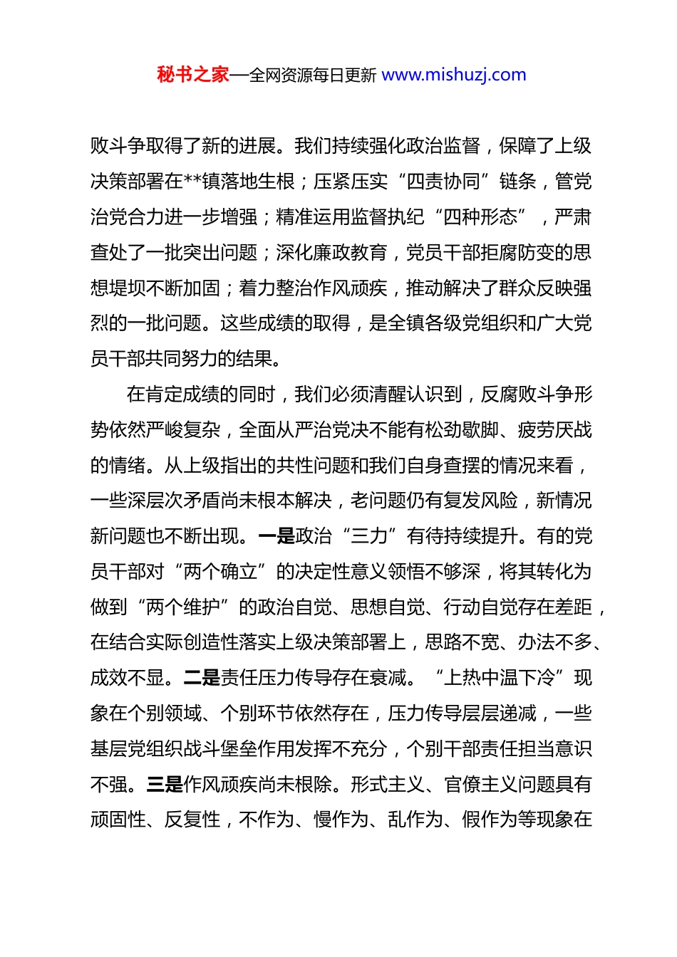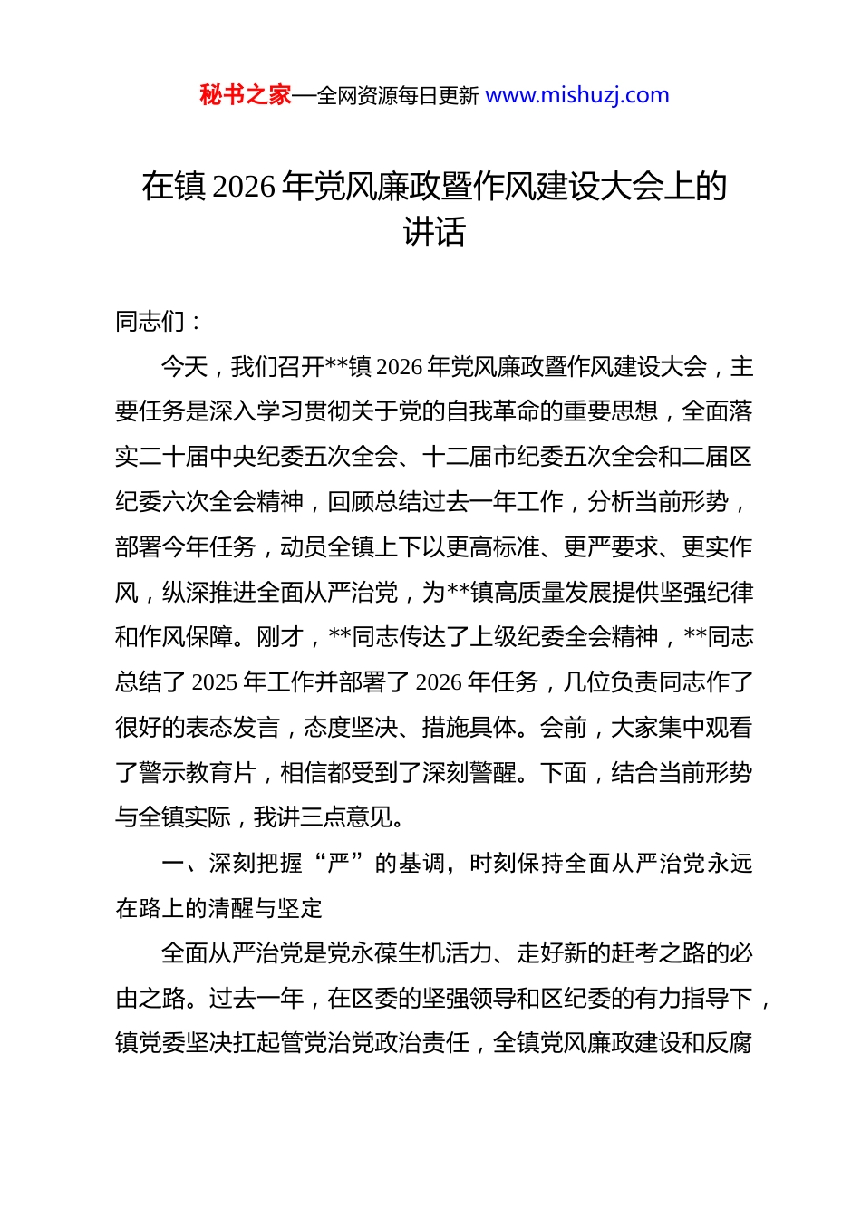 秘书之家—全网资源每日更新 www.mishuzj.com在镇 2026 年党风廉政暨作风建设大会上的讲话 同志们:今天,我们召开**镇 2026 年党风廉政暨作风建设大会,主要任务是深入学习贯彻关于党的自我革命的重要思想,全面落实二十届中央纪委五次全会、十二届市纪委五次全会和二届区纪委六次全会精神,回顾总结过去一年工作,分析当前形势,部署今年任务,动员全镇上下以更高标准、更严要求、更实作风,纵深推进全面从严治党,为**镇高质量发展提供坚强纪律和作风保障。刚才,**同志传达了上级纪委全会精神,**同志总结了 2025 年工作并部署了 2026 年任务,几位负责同志作了很好的表态发言,态度坚决、措施具体。会前,大家集中观看了警示教育片,相信都受到了深刻警醒。下面,结合当前形势与全镇实际,我讲三点意见。一、深刻把握“严”的基调,时刻保持全面从严治党永远在路上的清醒与坚定全面从严治党是党永葆生机活力、走好新的赶考之路的必由之路。过去一年,在区委的坚强领导和区纪委的有力指导下,镇党委坚决扛起管党治党政治责任,全镇党风廉政建设和反腐秘书之家—全网资源每日更新 www.mishuzj.com败斗争取得了新的进展。我们持续强化政治监督,保障了上级决策部署在**镇落地生根;压紧压实“四责协同”链条,管党治党合力进一步增强;精准运用监督执纪“四种形态”,严肃查处了一批突出问题;深化廉政教育,党员干部拒腐防变的思想堤坝不断加固;着力整治作风顽疾,推动解决了群众反映强烈的一批问题。这些成绩的取得,是全镇各级党组织和广大党员干部共同努力的结果。在肯定成绩的同时,我们必须清醒认识到,反腐败斗争形势依然严峻复杂,全面从严治党决不能有松劲歇脚、疲劳厌战的情绪。从上级指出的共性问题和我们自身查摆的情况来看,一些深层次矛盾尚未根本解决,老问题仍有复发风险,新情况新问题也不断出现。一是政治“三力”有待持续提升。有的党员干部对“两个确立”的决定性意义领悟不够深,将其转化为做到“两个维护”的政治自觉、思想自觉、行动自觉存在差距,在结合实际创造性落实上级决策部署上,思路不宽、办法不多、成效不显。二是责任压力传导存在衰减。“上热中温下冷”现象在个别领域、个别环节依然存在,压力传导层层递减,一些基层党组织战斗堡垒作用发挥不充分,个别干部责任担当意识不强。三是作风顽疾尚未根除。形式主义、官僚主义问题具有顽固性、反复性,不作为、慢作为、乱作为、假作为等现象在秘书之家—全网资源每日更新 www.mishuzj.com个别干部身上仍有表现。比如,在服务群众“最后一公里”上,还存在推诿扯皮、效率不高的问题;在推动“**”家门口产业发展和“**、**、**”三大行动中,有的干部缺乏攻坚克难的锐气和一抓到底的韧劲。四是腐败风险隐患不容忽视。重点领域、关键环节的廉政风险点排查防控仍需加强,新型腐败、隐性腐败的辨识和应对能力有待提高,廉政教育的针对性、实效性有待进一步增强。当前,我们正处在推动**镇经济社会转型升级、深化“三乡”建设的关键时期,任务越繁重,风险考验越大,就越需要以彻底的自我革命精神,把全面从严治党向纵深推进。全镇上下必须深刻认识党风廉政建设和作风建设的极端重要性、长期性、复杂性,切实把思想和行动统一到党中央对形势的科学判断和战略部署上来,始终保持“赶考”的清醒,保持对“腐蚀”“围猎”的警觉,以一刻不停歇的执着和坚定,打好正风肃纪反腐的攻坚战、持久战。二、坚决落实“实”的举措,以系统施治理念纵深推进党风廉政与作风建设2026 年是实施“十四五”规划的关键一年,做好党风廉政和作风建设工作意义重大。我们必须坚持问题导向、目标导向、结果导向相统一,拿出务实管用的硬举措,在具体化、精准化、秘书之家—全网资源每日更新 www.mishuzj.com常态化上下功夫,推动各项工作取得实实在在的新成效。(一)聚焦“两个维护”,在强化政治监督上务求实效。政治监督是纪检监察机关的根本职责。必须把保障党中央大政方针和市委、区委决策部署在**镇不折不扣落实作为首要任务。要紧盯学习贯彻党的创新理论情况,督促党员干部真学真懂真信真用,自觉用以武装...