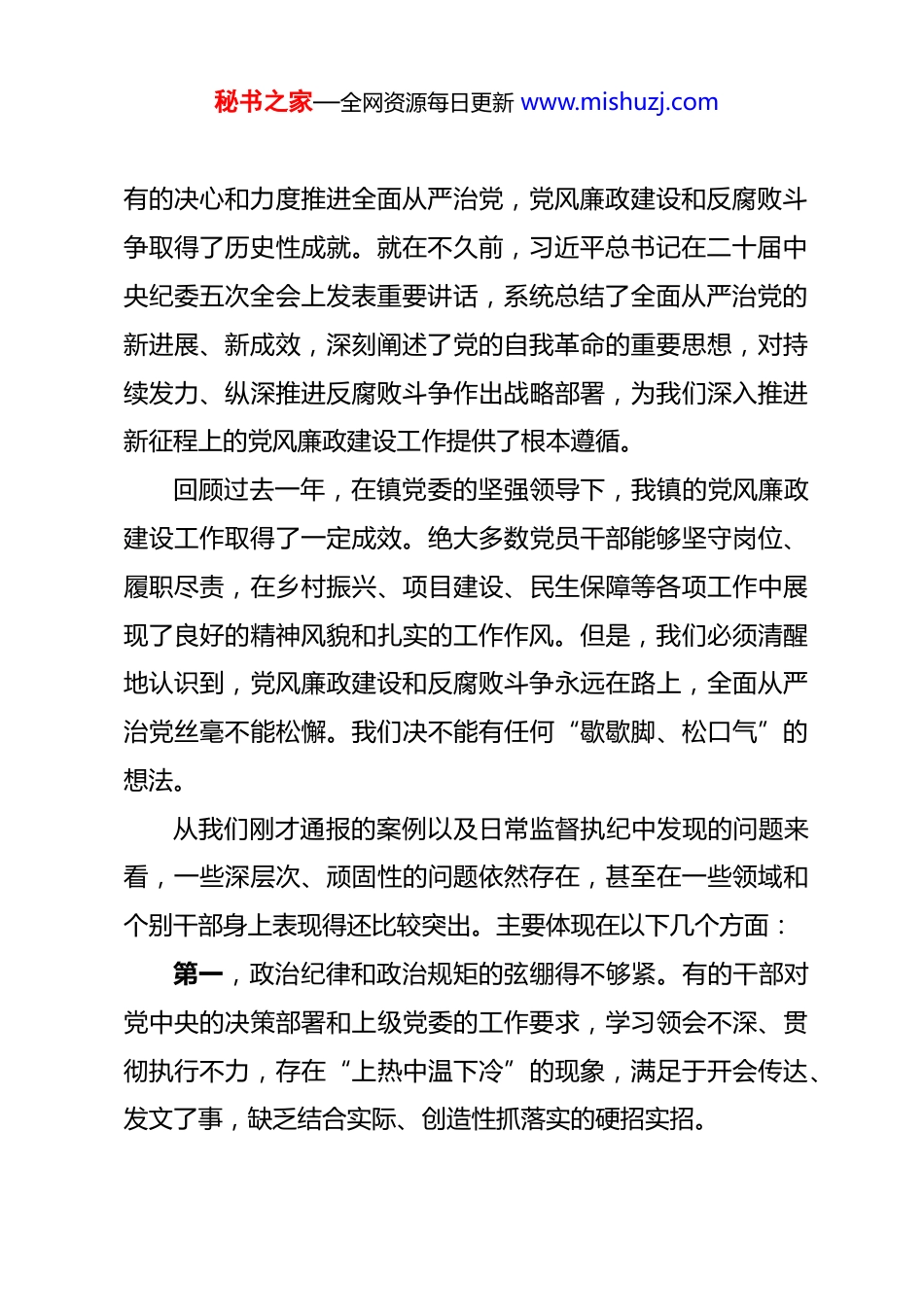 秘书之家—全网资源每日更新 www.mishuzj.com在镇 2026 年第一季度党风廉政建设暨党员干部警示教育会议上的讲话 同志们:今天,我们在这里召开全镇 2026 年第一季度党风廉政建设暨党员干部警示教育会议,主要任务是深入学习贯彻习近平总书记在二十届中央纪委五次全会上的重要讲话精神,全面落实省、市、县相关会议和文件部署,回顾总结我镇过去一段时期的党风廉政建设工作,分析研判当前面临的形势和挑战,并对下一步工作进行扎实的安排和详细的部署。刚才,我们集中学习了《中国共产党纪律处分条例》的部分章节,通报了近期查处的一些典型案例,这些内容值得我们每一位同志深刻反思、引以为戒。稍后,我们还将一同观看警示教育片,用“身边事”警醒“身边人”。希望通过今天的会议,能够让全镇党员干部在思想上再紧一扣、在行动上再加一码,始终保持清醒的头脑和坚定的立场,共同营造和维护我镇风清气正的政治生态。下面,我结合我镇实际,讲几点意见。一、提高政治站位,深刻领会全面从严治党的时代要求与现实紧迫性党的十八大以来,以习近平同志为核心的党中央以前所未秘书之家—全网资源每日更新 www.mishuzj.com有的决心和力度推进全面从严治党,党风廉政建设和反腐败斗争取得了历史性成就。就在不久前,习近平总书记在二十届中央纪委五次全会上发表重要讲话,系统总结了全面从严治党的新进展、新成效,深刻阐述了党的自我革命的重要思想,对持续发力、纵深推进反腐败斗争作出战略部署,为我们深入推进新征程上的党风廉政建设工作提供了根本遵循。回顾过去一年,在镇党委的坚强领导下,我镇的党风廉政建设工作取得了一定成效。绝大多数党员干部能够坚守岗位、履职尽责,在乡村振兴、项目建设、民生保障等各项工作中展现了良好的精神风貌和扎实的工作作风。但是,我们必须清醒地认识到,党风廉政建设和反腐败斗争永远在路上,全面从严治党丝毫不能松懈。我们决不能有任何“歇歇脚、松口气”的想法。从我们刚才通报的案例以及日常监督执纪中发现的问题来看,一些深层次、顽固性的问题依然存在,甚至在一些领域和个别干部身上表现得还比较突出。主要体现在以下几个方面:第一,政治纪律和政治规矩的弦绷得不够紧。有的干部对党中央的决策部署和上级党委的工作要求,学习领会不深、贯彻执行不力,存在“上热中温下冷”的现象,满足于开会传达、发文了事,缺乏结合实际、创造性抓落实的硬招实招。秘书之家—全网资源每日更新 www.mishuzj.com第二,形式主义、官僚主义的问题禁而未绝。有的干部服务群众的意识淡薄,习惯于坐在办公室里看材料、听汇报,深入村组一线、田间地头解决群众急难愁盼问题不够主动,存在“门好进、脸好看、事难办”的现象。有的工作重痕迹、轻实效,把大量精力耗费在“材料美化”和“台账包装”上,而不是用在解决实际问题、推动发展的实效上。第三,违反中央八项规定精神的问题仍有发生。一些“四风”问题由明转暗、改头换面,出现了新的变种。比如,违规吃喝问题,有的转入内部食堂、私人会所;违规收送礼品礼金问题,有的通过快递、电子红包等更为隐蔽的方式进行。这些问题虽然是“微腐败”,但其危害巨大,严重损害了党和政府在人民群众心中的形象。第四,群众身边的不正之风和腐败问题依然易发多发。在惠民政策落实、项目审批、资金使用等关键环节,仍有少数干部动歪心思、伸黑手,搞优亲厚友、吃拿卡要,甚至侵占挪用群众的“保命钱”“救急款”。这些行为直接侵害群众的切身利益,啃食的是群众的获得感,挥霍的是基层党委政府的公信力,是我们必须下大力气整治的重点。第五,“庸、懒、散、浮、拖”等不良风气亟待整治。个别干部责任心不强,工作标准不高,安于现状、不思进取,对秘书之家—全网资源每日更新 www.mishuzj.com待工作任务推诿扯皮,缺乏“时时放心不下”的责任感和“事事落实到位”的执行力,影响了全镇整体工作效能和发展大局。同志们,以上这些问题,虽然只发生在少数人身上,但其负面影响不容小觑。我们必须以案为鉴、警钟长鸣,深刻认识到党风廉政建设的长期性、复杂性和艰巨性,切实把思想和行动统一到党中央的决策部署...