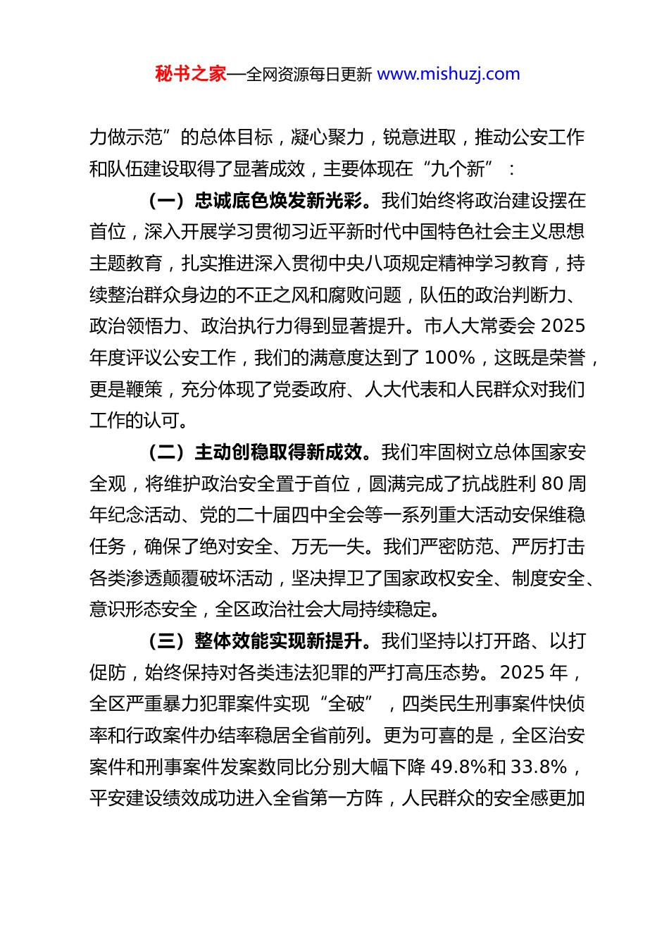 秘书之家—全网资源每日更新 www.mishuzj.comXX 区公安局局长在 2026 年全区公安工作会上的讲话同志们:今天我们召开 2026 年全区公安工作会议,主要任务是:坚持以习近平新时代中国特色社会主义思想为指导,全面贯彻党的二十大和二十届历次全会精神,认真落实四中全会部署,深入贯彻习近平总书记关于新时代公安工作的重要论述和考察河南时的重要讲话精神,总结回顾 2025 年工作,分析当前形势,研究部署 2026 年全区公安工作,动员全局上下乘势而上、再发力、实干争先、开新局,为“十五五”开好局、起好步提供更加坚实的公安支撑。过去的一年,是全区公安机关砥砺奋进、成果丰硕的一年。在示范区党工委、管委会和省公安厅的坚强领导下,全局上下坚持“干字当头、防字为先、实字托底、严字问效”的总要求,推动各项工作实现了新跨越、迈上了新台阶,为维护全区政治安全、社会安定、人民安宁作出了突出贡献。在此,我代表局党委,向辛勤战斗在各自岗位上的全体民警、辅警及家属,表示衷心的感谢并致以崇高的敬意!下面,我讲三个方面的意见。一、回顾 2025,忠诚履职,在攻坚克难中交出优异答卷2025 年,我们紧紧围绕“愚公移山谱写新篇、两高四着秘书之家—全网资源每日更新 www.mishuzj.com力做示范”的总体目标,凝心聚力,锐意进取,推动公安工作和队伍建设取得了显著成效,主要体现在“九个新”:(一)忠诚底色焕发新光彩。我们始终将政治建设摆在首位,深入开展学习贯彻习近平新时代中国特色社会主义思想主题教育,扎实推进深入贯彻中央八项规定精神学习教育,持续整治群众身边的不正之风和腐败问题,队伍的政治判断力、政治领悟力、政治执行力得到显著提升。市人大常委会 2025年度评议公安工作,我们的满意度达到了 100%,这既是荣誉,更是鞭策,充分体现了党委政府、人大代表和人民群众对我们工作的认可。(二)主动创稳取得新成效。我们牢固树立总体国家安全观,将维护政治安全置于首位,圆满完成了抗战胜利 80 周年纪念活动、党的二十届四中全会等一系列重大活动安保维稳任务,确保了绝对安全、万无一失。我们严密防范、严厉打击各类渗透颠覆破坏活动,坚决捍卫了国家政权安全、制度安全、意识形态安全,全区政治社会大局持续稳定。(三)整体效能实现新提升。我们坚持以打开路、以打促防,始终保持对各类违法犯罪的严打高压态势。2025 年,全区严重暴力犯罪案件实现“全破”,四类民生刑事案件快侦率和行政案件办结率稳居全省前列。更为可喜的是,全区治安案件和刑事案件发案数同比分别大幅下降 49.8%和 33.8%,平安建设绩效成功进入全省第一方阵,人民群众的安全感更加秘书之家—全网资源每日更新 www.mishuzj.com充实、更有保障、更可持续。(四)社会治理开创新局面。我们聚焦影响群众安全感的突出问题,深化三项社会治理,取得了明显成效。在打击治理电信网络诈骗犯罪方面,我们坚持打防结合、预防为先,全年电诈发案数同比下降 23.7%,下降幅度位居全省最高,为群众捂紧了“钱袋子”。在公共安全监管方面,我们深化道路交通事故预防“减量控大”工作,亡人交通事故起数、死亡人数分别下降 34.8%和 30.6%。同时,我们坚持和发展新时代“枫桥经验”,深化矛盾纠纷排查化解,全年未发生“民转刑”、“刑转命”案件,基层治理的底板更加牢固。(五)基层基础取得新进展。我们牢固树立“大抓基层、大抓基础”的鲜明导向,持续规范社区警务工作,不断夯实公安工作根基。社区民警沉在社区、干在实处,基层服务管理能力持续加强。在预防未成年人违法犯罪方面,我们推动“家校警社”协同共治,涉未成年人违法犯罪人数下降幅度、占本地全部违法犯罪人数比例、涉犯罪未成年人数下降幅度三项关键指标均排名全省第一,为青少年健康成长营造了良好环境。(六)新质战斗力取得新突破。我们向科技要警力、向改革要战斗力,构建完善了“情指行”一体化警务运行机制,启动了覆盖全区的视频监控维保工程,公安工作的科技含量和现代化水平显著提升。各警种专业能力在实战中得到锤炼,治安、经侦、特巡警、环食药等警种在全省业务比武中屡获佳绩。秘书之家—全...