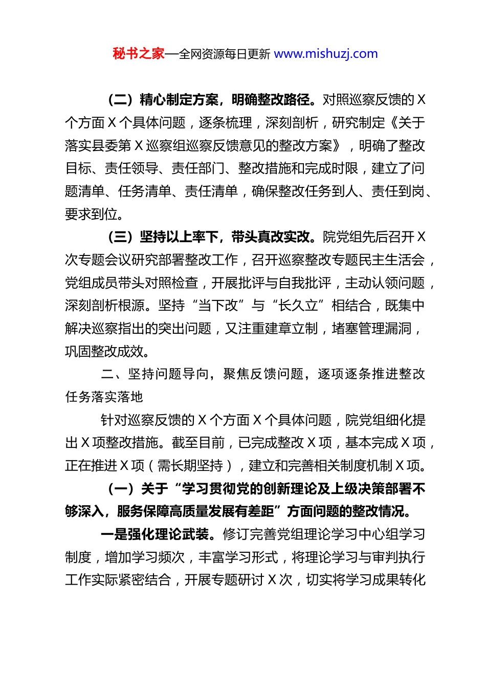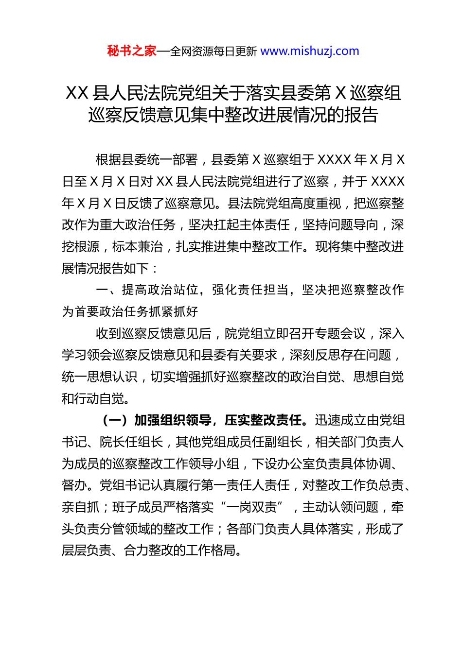 秘书之家—全网资源每日更新 www.mishuzj.comXX 县人民法院党组关于落实县委第 X 巡察组巡察反馈意见集中整改进展情况的报告根据县委统一部署,县委第 X 巡察组于 XXXX 年 X 月 X日至 X 月 X 日对 XX 县人民法院党组进行了巡察,并于 XXXX年 X 月 X 日反馈了巡察意见。县法院党组高度重视,把巡察整改作为重大政治任务,坚决扛起主体责任,坚持问题导向,深挖根源,标本兼治,扎实推进集中整改工作。现将集中整改进展情况报告如下:一、提高政治站位,强化责任担当,坚决把巡察整改作为首要政治任务抓紧抓好收到巡察反馈意见后,院党组立即召开专题会议,深入学习领会巡察反馈意见和县委有关要求,深刻反思存在问题,统一思想认识,切实增强抓好巡察整改的政治自觉、思想自觉和行动自觉。(一)加强组织领导,压实整改责任。迅速成立由党组书记、院长任组长,其他党组成员任副组长,相关部门负责人为成员的巡察整改工作领导小组,下设办公室负责具体协调、督办。党组书记认真履行第一责任人责任,对整改工作负总责、亲自抓;班子成员严格落实“一岗双责”,主动认领问题,牵头负责分管领域的整改工作;各部门负责人具体落实,形成了层层负责、合力整改的工作格局。秘书之家—全网资源每日更新 www.mishuzj.com(二)精心制定方案,明确整改路径。对照巡察反馈的 X个方面 X 个具体问题,逐条梳理,深刻剖析,研究制定《关于落实县委第 X 巡察组巡察反馈意见的整改方案》,明确了整改目标、责任领导、责任部门、整改措施和完成时限,建立了问题清单、任务清单、责任清单,确保整改任务到人、责任到岗、要求到位。(三)坚持以上率下,带头真改实改。院党组先后召开 X次专题会议研究部署整改工作,召开巡察整改专题民主生活会,党组成员带头对照检查,开展批评与自我批评,主动认领问题,深刻剖析根源。坚持“当下改”与“长久立”相结合,既集中解决巡察指出的突出问题,又注重建章立制,堵塞管理漏洞,巩固整改成效。二、坚持问题导向,聚焦反馈问题,逐项逐条推进整改任务落实落地针对巡察反馈的 X 个方面 X 个具体问题,院党组细化提出 X 项整改措施。截至目前,已完成整改 X 项,基本完成 X 项,正在推进 X 项(需长期坚持),建立和完善相关制度机制 X 项。(一)关于“学习贯彻党的创新理论及上级决策部署不够深入,服务保障高质量发展有差距”方面问题的整改情况。一是强化理论武装。修订完善党组理论学习中心组学习制度,增加学习频次,丰富学习形式,将理论学习与审判执行工作实际紧密结合,开展专题研讨 X 次,切实将学习成果转化秘书之家—全网资源每日更新 www.mishuzj.com为推动工作的思路和举措。二是提升服务大局实效。围绕县委中心工作,制定出台《关于为 XX 县高质量发展提供司法服务和保障的若干意见》,在优化营商环境、服务乡村振兴、防范化解重大风险等方面提出 X 项具体司法举措。审结相关案件 XX 件,取得了阶段性成效。三是深化司法体制改革。针对反馈的司法责任制落实不够精细问题,修订完善审判权力和责任清单,强化院庭长监督管理职责,优化专业法官会议和审判委员会工作机制,提升审判质效。X-X 月,全院案件结收比、一审服判息诉率等核心指标同比提升。(二)关于“履行全面从严治党‘两个责任’不够到位,司法作风建设有待加强”方面问题的整改情况。一是压实主体责任。召开全院党风廉政建设工作会议,党组书记与班子成员、班子成员与分管部门负责人层层签订党风廉政建设责任书。每季度专题研究全面从严治党工作,分析研判廉政风险点。二是强化监督执纪。支持派驻纪检监察组履行监督责任,运用监督执纪“四种形态”,对苗头性、倾向性问题及时谈话提醒。集中整改期间,开展廉政谈话 XX 人次,通报典型案例X 次。三是持续改进司法作风。开展司法作风突出问题专项整秘书之家—全网资源每日更新 www.mishuzj.com治,聚焦庭审规范、诉讼服务、文书质量等方面,组织明察暗访 X 次,通报并整改问题 X 个。畅通当事人监督渠道,回访案件当事人 XX 人次,群众满意度有所提升。(三)关于“落...