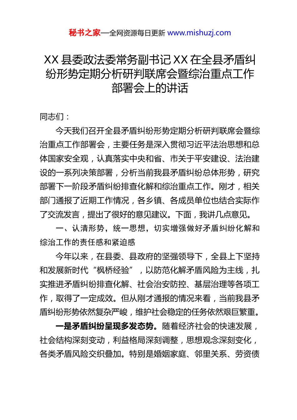 秘书之家—全网资源每日更新 www.mishuzj.comXX 县委政法委常务副书记 XX 在全县矛盾纠纷形势定期分析研判联席会暨综治重点工作部署会上的讲话同志们:今天我们召开全县矛盾纠纷形势定期分析研判联席会暨综治重点工作部署会,主要任务是深入贯彻习近平法治思想和总体国家安全观,认真落实中央和省、市关于平安建设、法治建设的一系列决策部署,分析当前我县矛盾纠纷总体形势,研究部署下一阶段矛盾纠纷排查化解和综治重点工作。刚才,相关部门通报了近期工作情况,各乡镇、各成员单位也结合实际作了交流发言,提出了很好的意见建议。下面,我讲几点意见。一、认清形势,统一思想,切实增强做好矛盾纠纷化解和综治工作的责任感和紧迫感今年以来,在县委、县政府的坚强领导下,全县上下坚持和发展新时代“枫桥经验”,以防范化解矛盾风险为主线,扎实推进矛盾纠纷排查化解、社会治安防控、基层治理等各项工作,取得了一定成效。但从刚才通报的情况来看,当前我县矛盾纠纷形势依然复杂严峻,维护社会稳定的任务依然艰巨繁重。一是矛盾纠纷呈现多发态势。随着经济社会的快速发展,社会结构深刻变动,利益格局深刻调整,思想观念深刻变化,各类矛盾风险交织叠加。特别是婚姻家庭、邻里关系、劳资债秘书之家—全网资源每日更新 www.mishuzj.com务、草场纠纷等重点领域,矛盾多发频发,调处难度不断加大。部分矛盾纠纷如不及时化解,极易引发“民转刑”案件,甚至群体性事件。二是风险隐患存量增量并存。一些历史遗留问题尚未彻底解决,新的矛盾又不断出现。部分领域风险隐患隐蔽性强、关联度高,一旦爆发,传导速度快、波及范围广,对社会稳定造成冲击。尤其是在当前经济下行压力加大的背景下,劳资纠纷、债务纠纷等经济类矛盾可能进一步凸显。三是基层治理基础仍需夯实。部分乡镇和村(社区)在矛盾排查、信息报送、源头预防等方面还存在薄弱环节,网格化管理作用发挥不够充分,人民调解、行政调解、司法调解衔接不够顺畅,综治中心规范化实体化运行有待加强,基层治理体系和治理能力现代化水平仍需提升。面对新形势新任务新挑战,我们必须保持清醒头脑,深刻认识做好矛盾纠纷化解和综治工作的极端重要性。这是贯彻习近平法治思想的必然要求,是落实总体国家安全观的具体行动,是建设更高水平平安 XX、法治 XX 的坚实基础,更是维护群众切身利益、促进社会公平正义的现实需要。全县上下要始终绷紧安全稳定这根弦,以高度的政治责任感和历史使命感,切实把这项工作抓紧抓实抓出成效。二、聚焦重点,靶向发力,扎实推动矛盾纠纷排查化解走深走实秘书之家—全网资源每日更新 www.mishuzj.com做好矛盾纠纷排查化解工作,关键在于“预防在前、调解优先、依法处置、源头治理”。我们要坚持问题导向,紧盯重点领域、重点人群、重点环节,下好先手棋,打好主动仗。(一)坚持预防为主,筑牢源头防线。要健全完善常态化排查机制,组织力量下沉到村(社区)、网格、工地、牧区等一线,做到“底数清、情况明、早发现、早调处”。要充分发挥网格员、人民调解员、村(社区)干部、“法律明白人”等基层力量的作用,织密织牢矛盾纠纷排查网络。要加强对重点领域、重点行业、重点群体的动态监测和分析研判,及时发现苗头性、倾向性问题,提前介入、有效干预,防止小事拖大、大事拖炸。(二)坚持调解优先,多元化解纷争。要充分发挥人民调解“第一道防线”作用,健全完善县、乡、村三级调解网络,提高调解工作的专业化、规范化水平。要积极拓展行业性、专业性调解组织,在劳动争议、交通事故、医疗纠纷、物业管理等领域,引入专业力量参与调解。要健全诉调对接、警调对接、访调对接机制,推动行政调解、司法调解与人民调解有效衔接、优势互补。要探索“互联网+调解”模式,为当事人提供更加便捷高效的调解服务。对于调解不成的矛盾纠纷,要引导当事人依法理性表达诉求,通过诉讼、仲裁等法律途径解决,防止矛盾激化。(三)坚持依法处置,维护法治权威。要善于运用法治思秘书之家—全网资源每日更新 www.mishuzj.com维和法治方式化解矛盾、维护稳定。在处理信访问题、化解矛盾纷争时,要严格...