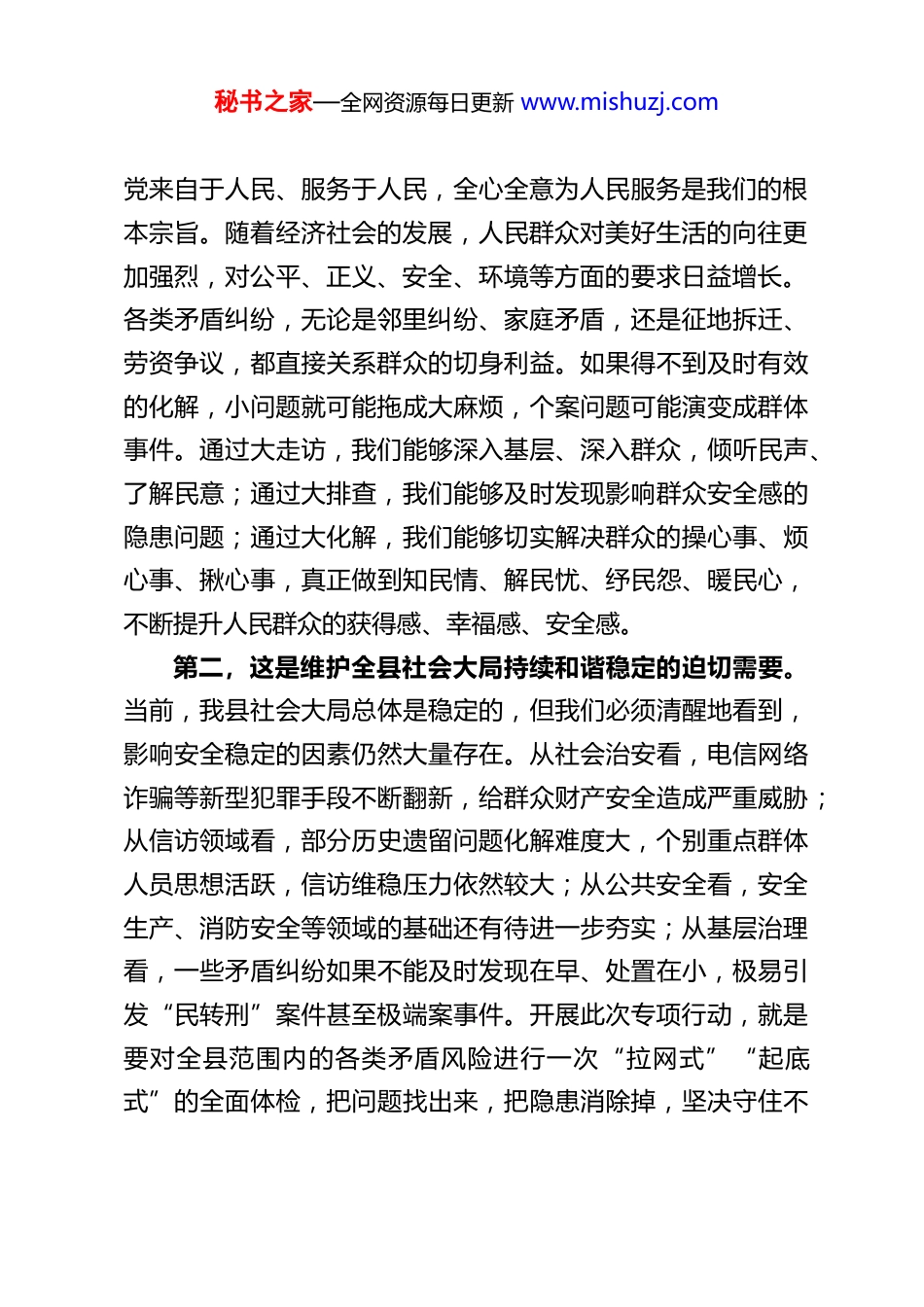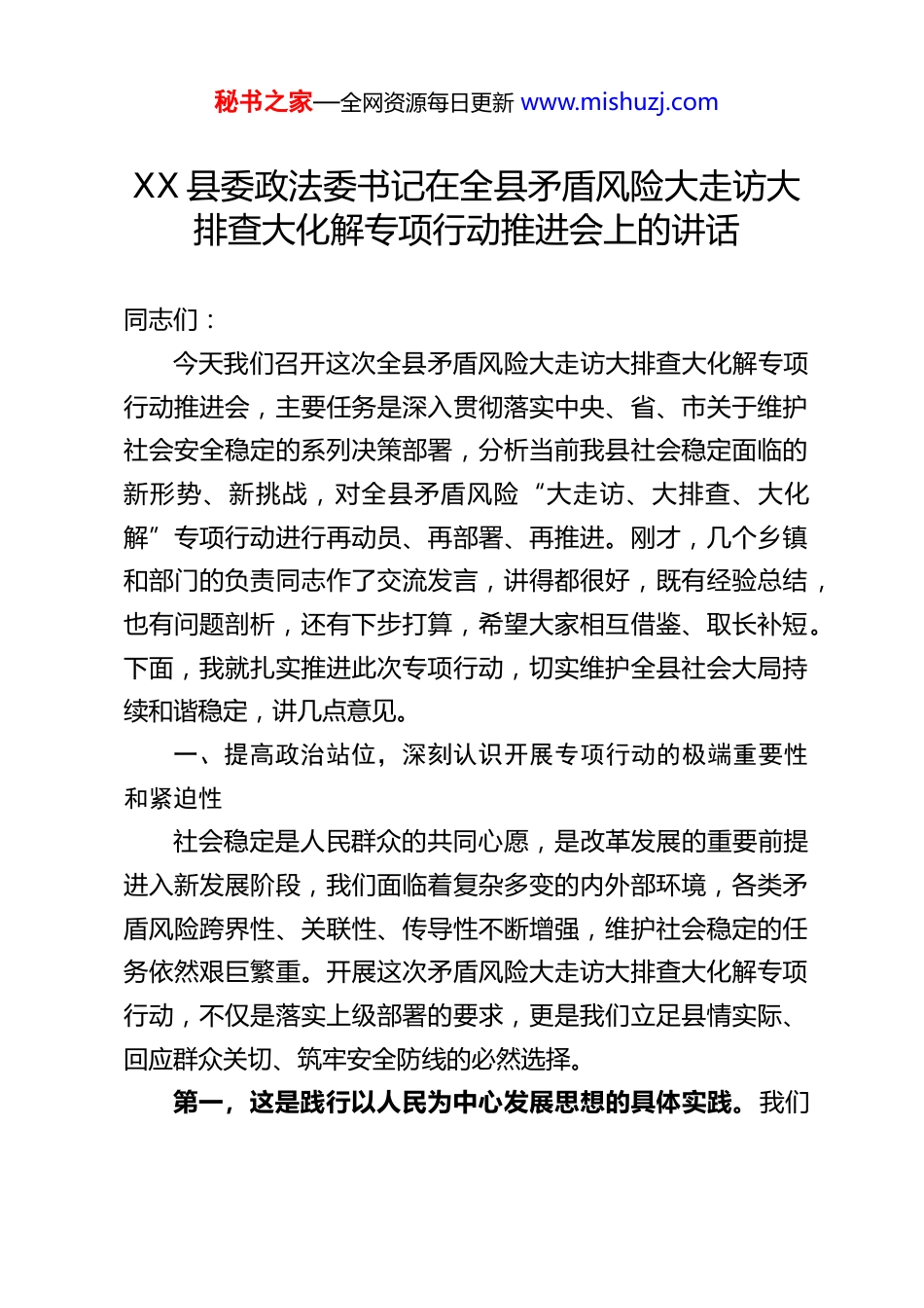 秘书之家—全网资源每日更新 www.mishuzj.comXX 县委政法委书记在全县矛盾风险大走访大排查大化解专项行动推进会上的讲话同志们:今天我们召开这次全县矛盾风险大走访大排查大化解专项行动推进会,主要任务是深入贯彻落实中央、省、市关于维护社会安全稳定的系列决策部署,分析当前我县社会稳定面临的新形势、新挑战,对全县矛盾风险“大走访、大排查、大化解”专项行动进行再动员、再部署、再推进。刚才,几个乡镇和部门的负责同志作了交流发言,讲得都很好,既有经验总结,也有问题剖析,还有下步打算,希望大家相互借鉴、取长补短。下面,我就扎实推进此次专项行动,切实维护全县社会大局持续和谐稳定,讲几点意见。一、提高政治站位,深刻认识开展专项行动的极端重要性和紧迫性社会稳定是人民群众的共同心愿,是改革发展的重要前提进入新发展阶段,我们面临着复杂多变的内外部环境,各类矛盾风险跨界性、关联性、传导性不断增强,维护社会稳定的任务依然艰巨繁重。开展这次矛盾风险大走访大排查大化解专项行动,不仅是落实上级部署的要求,更是我们立足县情实际、回应群众关切、筑牢安全防线的必然选择。第一,这是践行以人民为中心发展思想的具体实践。我们秘书之家—全网资源每日更新 www.mishuzj.com党来自于人民、服务于人民,全心全意为人民服务是我们的根本宗旨。随着经济社会的发展,人民群众对美好生活的向往更加强烈,对公平、正义、安全、环境等方面的要求日益增长。各类矛盾纠纷,无论是邻里纠纷、家庭矛盾,还是征地拆迁、劳资争议,都直接关系群众的切身利益。如果得不到及时有效的化解,小问题就可能拖成大麻烦,个案问题可能演变成群体事件。通过大走访,我们能够深入基层、深入群众,倾听民声、了解民意;通过大排查,我们能够及时发现影响群众安全感的隐患问题;通过大化解,我们能够切实解决群众的操心事、烦心事、揪心事,真正做到知民情、解民忧、纾民怨、暖民心,不断提升人民群众的获得感、幸福感、安全感。第二,这是维护全县社会大局持续和谐稳定的迫切需要。当前,我县社会大局总体是稳定的,但我们必须清醒地看到,影响安全稳定的因素仍然大量存在。从社会治安看,电信网络诈骗等新型犯罪手段不断翻新,给群众财产安全造成严重威胁;从信访领域看,部分历史遗留问题化解难度大,个别重点群体人员思想活跃,信访维稳压力依然较大;从公共安全看,安全生产、消防安全等领域的基础还有待进一步夯实;从基层治理看,一些矛盾纠纷如果不能及时发现在早、处置在小,极易引发“民转刑”案件甚至极端案事件。开展此次专项行动,就是要对全县范围内的各类矛盾风险进行一次“拉网式”“起底式”的全面体检,把问题找出来,把隐患消除掉,坚决守住不秘书之家—全网资源每日更新 www.mishuzj.com发生系统性风险、不发生重大恶性案件和个人极端暴力案件的底线。第三,这是提升我县社会治理现代化水平的重要抓手。基层治理是国家治理的基石。矛盾风险的排查化解能力,是衡量基层治理水平的重要标尺。过去,我们在工作中积累了一些好经验、好做法,但也存在信息壁垒、部门分割、手段单一等问题。此次专项行动,强调“全量起底”“全程闭环”“一人一策”,强调统筹联动、协同推进,这本身就是对我们治理理念、治理方式、治理能力的一次全面检验和提升。通过专项行动,我们可以进一步健全完善矛盾纠纷多元化解机制,推动治理重心下移、资源下沉,织密织牢基层防控网络,探索建立常态化、长效化的矛盾风险排查化解工作体系,不断提升我县社会治理的系统化、科学化、法治化水平。第四,这是考验干部作风和能力的重要战场。专项行动能否取得实效,关键在人,关键在干部的作风和能力。大走访,要求我们放下架子、扑下身子,深入田间地头、工厂车间、社区楼院,与群众面对面交流,这检验的是我们的群众观念和工作作风。大排查,要求我们敏锐洞察、见微知著,能够从纷繁复杂的现象中发现问题、找准症结,这检验的是我们的业务能力和专业素养。大化解,要求我们敢于担当、善于作为,综合运用法律、政策、经济、行政等手段,有效化解各类矛盾,这检验的是我们的攻坚克难...
