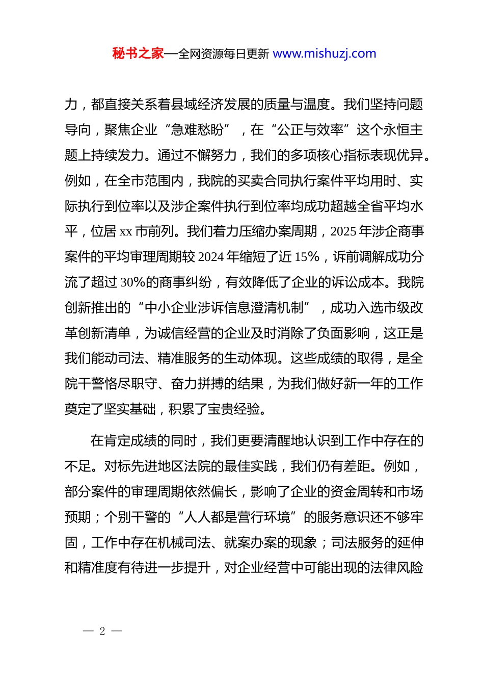秘书之家—全网资源每日更新 www.mishuzj.com在 xx 县人民法院 2026 年营商环境工作部署会上的讲话同志们:今天我们在这里召开 2026 年营商环境工作部署会,主要任务是全面总结过去一年的工作成效,深刻剖析当前面临的形势与挑战,系统部署新一年的目标任务,动员全院上下进一步统一思想、凝聚共识、压实责任,以决战决胜的姿态,推动我院司法服务保障营商环境工作再上新台阶、再创新局面。刚刚,xx 同志全面通报了 2025 年及今年 1 月份我院营商环境工作的整体情况,系统梳理了我们取得的成绩,也毫不回避地指出了存在的短板弱项,并对 2026 年的监测评价指标提出了明确的目标。我完全同意。过去的一年,面对复杂严峻的宏观经济形势和艰巨繁重的审判执行任务,全院干警迎难而上、主动作为,围绕中心、服务大局,推动营商环境司法保障工作取得了显著成效。在此,我代表院*组,向为之付出辛勤努力的全院同志们,表示衷心的感谢!回顾 2025 年,我们深刻体会到,优化营商环境的每一分努— 1 —秘书之家—全网资源每日更新 www.mishuzj.com力,都直接关系着县域经济发展的质量与温度。我们坚持问题导向,聚焦企业“急难愁盼”,在“公正与效率”这个永恒主题上持续发力。通过不懈努力,我们的多项核心指标表现优异。例如,在全市范围内,我院的买卖合同执行案件平均用时、实际执行到位率以及涉企案件执行到位率均成功超越全省平均水平,位居 xx 市前列。我们着力压缩办案周期,2025 年涉企商事案件的平均审理周期较 2024 年缩短了近 15%,诉前调解成功分流了超过 30%的商事纠纷,有效降低了企业的诉讼成本。我院创新推出的“中小企业涉诉信息澄清机制”,成功入选市级改革创新清单,为诚信经营的企业及时消除了负面影响,这正是我们能动司法、精准服务的生动体现。这些成绩的取得,是全院干警恪尽职守、奋力拼搏的结果,为我们做好新一年的工作奠定了坚实基础,积累了宝贵经验。在肯定成绩的同时,我们更要清醒地认识到工作中存在的不足。对标先进地区法院的最佳实践,我们仍有差距。例如,部分案件的审理周期依然偏长,影响了企业的资金周转和市场预期;个别干警的“人人都是营行环境”的服务意识还不够牢固,工作中存在机械司法、就案办案的现象;司法服务的延伸和精准度有待进一步提升,对企业经营中可能出现的法律风险— 2 —秘书之家—全网资源每日更新 www.mishuzj.com预警和防范指导还不够深入;部门之间在优化营商环境工作上的协同作战能力还需加强,存在“上热下冷”、力度不均的问题。这些问题,是我们前进道路上必须搬开的“绊脚石”,也是我们 2026 年工作中必须着力破解的“硬骨头”同志们,法治是最好的营商环境。******多次强调,“法治化环境最能聚人聚财、最有利于发展”。县委县政府也把优化营商环境作为推动高质量发展的“生命线工程”来抓。人民法院作为国家审判机关,是法治化营商环境建设的主力军、排头兵,我们肩负的责任无比重大,使命无上光荣。2026 年是实施“十四五”规划的关键一年,也是我县经济转型升级、爬坡过坎的重要时期。我们必须以“时时放心不下”的责任感和“事事落实到位”的执行力,把思想和行动统一到中央、省委、市委和县委的决策部署上来,将优化营商环境工作摆在更加突出、更加核心的位置。下面,围绕 2026 年的工作,我讲四点意见。一、提高政治站位,在服务发展大局中彰显新担当优化营商环境不仅是经济问题,更是重要的政治问题。全院干警必须胸怀“国之大者”,深刻领会优化营商环境对于巩— 3 —秘书之家—全网资源每日更新 www.mishuzj.com固经济回升向好态势、推动县域经济高质量发展的极端重要性,切实把思想和行动统一到服务中心大局上来。第一,要树立“全院一盘棋”的大局意识。营商环境没有旁观者,人人都是建设者,案案都是试金石。要彻底摒弃“营商环境只是个别业务部门的事”的错误观念,引导全院干警,无论是在立案窗口、审判法庭,还是在执行现场、后勤保障岗位,都要牢固树立“人人都是营商环境、案案关乎发展大局”的理念。要将这种理念内化于心、外化于行,融入到每一次接待、每...