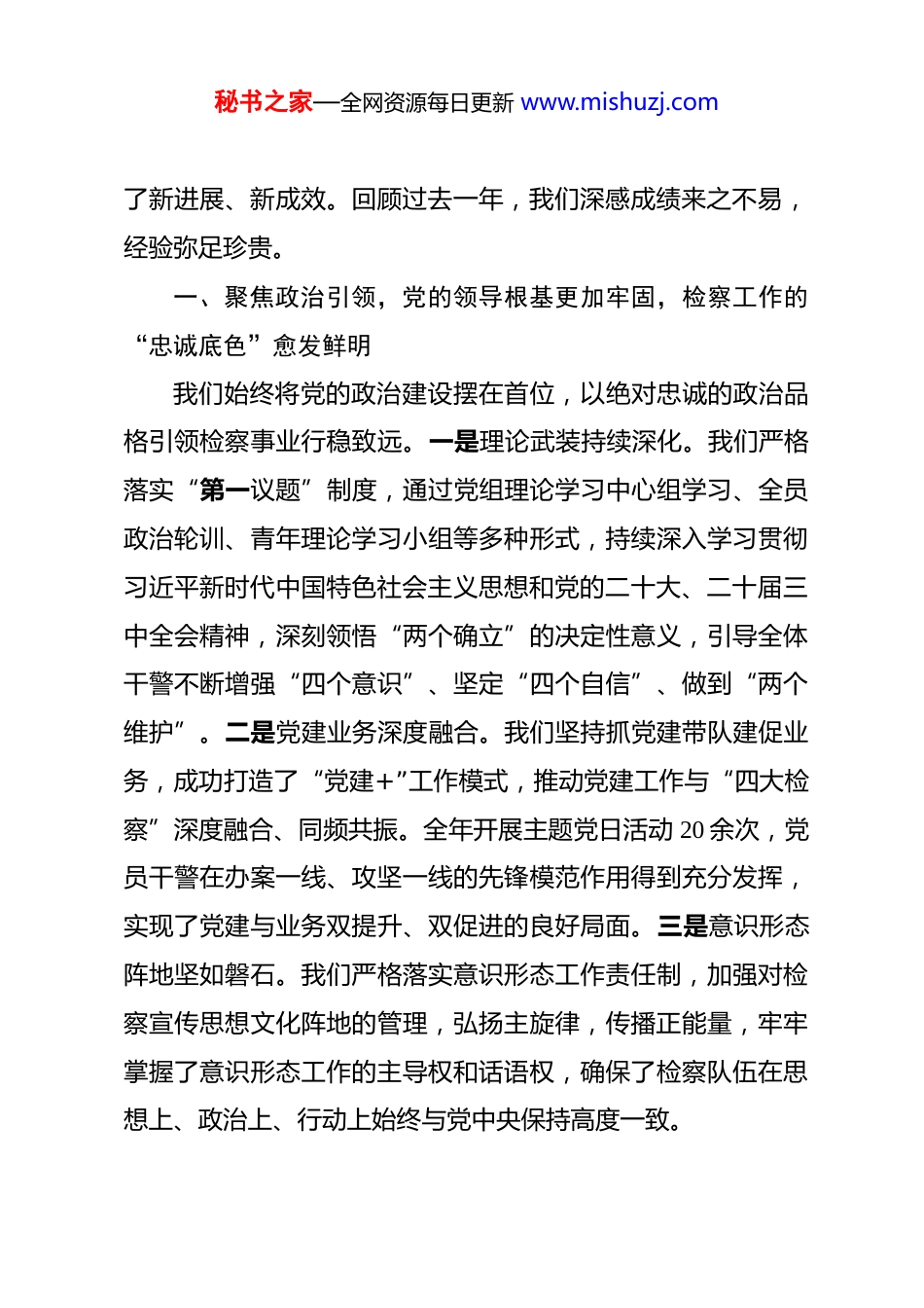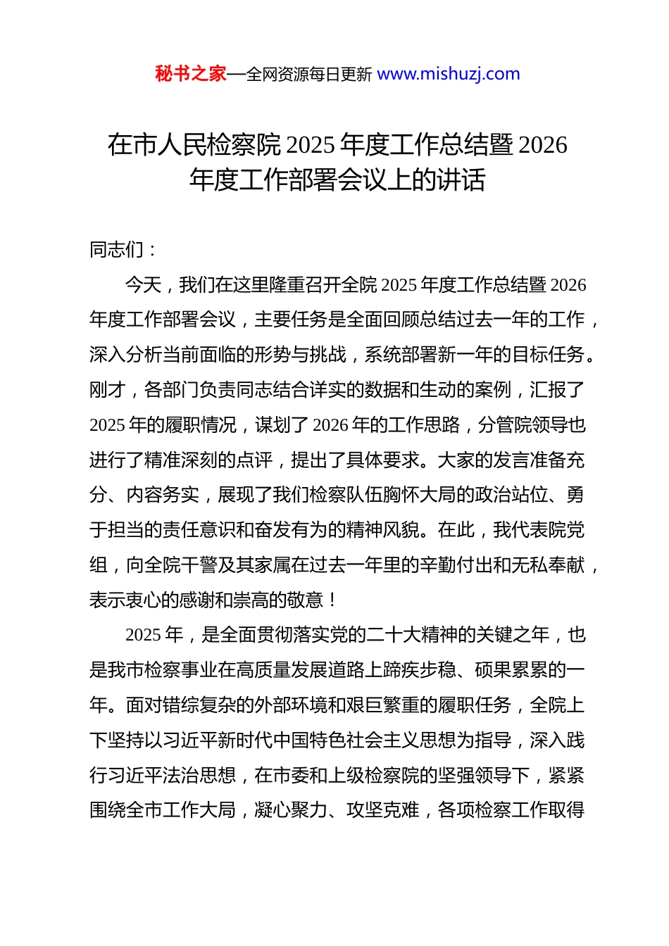 秘书之家—全网资源每日更新 www.mishuzj.com在市人民检察院 2025 年度工作总结暨 2026年度工作部署会议上的讲话 同志们:今天,我们在这里隆重召开全院 2025 年度工作总结暨 2026年度工作部署会议,主要任务是全面回顾总结过去一年的工作,深入分析当前面临的形势与挑战,系统部署新一年的目标任务。刚才,各部门负责同志结合详实的数据和生动的案例,汇报了2025 年的履职情况,谋划了 2026 年的工作思路,分管院领导也进行了精准深刻的点评,提出了具体要求。大家的发言准备充分、内容务实,展现了我们检察队伍胸怀大局的政治站位、勇于担当的责任意识和奋发有为的精神风貌。在此,我代表院党组,向全院干警及其家属在过去一年里的辛勤付出和无私奉献,表示衷心的感谢和崇高的敬意!2025 年,是全面贯彻落实党的二十大精神的关键之年,也是我市检察事业在高质量发展道路上蹄疾步稳、硕果累累的一年。面对错综复杂的外部环境和艰巨繁重的履职任务,全院上下坚持以习近平新时代中国特色社会主义思想为指导,深入践行习近平法治思想,在市委和上级检察院的坚强领导下,紧紧围绕全市工作大局,凝心聚力、攻坚克难,各项检察工作取得秘书之家—全网资源每日更新 www.mishuzj.com了新进展、新成效。回顾过去一年,我们深感成绩来之不易,经验弥足珍贵。一、聚焦政治引领,党的领导根基更加牢固,检察工作的“忠诚底色”愈发鲜明我们始终将党的政治建设摆在首位,以绝对忠诚的政治品格引领检察事业行稳致远。一是理论武装持续深化。我们严格落实“第一议题”制度,通过党组理论学习中心组学习、全员政治轮训、青年理论学习小组等多种形式,持续深入学习贯彻习近平新时代中国特色社会主义思想和党的二十大、二十届三中全会精神,深刻领悟“两个确立”的决定性意义,引导全体干警不断增强“四个意识”、坚定“四个自信”、做到“两个维护”。二是党建业务深度融合。我们坚持抓党建带队建促业务,成功打造了“党建+”工作模式,推动党建工作与“四大检察”深度融合、同频共振。全年开展主题党日活动 20 余次,党员干警在办案一线、攻坚一线的先锋模范作用得到充分发挥,实现了党建与业务双提升、双促进的良好局面。三是意识形态阵地坚如磐石。我们严格落实意识形态工作责任制,加强对检察宣传思想文化阵地的管理,弘扬主旋律,传播正能量,牢牢掌握了意识形态工作的主导权和话语权,确保了检察队伍在思想上、政治上、行动上始终与党中央保持高度一致。秘书之家—全网资源每日更新 www.mishuzj.com二、聚焦中心大局,服务保障发展的“检察担当”更加彰显我们自觉将检察工作置于全市经济社会发展大局中谋划和推进,以高水平的能动履职为**市高质量发展提供了坚实的司法保障。一是维护社会安全稳定坚决有力。我们常态化推进扫黑除恶斗争,严厉打击各类严重暴力犯罪、多发性侵财犯罪以及电信网络诈骗、养老诈骗等群众反映强烈的犯罪活动。全年共批准逮捕各类刑事犯罪嫌疑人 512 人,提起公诉 1536 人,有力维护了社会大局的持续稳定和人民群众的生命财产安全。二是优化法治化营商环境精准有效。我们出台了服务保障民营经济健康发展的实施意见,坚持依法平等保护各类市场主体。审慎适用查封、扣押、冻结等强制措施,最大限度减少对企业正常生产经营活动的影响。依法办理涉企案件,对 10 余名涉嫌犯罪但符合从宽处理条件的民营企业负责人依法作出不捕不诉决定,以法治“活水”激发了市场“活力”。三是保障和改善民生用心用情。我们积极回应人民群众对美好生活的新期待,持续做优“民生检察”。全年办理支持起诉案件 50 余件,为农民工、残疾人等弱势群体追索劳动报酬、维护合法权益提供了有力支持。深化司法救助工作,全年共为 30 余名因案致贫的被害人及其家属发放司法救助金近 50 万元,并积极与民政、妇联等秘书之家—全网资源每日更新 www.mishuzj.com部门协作,构建了多元化的救助格局,让检察司法的温度直抵民心。三、聚焦主责主业,法律监督的“检察力量”更加强劲我们牢牢把握“法律监督机关”的宪法定位,以“高质效办好每一个案件”为基本价值追求,推动...