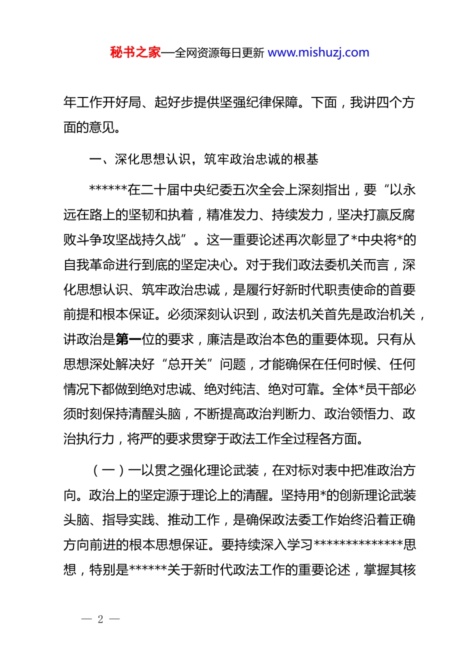 秘书之家—全网资源每日更新 www.mishuzj.com在市委政法委机关 2026 年春节前廉政警示教育大会上的*课讲稿同志们:在 2026 年春节即将来临之际,我们召开市委政法委机关廉政警示教育大会,这既是一次深化全面从严治*、加强*风廉政建设的专题*课,也是一次在重要时间节点敲响警钟、筑牢防线的集体谈话。节点就是“考点”,年关亦是“廉关”。节日期间人情往来密集,往往是“四风”问题易发多发的敏感期,更是检验我们政法干部*性原则、纪律作风的关键时刻。我们必须清醒认识到,政法委机关作为*委领导和管理政法工作的职能部门,地位特殊、责任重大,机关的作风形象直接影响全市政法系统的政治生态,直接影响人民群众对公平正义的获得感。今天,我们齐聚一堂,主要目的是深入学习领会******关于*的自我革命的重要思想,贯彻落实二十届中央纪委五次全会最新部署要求,以案为鉴、以案明纪,教育引导机关全体*员干部特别是领导干部,进一步增强廉洁自律意识和拒腐防变能力,大力弘扬清风正气,坚决抵制歪风邪气,确保节日风清气正,为全— 1 —秘书之家—全网资源每日更新 www.mishuzj.com年工作开好局、起好步提供坚强纪律保障。下面,我讲四个方面的意见。一、深化思想认识,筑牢政治忠诚的根基******在二十届中央纪委五次全会上深刻指出,要“以永远在路上的坚韧和执着,精准发力、持续发力,坚决打赢反腐败斗争攻坚战持久战”。这一重要论述再次彰显了*中央将*的自我革命进行到底的坚定决心。对于我们政法委机关而言,深化思想认识、筑牢政治忠诚,是履行好新时代职责使命的首要前提和根本保证。必须深刻认识到,政法机关首先是政治机关,讲政治是第一位的要求,廉洁是政治本色的重要体现。只有从思想深处解决好“总开关”问题,才能确保在任何时候、任何情况下都做到绝对忠诚、绝对纯洁、绝对可靠。全体*员干部必须时刻保持清醒头脑,不断提高政治判断力、政治领悟力、政治执行力,将严的要求贯穿于政法工作全过程各方面。(一)一以贯之强化理论武装,在对标对表中把准政治方向。政治上的坚定源于理论上的清醒。坚持用*的创新理论武装头脑、指导实践、推动工作,是确保政法委工作始终沿着正确方向前进的根本思想保证。要持续深入学习**************思想,特别是******关于新时代政法工作的重要论述,掌握其核— 2 —秘书之家—全网资源每日更新 www.mishuzj.com心要义、精神实质、丰富内涵、实践要求。要深刻领悟“两个确立”的决定性意义,增强“四个意识”、坚定“四个自信”、做到“两个维护”,自觉在思想上政治上行动上同以***同志为核心的*中央保持高度一致。要将理论学习与贯彻落实《中国共产*政法工作条例》紧密结合,不断加深对*的领导是政法工作最高原则、最大优势的理解,确保*的路线方针政策在政法系统得到不折不扣的执行。要建立健全常态化长效化学习机制,通过理论学习中心组学习、支部“三会一课”、专题研讨、个人自学等多种形式,推动理论学习往深里走、往实里走、往心里走。要大力弘扬马克思主义学风,坚持理论联系实际,把学习成果转化为谋划工作的思路、破解难题的办法、推动发展的举措,切实提高运用*的创新理论解决政法工作实际问题的能力。要坚决反对形式主义、官僚主义,防止学习“走过场”、“一阵风”,确保学有所思、学有所悟、学有所得。通过扎实有效的理论武装,使机关全体*员干部的理想信念更加牢固,政治立场更加坚定,始终做*的理论和路线方针政策的忠实拥护者、坚定执行者。(二)一刻不停锤炼*性修养,在自我革命中永葆政治本色。*性是*员干部立身、立业、立言、立德的基石。政法委机关的*— 3 —秘书之家—全网资源每日更新 www.mishuzj.com员干部,身处维护国家政治安全、确保社会大局稳定、促进社会公平正义、保障人民安居乐业的第一线,锤炼坚强*性尤为重要。要自觉加强*性锻炼,不断提高*性修养,经常对照*章*规dj 检视自己的思想和行为,用*性原则修身律己,切实增强*内政治生活的政治性、时代性、原则性、战斗性。要严肃认真参加*的组织生活,严格执行民主集中制,认真落实“三会一课”、民主生活会、组织生活会、谈心...