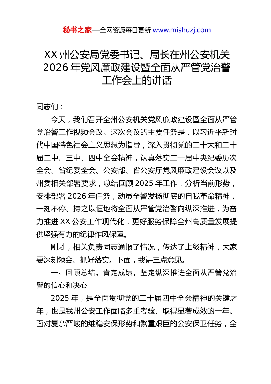 秘书之家—全网资源每日更新 www.mishuzj.comXX 州公安局党委书记、局长在州公安机关2026 年党风廉政建设暨全面从严管党治警工作会上的讲话同志们:今天,我们召开全州公安机关党风廉政建设暨全面从严管党治警工作视频会议。这次会议的主要任务是:以习近平新时代中国特色社会主义思想为指导,深入贯彻党的二十大和二十届二中、三中、四中全会精神,认真落实二十届中央纪委历次全会、省纪委全会、公安部、省公安厅党风廉政建设会议以及州委相关部署要求,总结回顾 2025 年工作,分析当前形势,安排部署 2026 年任务,动员全警发扬彻底的自我革命精神,一刻不停、持之以恒地将全面从严管党治警向纵深推进,为奋力推进 XX 公安工作现代化,更好服务保障全州高质量发展提供坚强有力的纪律作风保障。刚才,相关负责同志通报了情况,传达了上级精神,大家要深刻领会、抓好落实。下面,我讲三点意见。一、回顾总结,肯定成绩,坚定纵深推进全面从严管党治警的信心和决心2025 年,是全面贯彻党的二十届四中全会精神的关键之年,也是我州公安工作面临多重考验、取得显著成效的一年。面对复杂严峻的维稳安保形势和繁重艰巨的公安保卫任务,全秘书之家—全网资源每日更新 www.mishuzj.com州公安机关在州委、州政府和省公安厅党委的坚强领导下,坚决扛起管党治警政治责任,始终坚持严的主基调不动摇,推动党风廉政建设和反腐败斗争取得了新进展、新成效。一是政治建警得到新加强。我们始终将政治建设摆在首位,坚持不懈用党的创新理论武装头脑,深入开展学习贯彻习近平新时代中国特色社会主义思想主题教育常态化长效化工作,教育引导全警深刻领悟“两个确立”的决定性意义,增强“四个意识”、坚定“四个自信”、做到“两个维护”的政治自觉、思想自觉、行动自觉不断提升。严格执行《关于新形势下党内政治生活的若干准则》等党内法规,严肃党内政治生活,严明政治纪律和政治规矩,全州公安机关广大民警辅警的忠诚警魂在理论滋养和实践淬炼中铸得更加牢固。二是纪律作风展现新面貌。我们以钉钉子精神贯彻中央八项规定及其实施细则精神,持续深化纠治“四风”。紧盯“节日腐败”和顽瘴痼疾,纵深推进违规吃喝、违规收送礼品礼金等突出问题专项整治,对隐形变异问题高度警惕、露头就打。大力整治群众身边的不正之风和腐败问题,针对执法办案、窗口服务、基层所队管理等环节存在的“微腐败”和作风顽疾,开展了一系列专项整治行动,群众对公安工作的满意度进一步提升。狠抓会风会纪、内务管理等细节,队伍的纪律意识、规矩意识和精神风貌有了明显改善。三是反腐惩恶取得新成效。我们坚持无禁区、全覆盖、零秘书之家—全网资源每日更新 www.mishuzj.com容忍,保持惩治腐败高压态势。精准运用监督执纪“四种形态”,特别是在用好第一种形态上下更大功夫,让“红脸出汗”成为常态,抓早抓小、防微杜渐。对不收敛、不收手、不知止的,发现一起、查处一起,绝不姑息。严肃查处了一批违纪违法案件,形成了强大震慑。同时,做好执纪审查“后半篇文章”,深化以案促改、以案促治,加强警示教育,用身边事教育身边人,一体推进不敢腐、不能腐、不想腐的体制机制建设得到巩固。四是监督体系实现新优化。我们自觉接受、积极配合十四届州委第五轮巡察和州委政法委政治督察,对反馈的问题照单全收、立行立改、真改实改,并以此为契机,全面排查整改各类风险隐患。着力健全公安特色大监督格局,推动党委主体责任、书记第一责任人责任、班子成员“一岗双责”和纪检、督察、审计、法制、信访等监督责任协同发力。内部监督力量得到整合,监督的精准性和有效性不断增强。民警日常教育管理监督机制进一步完善,廉政风险防控的“防火墙”更加牢固。五是问题整改获得新进展。对于上级巡视巡察、政治督察、执法检查、审计监督等反馈的问题,我们建立台账、明确责任、限定时限,以高度的政治自觉狠抓整改落实。不仅解决具体问题,更注重举一反三,从制度机制上找原因、堵漏洞,实现了整改一个问题、完善一套制度、规范一片领域的效果,有效促进了公安工作的整体提升。秘书之家—全网资源每日更新 www.mishuzj...
