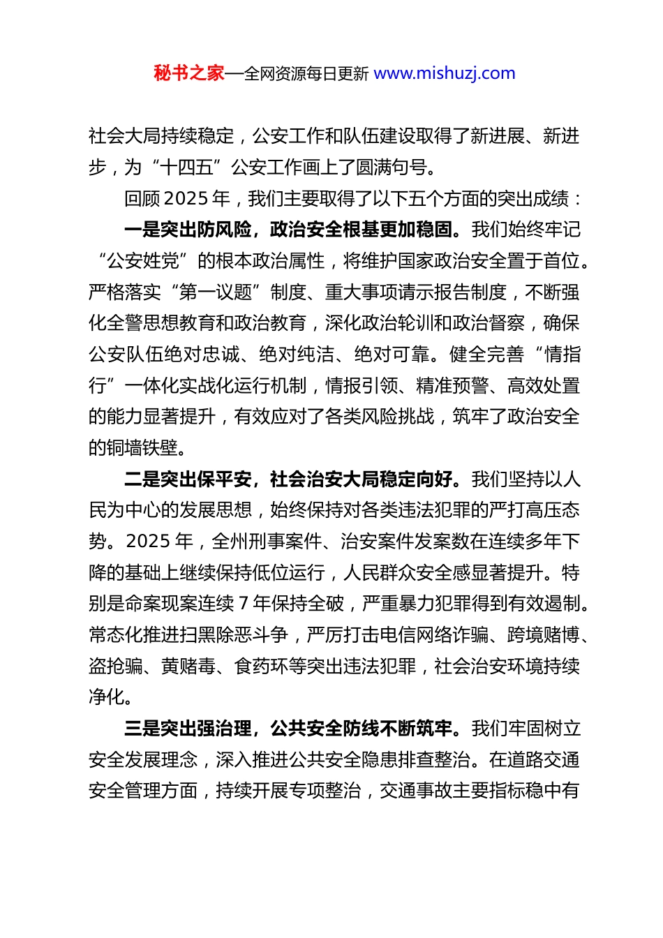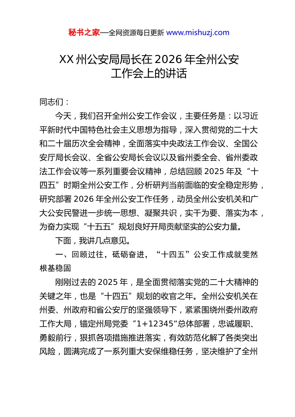 秘书之家—全网资源每日更新 www.mishuzj.comXX 州公安局局长在 2026 年全州公安工作会上的讲话同志们:今天,我们召开全州公安工作会议,主要任务是:以习近平新时代中国特色社会主义思想为指导,深入贯彻党的二十大和二十届历次全会精神,全面落实中央政法工作会议、全国公安厅局长会议、全省公安局长会议以及省州委全会、省州委政法工作会议等一系列重要会议精神,总结回顾 2025 年及“十四五”时期全州公安工作,分析研判当前面临的安全稳定形势,研究部署 2026 年全州公安工作任务,动员全州公安机关和广大公安民警进一步统一思想、凝聚共识,实干为要、落实为本,为奋力实现“十五五”规划良好开局贡献坚实的公安力量。下面,我讲几点意见。一、回顾过往,砥砺奋进,“十四五”公安工作成就斐然根基稳固刚刚过去的 2025 年,是全面贯彻落实党的二十大精神的关键之年,也是“十四五”规划的收官之年。全州公安机关在州委、州政府和省公安厅的坚强领导下,紧紧围绕州委州政府工作大局,锚定州局党委“1+12345”总体部署,忠诚履职、勇毅前行,狠抓各项措施推进落实,有效防范化解了各类突出风险,圆满完成了一系列重大安保维稳任务,坚决维护了全州秘书之家—全网资源每日更新 www.mishuzj.com社会大局持续稳定,公安工作和队伍建设取得了新进展、新进步,为“十四五”公安工作画上了圆满句号。回顾 2025 年,我们主要取得了以下五个方面的突出成绩:一是突出防风险,政治安全根基更加稳固。我们始终牢记“公安姓党”的根本政治属性,将维护国家政治安全置于首位。严格落实“第一议题”制度、重大事项请示报告制度,不断强化全警思想教育和政治教育,深化政治轮训和政治督察,确保公安队伍绝对忠诚、绝对纯洁、绝对可靠。健全完善“情指行”一体化实战化运行机制,情报引领、精准预警、高效处置的能力显著提升,有效应对了各类风险挑战,筑牢了政治安全的铜墙铁壁。二是突出保平安,社会治安大局稳定向好。我们坚持以人民为中心的发展思想,始终保持对各类违法犯罪的严打高压态势。2025 年,全州刑事案件、治安案件发案数在连续多年下降的基础上继续保持低位运行,人民群众安全感显著提升。特别是命案现案连续 7 年保持全破,严重暴力犯罪得到有效遏制。常态化推进扫黑除恶斗争,严厉打击电信网络诈骗、跨境赌博、盗抢骗、黄赌毒、食药环等突出违法犯罪,社会治安环境持续净化。三是突出强治理,公共安全防线不断筑牢。我们牢固树立安全发展理念,深入推进公共安全隐患排查整治。在道路交通安全管理方面,持续开展专项整治,交通事故主要指标稳中有秘书之家—全网资源每日更新 www.mishuzj.com降。在危爆物品、大型活动、新兴业态安全监管方面,创新手段,压实责任,未发生重大公共安全事故。积极推动公共安全治理模式向事前预防转型,加强预测预警预防,公共安全整体防控能力迈上新台阶。四是突出抓整合,公安机构改革纵深推进。我们坚决贯彻落实党中央关于深化公安改革的决策部署,“十四五”时期公安机构改革任务全面完成,警力资源配置更加优化,警务运行机制更加高效。一批信息化、智能化项目建设落地应用,科技兴警战略成效显现。长期困扰基层的警力不足问题得到有效缓解,派出所“两队一室”改革、“一村一警”战略、“智慧小区”建设有序推进,基层基础不断夯实,公安工作高质量发展的根基更加牢固。五是突出促发展,服务高质量发展有力有效。我们自觉将公安工作置于全州经济社会发展大局中谋划推进,不断优化营商环境。深化公安“放管服”改革,推出了一系列便民利企新举措,在户籍、交管、出入境等领域提供更加便捷高效的服务。依法保护各类市场主体合法权益,严厉打击经济金融领域犯罪,为全州经济高质量发展营造了安全稳定的社会环境、公平正义的法治环境、优质高效的服务环境。同志们,2025 年的成绩是“十四五”时期全州公安工作辉煌成就的缩影。回首过去的五年,我们走过的历程极不平凡,取得的成就振奋人心:秘书之家—全网资源每日更新 www.mishuzj.com这五年,是捍卫政治安全坚定有力的五年。全州公安机关忠诚核心、拥戴核心、维护核心、...