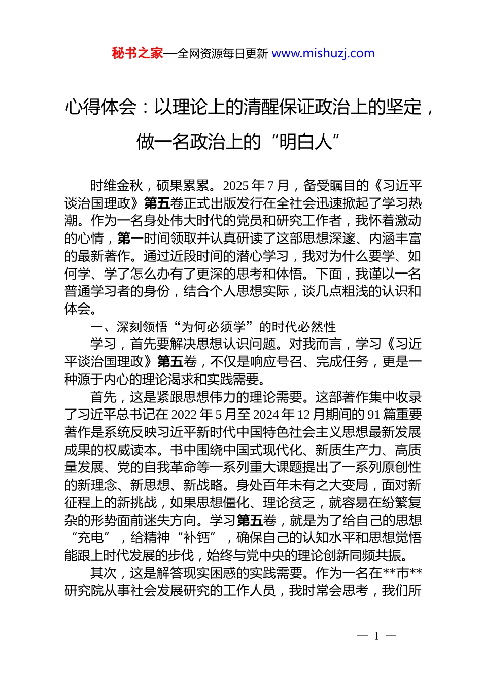 秘书之家—全网资源每日更新 www.mishuzj.com心得体会:以理论上的清醒保证政治上的坚定,做一名政治上的“明白人”时维金秋,硕果累累。2025 年 7 月,备受瞩目的《习近平谈治国理政》第五卷正式出版发行在全社会迅速掀起了学习热潮。作为一名身处伟大时代的党员和研究工作者,我怀着激动的心情,第一时间领取并认真研读了这部思想深邃、内涵丰富的最新著作。通过近段时间的潜心学习,我对为什么要学、如何学、学了怎么办有了更深的思考和体悟。下面,我谨以一名普通学习者的身份,结合个人思想实际,谈几点粗浅的认识和体会。一、深刻领悟“为何必须学”的时代必然性学习,首先要解决思想认识问题。对我而言,学习《习近平谈治国理政》第五卷,不仅是响应号召、完成任务,更是一种源于内心的理论渴求和实践需要。首先,这是紧跟思想伟力的理论需要。这部著作集中收录了习近平总书记在 2022 年 5 月至 2024 年 12 月期间的 91 篇重要著作是系统反映习近平新时代中国特色社会主义思想最新发展成果的权威读本。书中围绕中国式现代化、新质生产力、高质量发展、党的自我革命等一系列重大课题提出了一系列原创性的新理念、新思想、新战略。身处百年未有之大变局,面对新征程上的新挑战,如果思想僵化、理论贫乏,就容易在纷繁复杂的形势面前迷失方向。学习第五卷,就是为了给自己的思想“充电”,给精神“补钙”,确保自己的认知水平和思想觉悟能跟上时代发展的步伐,始终与党中央的理论创新同频共振。其次,这是解答现实困惑的实践需要。作为一名在**市**研究院从事社会发展研究的工作人员,我时常会思考,我们所— 1 —秘书之家—全网资源每日更新 www.mishuzj.com处的**地区,如何在国家发展大局中找准定位?如何将本地的资源禀赋转化为高质量发展的现实动力?第五卷中的许多篇章,都给了我深刻的启示。比如,关于“因地制宜发展新质生产力”的系统阐述,就为思考区域经济转型升级提供了根本遵循。学习这部著作,不是为了寻找现成的答案,而是为了学习其中蕴含的世界观和方法论掌握分析问题、解决问题的“金钥匙”,从而更好地指导自己的研究工作,破解实践中遇到的难题。最后,这是淬炼党性修养的政治需要。第五卷通篇贯穿着对党和人民的无限忠诚、对理想信念的执着坚守。深入学习,能帮助我更深刻领悟“两个确立”的决定性意义,从而更自觉地增强“四个意识”、坚定“四个自信”、做到“两个维护”。这并非一句空洞的口号,而是在具体工作和生活中,始终心怀“国之大者”,把个人发展融入国家和民族的事业之中,在任何风浪考验面前都站得稳、靠得住。二、全身心投入“怎样学得深”的科学方法论好的学习,必然要有好的方法。中共中央办公厅转发的通知中要求,要把第五卷与第一至第四卷作为一个整体,读原著、学原文、悟原理,做到学思用贯通、知信行统一。在学习过程中,我努力遵循这一要求,力求学深悟透。一是坚持原原本本学,力求领会精髓。我为自己制定了学习计划,每天固定时间静心阅读。对于卷中首次公开发表的重要文稿我更是反复研读,逐字逐句地体会其间的微言大义。比如,开卷第一篇便是党的二十大报告,它作为全书的总纲为后续 18 个专题铺开了宏大的时代背景。只有沉下心来通读全篇,才能理解各专题论述的逻辑起点和宏观视野。我将书中的重点论述和经典话语摘抄在读书笔记上,时常翻阅,加深理解和记忆。二是坚持联系贯通学,力求把握体系。习近平新时代中国特色社会主义思想是一个博大精深的科学体系。我将第五卷的— 2 —秘书之家—全网资源每日更新 www.mishuzj.com学习与前四卷结合起来,对照阅读。我发现,许多重要思想是一以贯之、不断深化的。例如,关于以人民为中心的发展思想,在第五卷“落实以人民为中心的发展思想,不断提高人民生活品质”专题中,就有了更加具体和深入的部署。通过这种贯通学习,我对这一思想的理论脉络和实践演进有了更为整体和系统的把握,认识到党的创新理论所具有的强大生命力和开放性。三是坚持带着问题学,力求找到答案。学习不能满足于“知道了”,更要追问“为什么”和“怎么办”。我在学习中,始终带着问题...