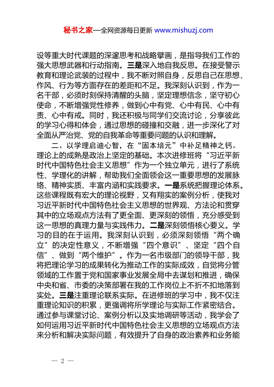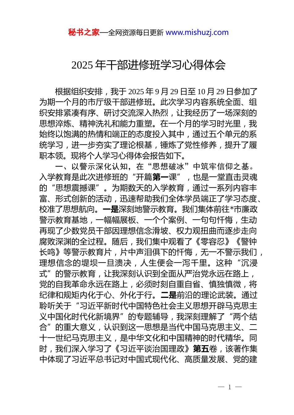 秘书之家—全网资源每日更新 www.mishuzj.com2025 年干部进修班学习心得体会根据组织安排,我于 2025 年 9 月 29 日至 10 月 29 日参加了为期一个月的市厅级干部进修班。此次学习内容系统全面、组织安排紧凑有序、研讨交流深入热烈,让我经历了一场深刻的思想淬炼、精神洗礼和能力重塑。在一个月的学习时光里,我始终以饱满的热情和端正的态度投入其中,通过五个单元的系统学习,进一步夯实了理论根基,锤炼了党性修养,提升了履职本领。现将个人学习心得体会报告如下。一、以警示深化认知,在“思想破冰”中筑牢信仰之基。入学教育是此次进修班的“开篇第一课”,也是一堂直击灵魂的“思想震撼课”。为期数天的入学教育,通过一系列内容丰富、形式创新的活动,迅速帮助我们全体学员端正了学习态度、校准了思想航向。一是深刻地警示教育。我们集体前往*市廉政警示教育基地,一幅幅展板、一个个案例、一句句忏悔,生动再现了少数党员干部因理想信念滑坡、权力观扭曲而逐步走向腐败深渊的全过程。随后,我们集中观看了《零容忍》《警钟长鸣》等警示教育片,片中声泪俱下的忏悔,无一不警示我们,理想信念的堤坝一旦溃决,人生便会一泻千里。这种“沉浸式”的警示教育,让我深刻认识到全面从严治党永远在路上,党的自我革命永远在路上,必须时刻自重自省、慎独慎微,将纪律和规矩内化于心、外化于行。二是前沿的理论武装。通过聆听关于“习近平新时代中国特色社会主义思想开辟马克思主义中国化时代化新境界”的专题辅导,我深刻理解了“两个结合”的重大意义,认识到这一思想是当代中国马克思主义、二十一世纪马克思主义,是中华文化和中国精神的时代精华。同时,我们深入学习了《习近平谈治国理政》第五卷,该著作集中体现了习近平总书记对中国式现代化、高质量发展、党的建— 1 —秘书之家—全网资源每日更新 www.mishuzj.com设等重大时代课题的深邃思考和战略擘画,是指导我们工作的强大思想武器和行动指南。三是深入地自我反思。在接受警示教育和理论武装的过程中,我不断对照自身,反思自己在思想、作风、行为等方面存在的差距和不足。我深刻认识到,作为一名干部,必须时刻保持清醒的头脑,坚定理想信念,坚守初心使命,不断增强党性修养,做到心中有党、心中有民、心中有责、心中有戒。同时,我还积极与同学们交流讨论,分享彼此的学习心得和体会,通过思想的碰撞和交融,进一步深化了对全面从严治党、党的自我革命等重要问题的认识和理解。二、以学理启迪心智,在“固本培元”中补足精神之钙。理论上的成熟是政治上坚定的基础。本次进修班将“习近平新时代中国特色社会主义思想”作为一个独立单元,进行了系统性、学理化的讲解,帮助我们全面领会这一重要思想的发展脉络、精神实质、丰富内涵和实践要求。一是系统把握理论体系。这些课程既有宏大的理论视野,又有翔实的案例分析,使我对习近平新时代中国特色社会主义思想的世界观、方法论和贯穿其中的立场观点方法有了更全面、更深刻的领悟,充分感受到这一思想的真理力量与实践伟力。二是深刻领悟核心要义。学习的目的在于运用。我深刻认识到,必须深刻领悟“两个确立”的决定性意义,不断增强“四个意识”、坚定“四个自信”、做到“两个维护”。作为一名市级部门的领导干部,我将把理论学习的成果转化为推动工作的实际成效,自觉将分管领域的工作置于党和国家事业发展全局中去谋划和推进,确保中央和省、市委的决策部署在我的工作岗位上不折不扣地落到实处。三是注重理论联系实际。在进修班的学习中,我不仅注重理论知识的积累,更强调将所学理论与实际工作紧密结合。通过参与课堂讨论、案例分析以及实地调研等活动,我学会了如何运用习近平新时代中国特色社会主义思想的立场观点方法来分析和解决实际问题,有效提升了自身的政治素养和业务能— 2 —秘书之家—全网资源每日更新 www.mishuzj.com力。四是持续深化学习成果。学习是一个永无止境的过程,我将把在进修班学到的知识和方法作为新的起点,持续深化对习近平新时代中国特色社会主义思想的学习和研究,不断拓宽学习领域,深化学习层次,确保自己的...