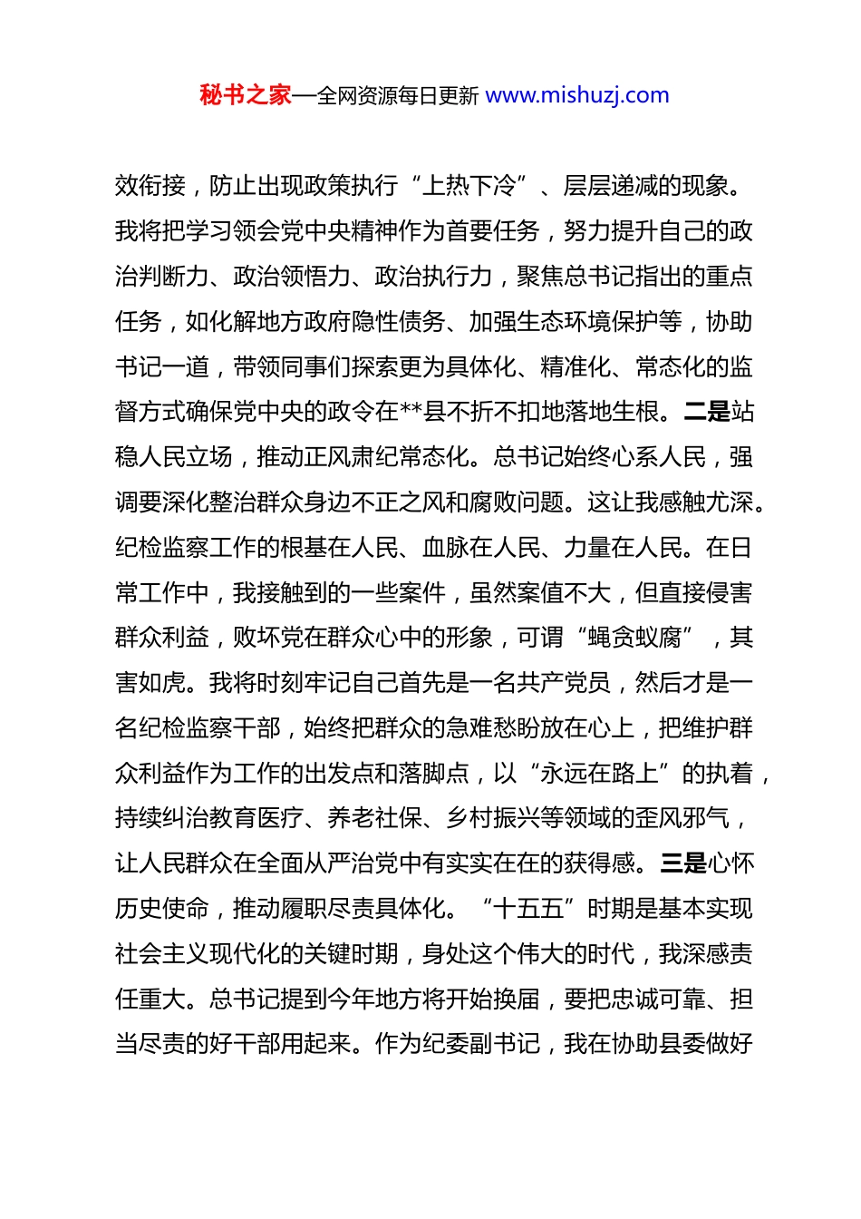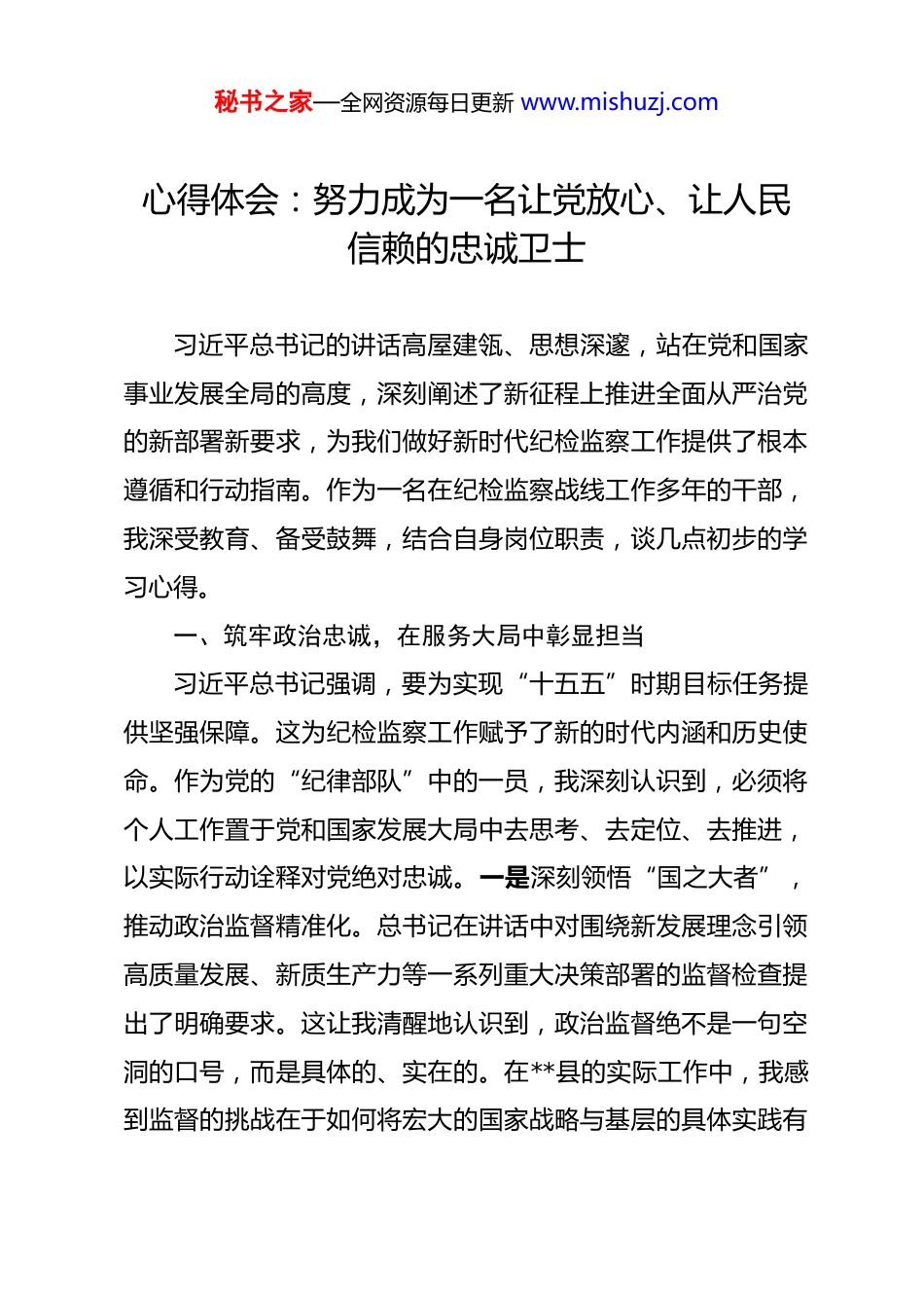 秘书之家—全网资源每日更新 www.mishuzj.com心得体会:努力成为一名让党放心、让人民信赖的忠诚卫士 习近平总书记的讲话高屋建瓴、思想深邃,站在党和国家事业发展全局的高度,深刻阐述了新征程上推进全面从严治党的新部署新要求,为我们做好新时代纪检监察工作提供了根本遵循和行动指南。作为一名在纪检监察战线工作多年的干部,我深受教育、备受鼓舞,结合自身岗位职责,谈几点初步的学习心得。一、筑牢政治忠诚,在服务大局中彰显担当习近平总书记强调,要为实现“十五五”时期目标任务提供坚强保障。这为纪检监察工作赋予了新的时代内涵和历史使命。作为党的“纪律部队”中的一员,我深刻认识到,必须将个人工作置于党和国家发展大局中去思考、去定位、去推进,以实际行动诠释对党绝对忠诚。一是深刻领悟“国之大者”,推动政治监督精准化。总书记在讲话中对围绕新发展理念引领高质量发展、新质生产力等一系列重大决策部署的监督检查提出了明确要求。这让我清醒地认识到,政治监督绝不是一句空洞的口号,而是具体的、实在的。在**县的实际工作中,我感到监督的挑战在于如何将宏大的国家战略与基层的具体实践有秘书之家—全网资源每日更新 www.mishuzj.com效衔接,防止出现政策执行“上热下冷”、层层递减的现象。我将把学习领会党中央精神作为首要任务,努力提升自己的政治判断力、政治领悟力、政治执行力,聚焦总书记指出的重点任务,如化解地方政府隐性债务、加强生态环境保护等,协助书记一道,带领同事们探索更为具体化、精准化、常态化的监督方式确保党中央的政令在**县不折不扣地落地生根。二是站稳人民立场,推动正风肃纪常态化。总书记始终心系人民,强调要深化整治群众身边不正之风和腐败问题。这让我感触尤深。纪检监察工作的根基在人民、血脉在人民、力量在人民。在日常工作中,我接触到的一些案件,虽然案值不大,但直接侵害群众利益,败坏党在群众心中的形象,可谓“蝇贪蚁腐”,其害如虎。我将时刻牢记自己首先是一名共产党员,然后才是一名纪检监察干部,始终把群众的急难愁盼放在心上,把维护群众利益作为工作的出发点和落脚点,以“永远在路上”的执着,持续纠治教育医疗、养老社保、乡村振兴等领域的歪风邪气,让人民群众在全面从严治党中有实实在在的获得感。三是心怀历史使命,推动履职尽责具体化。“十五五”时期是基本实现社会主义现代化的关键时期,身处这个伟大的时代,我深感责任重大。总书记提到今年地方将开始换届,要把忠诚可靠、担当尽责的好干部用起来。作为纪委副书记,我在协助县委做好秘书之家—全网资源每日更新 www.mishuzj.com干部选拔任用党风廉政意见回复工作中,必须严守标准、严格把关。我将以对党的事业高度负责、对同志的政治生命高度负责的态度,认真履行监督职责,把功夫下在平时,动态掌握干部的思想、工作、作风和生活状况,为县委选准人、用好人提供准确参考,以履职尽责的实际成效,为**县的政治生态持续向好贡献自己的力量。二、砥砺斗争精神,在自我革命中净化肌体习近平总书记指出,反腐败是一场输不起也决不能输的重大斗争。面对依然严峻复杂的反腐败斗争形势,作为一名纪检监察干部,必须发扬彻底的自我革命精神,敢于斗争、善于斗争,在攻坚战、持久战中不断取得新胜利。一是坚持标本兼治,在“不敢腐”上持续加压。总书记强调要保持高压态势不动摇,有腐必反、有贪必肃。我深知,任何一丝一毫的松懈都可能导致前功尽弃。在县一级,人情社会、圈子文化等对执纪执法工作的干扰和挑战客观存在。我将时刻提醒自己,在原则问题上绝不能有半点含糊和退让。无论面对何种阻力,都要坚定斗争意志,敢于较真碰硬,以事实为依据,以纪法为准绳,协助查办好每一个案件,坚决清除党员干部队伍中的害群之马,持续释放“越往后执纪越严”的强烈信号,让那些心存侥幸者不敢越雷池半步。二是坚持系统施治,在“不能腐”上扎紧笼子。秘书之家—全网资源每日更新 www.mishuzj.com总书记深刻指出,党的自我革命重在治权,要把权力关进制度笼子。回顾我参与查办的一些案件,很多都暴露出重点领域、关键岗位的制度漏洞和监管缺失。我认...