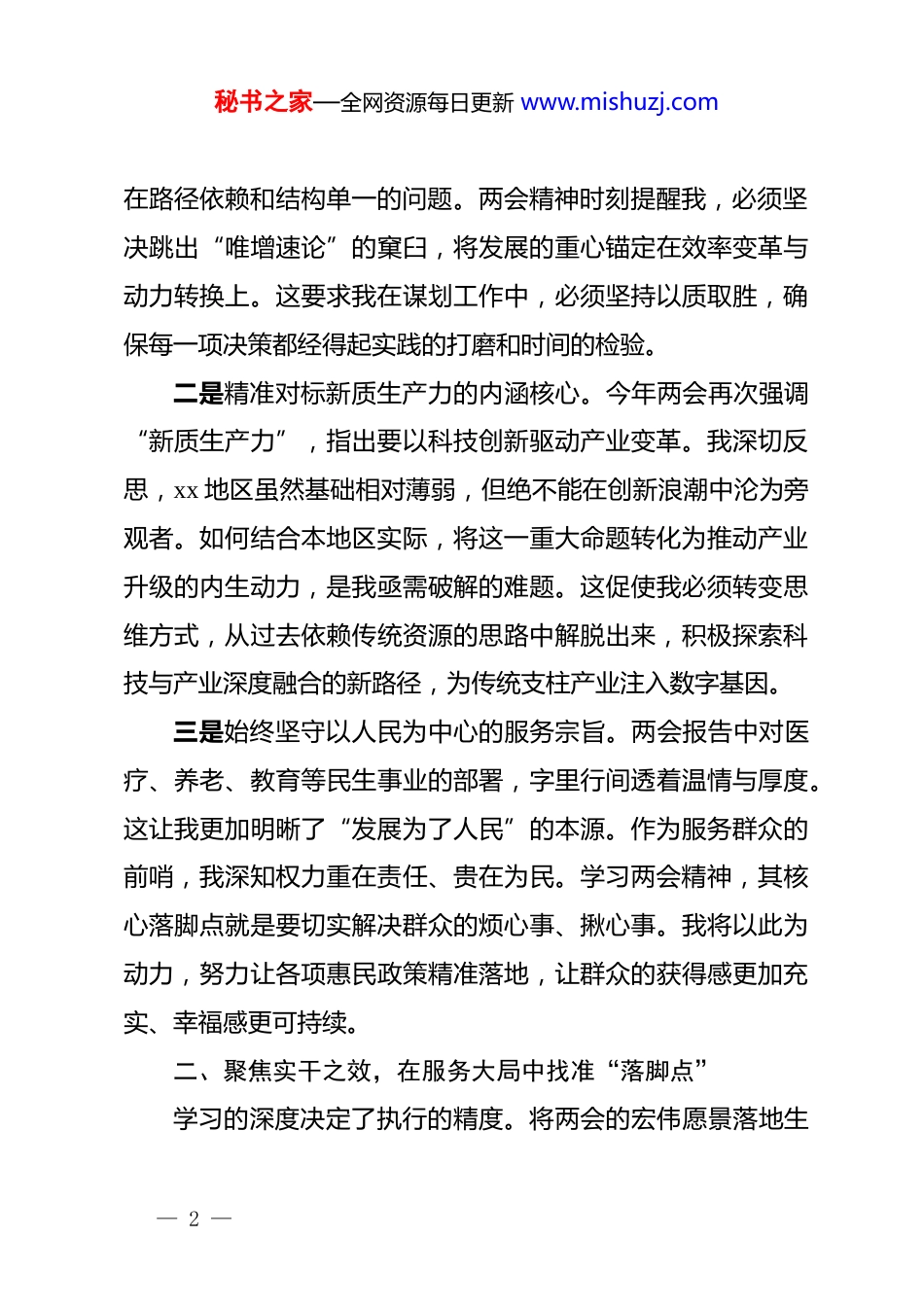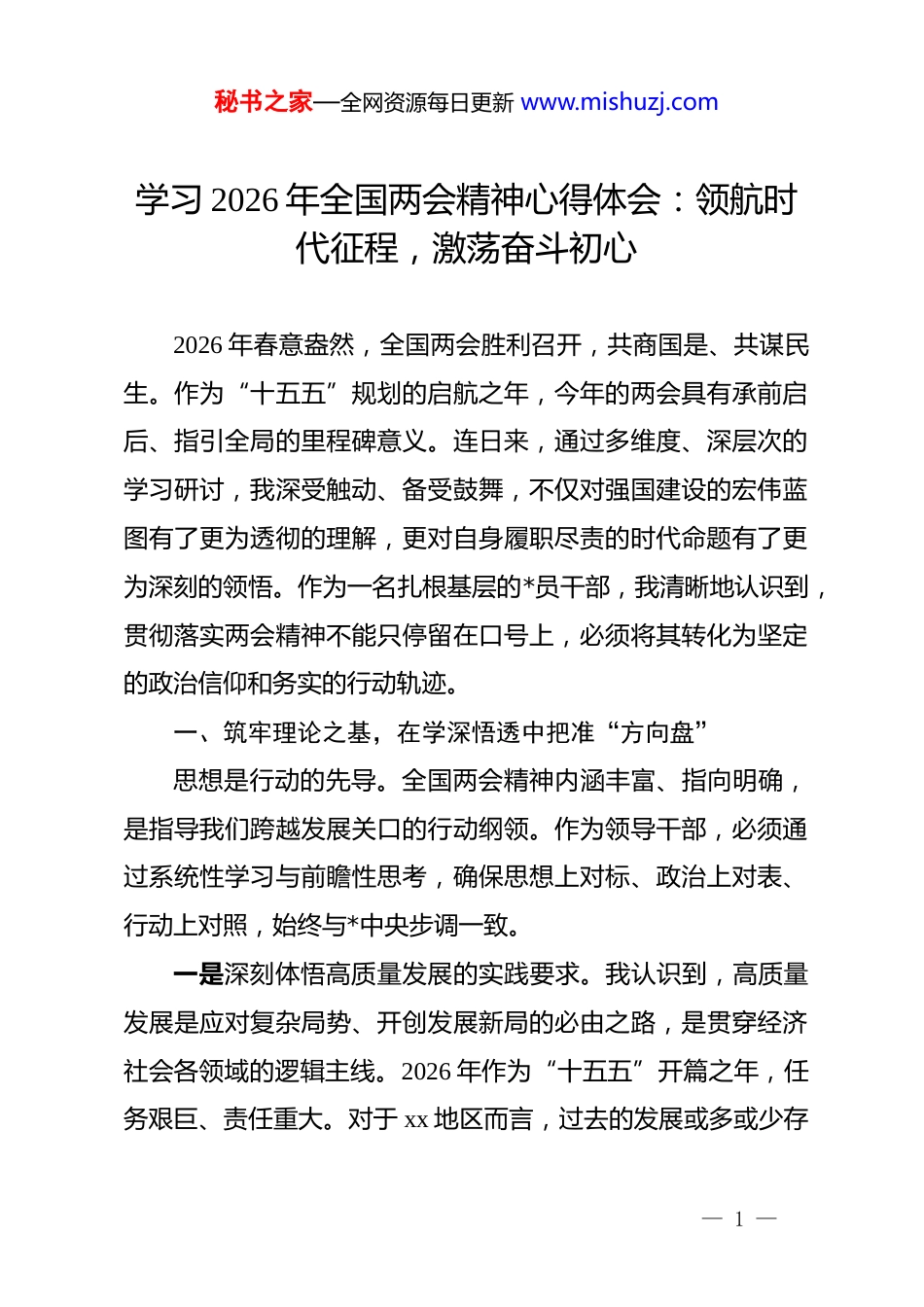 秘书之家—全网资源每日更新 www.mishuzj.com学习 2026 年全国两会精神心得体会:领航时代征程,激荡奋斗初心2026 年春意盎然,全国两会胜利召开,共商国是、共谋民生。作为“十五五”规划的启航之年,今年的两会具有承前启后、指引全局的里程碑意义。连日来,通过多维度、深层次的学习研讨,我深受触动、备受鼓舞,不仅对强国建设的宏伟蓝图有了更为透彻的理解,更对自身履职尽责的时代命题有了更为深刻的领悟。作为一名扎根基层的*员干部,我清晰地认识到,贯彻落实两会精神不能只停留在口号上,必须将其转化为坚定的政治信仰和务实的行动轨迹。一、筑牢理论之基,在学深悟透中把准“方向盘”思想是行动的先导。全国两会精神内涵丰富、指向明确,是指导我们跨越发展关口的行动纲领。作为领导干部,必须通过系统性学习与前瞻性思考,确保思想上对标、政治上对表、行动上对照,始终与*中央步调一致。一是深刻体悟高质量发展的实践要求。我认识到,高质量发展是应对复杂局势、开创发展新局的必由之路,是贯穿经济社会各领域的逻辑主线。2026 年作为“十五五”开篇之年,任务艰巨、责任重大。对于 xx 地区而言,过去的发展或多或少存— 1 —秘书之家—全网资源每日更新 www.mishuzj.com在路径依赖和结构单一的问题。两会精神时刻提醒我,必须坚决跳出“唯增速论”的窠臼,将发展的重心锚定在效率变革与动力转换上。这要求我在谋划工作中,必须坚持以质取胜,确保每一项决策都经得起实践的打磨和时间的检验。二是精准对标新质生产力的内涵核心。今年两会再次强调“新质生产力”,指出要以科技创新驱动产业变革。我深切反思,xx 地区虽然基础相对薄弱,但绝不能在创新浪潮中沦为旁观者。如何结合本地区实际,将这一重大命题转化为推动产业升级的内生动力,是我亟需破解的难题。这促使我必须转变思维方式,从过去依赖传统资源的思路中解脱出来,积极探索科技与产业深度融合的新路径,为传统支柱产业注入数字基因。三是始终坚守以人民为中心的服务宗旨。两会报告中对医疗、养老、教育等民生事业的部署,字里行间透着温情与厚度。这让我更加明晰了“发展为了人民”的本源。作为服务群众的前哨,我深知权力重在责任、贵在为民。学习两会精神,其核心落脚点就是要切实解决群众的烦心事、揪心事。我将以此为动力,努力让各项惠民政策精准落地,让群众的获得感更加充实、幸福感更可持续。二、聚焦实干之效,在服务大局中找准“落脚点”学习的深度决定了执行的精度。将两会的宏伟愿景落地生— 2 —秘书之家—全网资源每日更新 www.mishuzj.com根,必须找准工作的切入点,避免盲目跟风或机械执行,做到精准施策、因地制宜。一是以乡村全面振兴稳住发展底盘。两会精神指出,乡村振兴是实现共同富裕的关键。针对 xx 地区农业占比大的现状,必须把乡村振兴作为头等大事来抓。我将深入借鉴先进地区的发展经验,立足本地生态优势,做优做精现代农业产业体系。同时,强化防返贫监测机制,确保守住不发生规模性返贫的红线,让农村真正成为宜居宜业的美好家园,让农业真正成为大有可为的现代产业。二是以绿色转型助推产业提质增效。新质生产力本身就是绿色生产力。xx 地区的支柱产业正处于转型升级的关键期,我思考,必须坚持生态优先、绿色发展的路径不动摇。我们要加强与科研力量的对接,在生产工艺升级、资源综合利用、品牌附加值提升上发力。按照 2026 年的年度计划,我们要力争在核心产品产量与技术标准上取得双突破,将原有的产业优势转化为品牌优势,努力打造具有区域竞争力的产业集群。三是在区域统筹发展中找准自身定位。两会强调要优化区域经济布局。xx 地区不能坐井观天,必须主动拥抱区域一体化战略。我将把落实两会精神与本地区的“长远规划”深度融合,积极争取上级政策支持,在交通互联、产业承接、人才交流等— 3 —秘书之家—全网资源每日更新 www.mishuzj.com方面主动出击。要看清自身的比较优势,在更大的区域版图内找准坐标,努力实现从“边际地带”向“创新前沿”的跨越发展。三、砥砺清廉之风,在真抓实干中练就“铁肩膀”宏图已绘就,关键在落实。学习贯...
