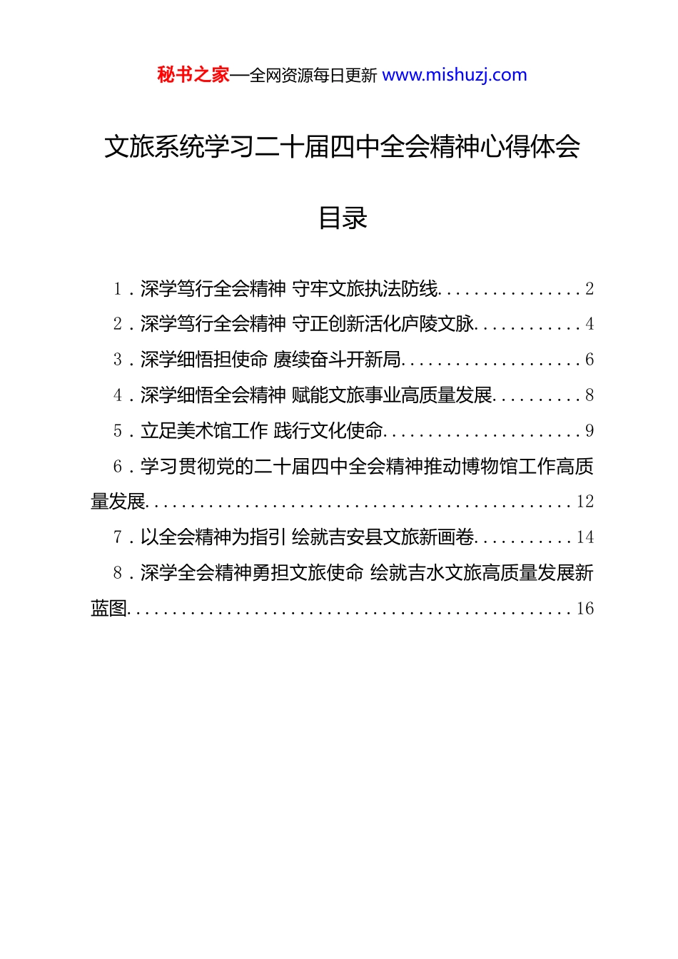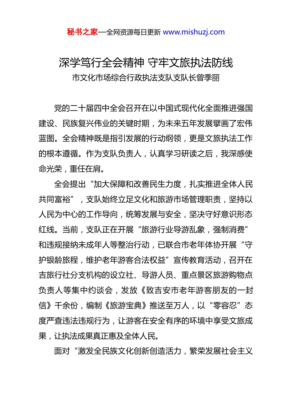 秘书之家—全网资源每日更新 www.mishuzj.com文旅系统学习二十届四中全会精神心得体会目录1.深学笃行全会精神 守牢文旅执法防线................22.深学笃行全会精神 守正创新活化庐陵文脉............43.深学细悟担使命 赓续奋斗开新局....................64.深学细悟全会精神 赋能文旅事业高质量发展..........85.立足美术馆工作 践行文化使命......................96.学习贯彻党的二十届四中全会精神推动博物馆工作高质量发展...............................................127.以全会精神为指引 绘就吉安县文旅新画卷...........148.深学全会精神勇担文旅使命 绘就吉水文旅高质量发展新蓝图.................................................16秘书之家—全网资源每日更新 www.mishuzj.com深学笃行全会精神 守牢文旅执法防线市文化市场综合行政执法支队支队长曾季丽党的二十届四中全会召开在以中国式现代化全面推进强国建设、民族复兴伟业的关键时期,为未来五年发展擘画了宏伟蓝图。全会精神既是指引发展的行动纲领,更是文旅执法工作的根本遵循。作为支队负责人,认真学习研读之后,我深感使命光荣,重任在肩。全会提出“加大保障和改善民生力度,扎实推进全体人民共同富裕”,支队始终立足文化和旅游市场管理职责,坚持以人民为中心的工作导向,统筹发展与安全,坚决守好意识形态红线。当前,支队正在开展“旅游行业导游乱象,强制消费”和违规接纳未成年人等整治行动,已联合市老年体协开展“守护银龄旅程,维护老年游客合法权益”宣传教育活动,召开在吉旅行社分支机构的设立社、导游人员、重点景区旅游购物点负责人等集中约谈会,发放《致吉安市老年游客朋友的一封信》千余份,编制《旅游宝典》推送至万人,以“零容忍”态度严查违法违规行为,让游客在安全有序的环境中享受文旅成果,让执法成果真正惠及全体人民。面对“激发全民族文化创新创造活力,繁荣发展社会主义秘书之家—全网资源每日更新 www.mishuzj.com文化”的要求,文旅执法必须主动迭代升级,以“监管护创新、执法促繁荣”为导向。“十五五”期间,支队将重点破解电竞酒店、剧本杀等新业态监管难题,一方面持续加强文化市场综合执法队伍建设,进一步提升综合执法监管效能和数智执法水平;另一方面优化明查暗访和日常执法检查机制,既精准打击违法违规行为,又通过“服务式执法”指导经营主体规范发展,立足庐陵文化根基,对新业态实行包容审慎监管,实现“监管”与“服务”协同,让执法既有力度更有温度,赋能文化活力释放,助力吉安文旅市场高质量发展。围绕繁荣发展社会主义文化,持续深化文娱领域综合治理、旅游市场秩序整治等重大专项工作。秘书之家—全网资源每日更新 www.mishuzj.com深学笃行全会精神 守正创新活化庐陵文脉市非物质文化遗产保护中心负责人 彭庆新学习党的二十届四中全会精神,最深刻的体悟是“文化兴国运兴,文化强民族强”的深刻内涵。全会提出“大力繁荣文化事业,加快发展文化产业”的部署,为非遗保护与群众文化工作指明了方向。作为吉安市非物质文化遗产保护中心(市文化馆)的负责人,我深感使命在肩,必须立足庐陵文化沃土,推动全会精神落地生根。以法治为基筑牢保护屏障。全会强调文化遗产保护的基础性作用,我们正以国家和省有关法律法规为契机,深化非遗资源挖掘和发展,完善市级非遗数据库,重点推进非遗项目的系统性保护,力争新增一批省级以上非遗名录,让千年庐陵文脉有迹可循、有章可护。以创新为径激活文化动能。践行全会“创造性转化、创新性发展”要求,我们探索“非遗+”融合路径:依托吉州窑、能仁巷、庐陵老街等载体打造沉浸式体验场景,借助数字化技术让非遗资源线上可及,推动“文化存量”转化为“发展增量”,让庐陵文化在文旅融合中焕发新生。以人民为中心厚植文化根基。落实全会文化惠民要求,我秘书之家—全网资源每日更新 www.mishuzj.com们持续开展“赣文轻骑兵 争做吉先锋”惠民演出和“非遗进校园、进农村、进社区、进景区”活动,办好群众文艺汇演,建强基层文化服务站点。让群众既做文化遗产的守护者,又做文化成果...