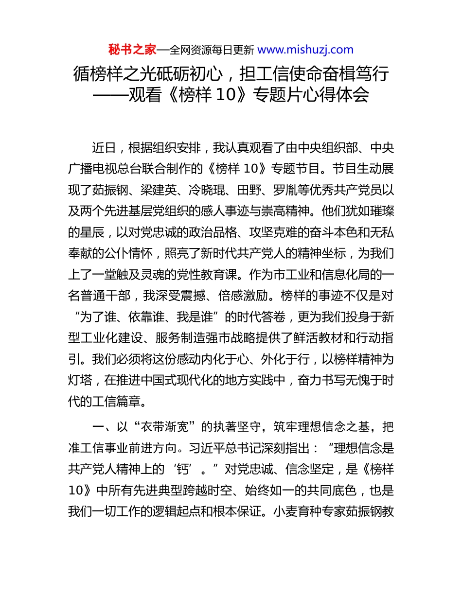 秘书之家—全网资源每日更新 www.mishuzj.com循榜样之光砥砺初心,担工信使命奋楫笃行——观看《榜样 10》专题片心得体会近日,根据组织安排,我认真观看了由中央组织部、中央广播电视总台联合制作的《榜样 10》专题节目。节目生动展现了茹振钢、梁建英、冷晓琨、田野、罗胤等优秀共产党员以及两个先进基层党组织的感人事迹与崇高精神。他们犹如璀璨的星辰,以对党忠诚的政治品格、攻坚克难的奋斗本色和无私奉献的公仆情怀,照亮了新时代共产党人的精神坐标,为我们上了一堂触及灵魂的党性教育课。作为市工业和信息化局的一名普通干部,我深受震撼、倍感激励。榜样的事迹不仅是对“为了谁、依靠谁、我是谁”的时代答卷,更为我们投身于新型工业化建设、服务制造强市战略提供了鲜活教材和行动指引。我们必须将这份感动内化于心、外化于行,以榜样精神为灯塔,在推进中国式现代化的地方实践中,奋力书写无愧于时代的工信篇章。一、以“衣带渐宽”的执著坚守,筑牢理想信念之基,把准工信事业前进方向。习近平总书记深刻指出:“理想信念是共产党人精神上的‘钙’。”对党忠诚、信念坚定,是《榜样10》中所有先进典型跨越时空、始终如一的共同底色,也是我们一切工作的逻辑起点和根本保证。小麦育种专家茹振钢教秘书之家—全网资源每日更新 www.mishuzj.com授,四十余载躬耕田畴,将“把论文写在大地上”的誓言化作“中国种子”保障“中国饭碗”的丰硕成果;高铁领军者梁建英总工程师,以“十年磨一剑”的恒心,率领团队勇攀科技高峰,让“中国速度”领跑世界。他们的奋斗轨迹雄辩地证明,坚定的信仰从来不是空洞的口号,而是融入血脉、付诸实践的一生坚守。对标榜样,反观自身在工业和信息化战线的工作,我们更需深刻领悟“两个确立”的决定性意义,增强“四个意识”、坚定“四个自信”、做到“两个维护”。这要求我们必须将个人的价值追求完全融入党和国家事业发展大局,特别是要精准把握“十五五”时期国家关于建设现代化产业体系、发展新质生产力的战略部署。在制定产业规划、推动项目建设、落实惠企政策时,必须首先考量是否符合国家战略方向、是否有利于夯实实体经济根基。例如,面对当前部分地方制造业比重波动的阶段性现象,我们必须保持战略清醒,坚决落实国家要求,防止产业空心化,牢牢守住制造业这个现代化产业体系的骨干。要以“千磨万击还坚劲”的定力,不为短期波动所扰,不为外界杂音所惑,始终确保我市工业和信息化事业沿着正确政治方向笃定前行,将忠诚与信仰镌刻在每一项具体的政策研究和行业服务之中。二、以“中流击水”的昂扬姿态,勇立产业发展潮头,锤炼攻坚克难实干本领。习近平总书记强调:“‘十五五’时期,战略机遇和风险挑战并存、不确定难预料因素增多。”面秘书之家—全网资源每日更新 www.mishuzj.com对复杂局面,榜样们给出了“担当”的生动诠释。冷晓琨在智能机器人领域勇闯“无人区”,带领团队突破核心零部件“卡脖子”难题;田野院士甘坐“冷板凳”,在基础数学的深奥王国潜心钻研,取得被国际同行誉为“田的突破”的重大成果。他们的实践启示我们,真担当就是在关键时刻冲得上、顶得住、打得赢,就是要在“该为的必须为、能为的努力为、不该为的决不为”的辩证统一中精准发力。作为工信干部,我们的“主战场”就是推动产业转型升级和高质量发展。这要求我们必须焕发“敢教日月换新天”的昂扬斗志,主动投身到改革发展的前沿阵地。一方面,要敢于“接烫手山芋”,聚焦我市产业链供应链的薄弱环节和技术瓶颈,学习冷晓琨式的闯劲,支持企业开展关键核心技术攻关。要积极借鉴先进地区经验,例如苏州等地推动人工智能赋能新型工业化的做法,探索“人工智能+制造”的本地化应用场景,培育新质生产力。另一方面,要善于“算投入产出账”,遵循产业发展规律。在谋划和推进项目时,必须坚持实事求是,提高产业布局、基础设施与本地资源禀赋、市场需求的“适配度”,坚决杜绝盲目上马、跟风冒进造成浪费,也要避免“喜新厌旧”、丢掉我们既有的传统产业优势。我们要将榜样的闯劲、韧劲转化为推动我市产业向高端化、智能化、绿色化转型的务实举措,...