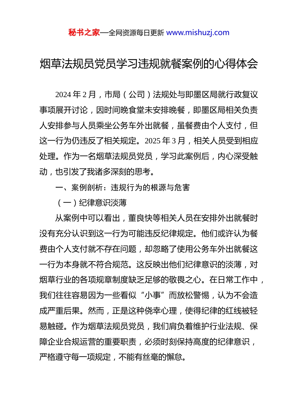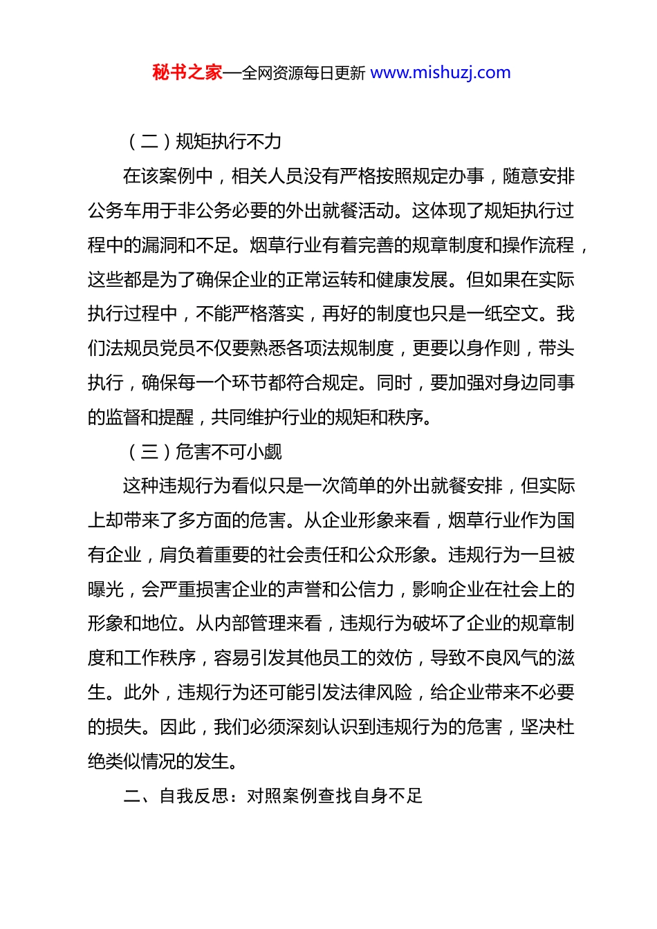 秘书之家—全网资源每日更新 www.mishuzj.com烟草法规员党员学习违规就餐案例的心得体会 2024 年 2 月,市局(公司)法规处与即墨区局就行政复议事项展开讨论,因时间晚食堂未安排晚餐,即墨区局相关负责人安排参与人员乘坐公务车外出就餐,虽餐费由个人支付,但这一行为仍违反了相关规定。2025 年 3 月,相关人员受到相应处理。作为一名烟草法规员党员,学习此案例后,内心深受触动,也引发了我诸多深刻的思考。一、案例剖析:违规行为的根源与危害(一)纪律意识淡薄从案例中可以看出,董良快等相关人员在安排外出就餐时没有充分认识到这一行为可能违反纪律规定。他们或许认为餐费由个人支付就不存在问题,却忽略了使用公务车外出就餐这一行为本身就不符合规范。这反映出他们纪律意识的淡薄,对烟草行业的各项规章制度缺乏足够的敬畏之心。在日常工作中,我们往往容易因为一些看似“小事”而放松警惕,认为不会造成严重后果。然而,正是这种侥幸心理,使得纪律的红线被轻易触碰。作为烟草法规员党员,我们肩负着维护行业法规、保障企业合规运营的重要职责,必须时刻保持高度的纪律意识,严格遵守每一项规定,不能有丝毫的懈怠。秘书之家—全网资源每日更新 www.mishuzj.com(二)规矩执行不力在该案例中,相关人员没有严格按照规定办事,随意安排公务车用于非公务必要的外出就餐活动。这体现了规矩执行过程中的漏洞和不足。烟草行业有着完善的规章制度和操作流程,这些都是为了确保企业的正常运转和健康发展。但如果在实际执行过程中,不能严格落实,再好的制度也只是一纸空文。我们法规员党员不仅要熟悉各项法规制度,更要以身作则,带头执行,确保每一个环节都符合规定。同时,要加强对身边同事的监督和提醒,共同维护行业的规矩和秩序。(三)危害不可小觑这种违规行为看似只是一次简单的外出就餐安排,但实际上却带来了多方面的危害。从企业形象来看,烟草行业作为国有企业,肩负着重要的社会责任和公众形象。违规行为一旦被曝光,会严重损害企业的声誉和公信力,影响企业在社会上的形象和地位。从内部管理来看,违规行为破坏了企业的规章制度和工作秩序,容易引发其他员工的效仿,导致不良风气的滋生。此外,违规行为还可能引发法律风险,给企业带来不必要的损失。因此,我们必须深刻认识到违规行为的危害,坚决杜绝类似情况的发生。二、自我反思:对照案例查找自身不足秘书之家—全网资源每日更新 www.mishuzj.com(一)纪律观念方面通过学习此案例,我反思自己在日常工作中是否也存在纪律观念淡薄的问题。有时候,在面对一些紧急情况或特殊需求时,可能会为了追求工作效率而忽视了一些规定的流程和要求。例如,在处理一些文件或审批事项时,可能会因为时间紧迫而简化了某些环节。这种做法虽然在短期内可能解决了问题,但从长远来看,却埋下了违规的隐患。我认识到,纪律观念必须时刻牢记心中,无论在何种情况下,都要严格遵守规定,不能因为一时的便利而违反纪律。(二)规矩执行方面在规矩执行上,我也存在一些不足之处。有时会对一些规定的理解不够深入,导致在实际操作中出现偏差。例如,对于公务用车的使用规定,虽然知道有相关要求,但在具体执行过程中,可能没有做到严格把关。另外,在监督他人执行规矩方面,也存在不够积极主动的情况。看到身边同事有一些不太规范的行为,没有及时进行提醒和纠正。我明白,作为法规员党员,不仅要自己严格执行规矩,还要积极发挥监督作用,确保整个团队都能遵守规定。(三)风险防范意识方面案例中的违规行为反映出相关人员风险防范意识的不足。秘书之家—全网资源每日更新 www.mishuzj.com他们没有充分考虑到这一行为可能带来的各种风险,如法律风险、企业形象风险等。在我的工作中,也存在风险防范意识不够强的问题。在处理一些业务时,往往只关注眼前的业务目标,而忽略了潜在的风险因素。例如,在审核一些合同或协议时,可能只注重条款的合理性,而没有充分评估其中可能存在的法律风险。我认识到,必须加强风险防范意识,在工作中要全面、深入地分析各种可能的风险,并采取有效的措施进行防范。三、改进措施:提升...