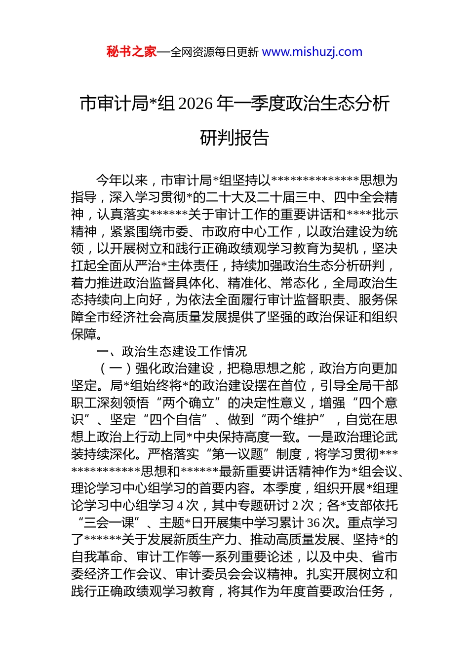 秘书之家—全网资源每日更新 www.mishuzj.com市审计局*组 2026 年一季度政治生态分析研判报告今年以来,市审计局*组坚持以**************思想为指导,深入学习贯彻*的二十大及二十届三中、四中全会精神,认真落实******关于审计工作的重要讲话和****批示精神,紧紧围绕市委、市政府中心工作,以政治建设为统领,以开展树立和践行正确政绩观学习教育为契机,坚决扛起全面从严治*主体责任,持续加强政治生态分析研判,着力推进政治监督具体化、精准化、常态化,全局政治生态持续向上向好,为依法全面履行审计监督职责、服务保障全市经济社会高质量发展提供了坚强的政治保证和组织保障。一、政治生态建设工作情况(一)强化政治建设,把稳思想之舵,政治方向更加坚定。局*组始终将*的政治建设摆在首位,引导全局干部职工深刻领悟“两个确立”的决定性意义,增强“四个意识”、坚定“四个自信”、做到“两个维护”,自觉在思想上政治上行动上同*中央保持高度一致。一是政治理论武装持续深化。严格落实“第一议题”制度,将学习贯彻**************思想和******最新重要讲话精神作为*组会议、理论学习中心组学习的首要内容。本季度,组织开展*组理论学习中心组学习 4 次,其中专题研讨 2 次;各*支部依托“三会一课”、主题*日开展集中学习累计 36 次。重点学习了******关于发展新质生产力、推动高质量发展、坚持*的自我革命、审计工作等一系列重要论述,以及中央、省市委经济工作会议、审计委员会会议精神。扎实开展树立和践行正确政绩观学习教育,将其作为年度首要政治任务,秘书之家—全网资源每日更新 www.mishuzj.com制定专项学习计划,组织*员干部深入学习领会******关于树立和践行正确政绩观的重要论述,学习*章*规 dj,教育引导全体审计干部深刻把握“政绩为谁而树、树什么样的政绩、靠什么树政绩”的重大问题,自觉把为民造福作为最大政绩,把服务大局、推动发展、保障民生、防范风险作为审计工作的出发点和落脚点。通过学习,*员干部的政治判断力、政治领悟力、政治执行力得到有效提升。二是决策部署落实坚决有力。坚持把贯彻落实*中央、国务院重大决策部署及省委、市委工作要求作为首要政治责任,确保审计工作始终沿着正确方向前进。围绕服务保障“国之大者”,聚焦深化改革开放、推动高质量发展、统筹发展与安全、全面推进乡村振兴、保障和改善民生、推进生态文明建设等重点领域,科学谋划年度审计项目计划,确定市级统一组织审计项目 28 个。本季度,已按计划完成或开展重大政策跟踪审计、财政预算执行审计、民生资金和项目审计、经济责任审计等各类审计项目 12 个,揭示和反映问题隐患 130 余个,提出审计建议 40 余条,向市委、市政府报送审计要情、综合报告 5 篇。建立健全审计发现问题整改督促检查机制,推动被审计单位落实整改责任,审计“治已病、防未病”作用有效发挥。例如,在某重点领域政策跟踪审计中,揭示了部分惠企利民政策落实不到位、资金拨付不及时等问题,推动相关部门完善制度 3 项,加快拨付滞拨资金*万元,促进了政策红利直达快享。(二)聚焦关键少数,建强领导班子,核心引领更加凸显。局*组充分发挥把方向、管大局、保落实的领导作用,着力建设政治坚定、团结协作、担当作为、清正廉洁的坚强领导集体。一是议事决策规范科学。严格执行民主集中制,修订完善《市审计局*组工作规则》《“三重一大”事项集体决策制度实施办法》,明确决策范围、程序和责任对年度审计项目计划、重要审计结果处置、大额资金使用干部人事任免等重要事项,均严格按照规定程序,经过充秘书之家—全网资源每日更新 www.mishuzj.com分酝酿、集体讨论决定。本季度共召开*组会议 8 次,研究决策“三重一大”事项 18 项,其中涉及审计业务重要事项9 项。*组书记带头执行末位表态制,班子成员充分发表意见,决策质量和效率不断提高。班子成员分工负责、相互补位,在推动审计全覆盖、加强审计质量控制、深化审计成果运用等方面协同发力,形成了团结一心干事业的良好局面。二是意识形态责任压紧压实。坚决扛起意识形态工作主体责任,将意识形态工作纳入...