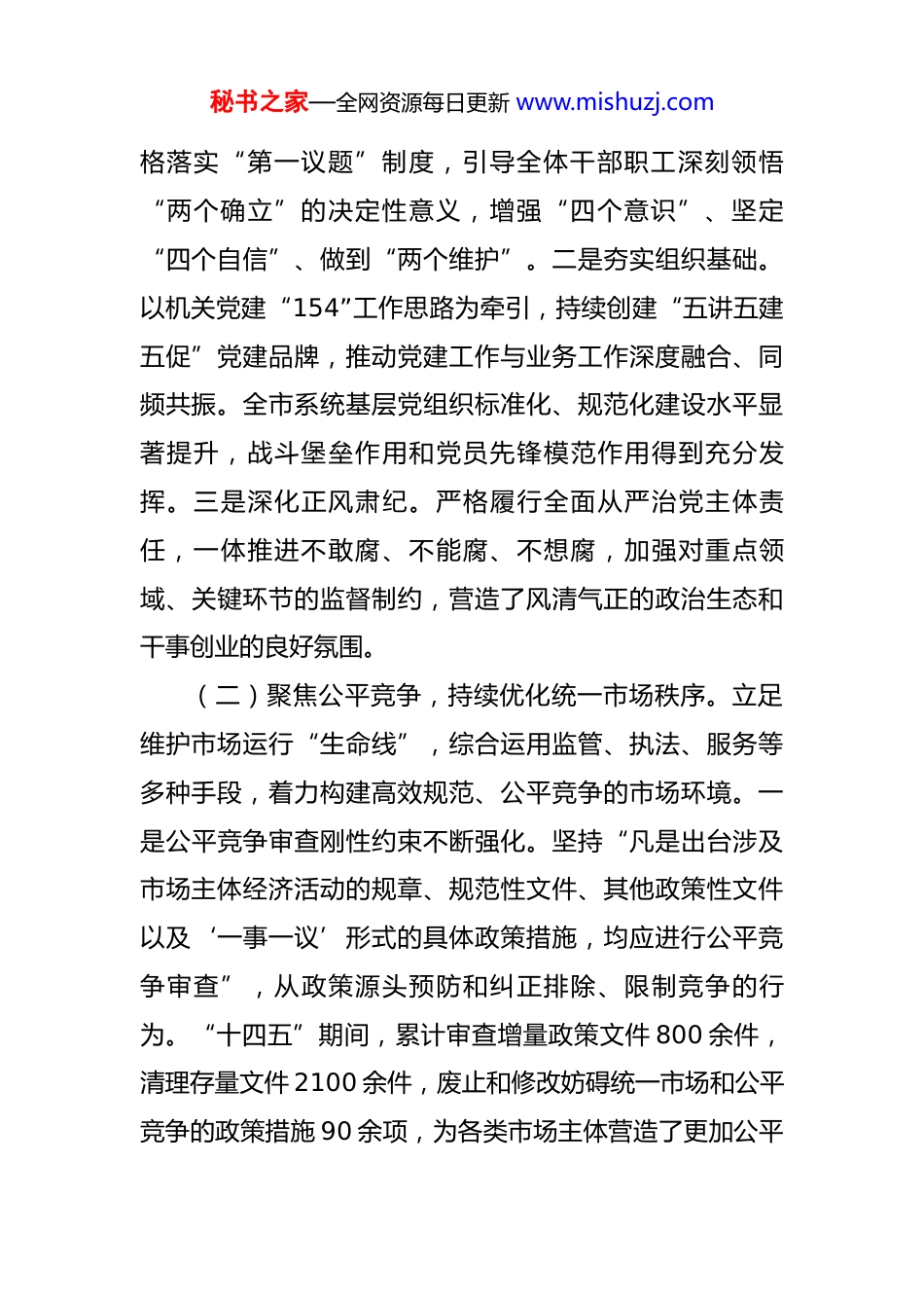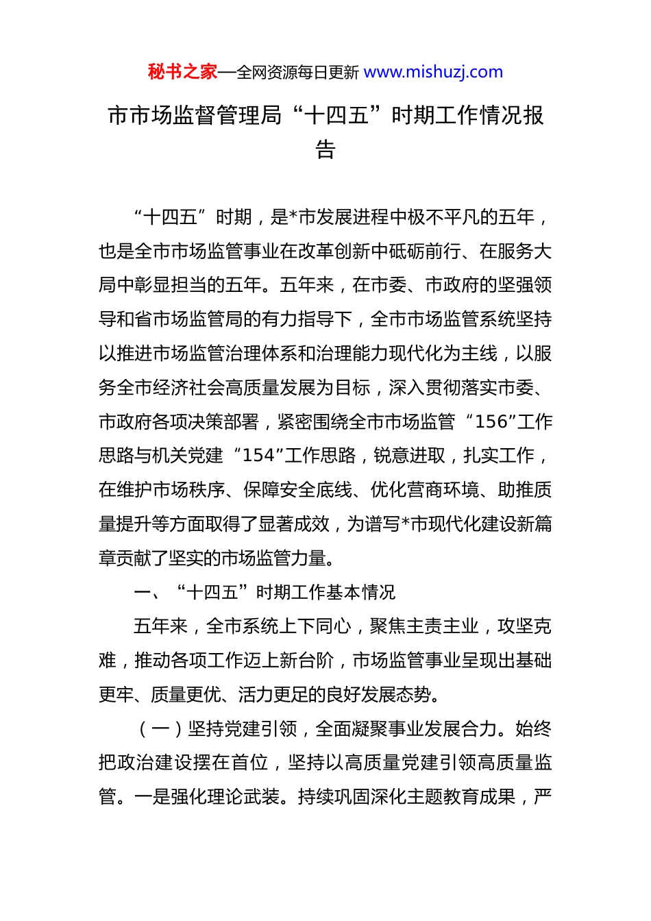 秘书之家—全网资源每日更新 www.mishuzj.com市市场监督管理局“十四五”时期工作情况报告 “十四五”时期,是*市发展进程中极不平凡的五年,也是全市市场监管事业在改革创新中砥砺前行、在服务大局中彰显担当的五年。五年来,在市委、市政府的坚强领导和省市场监管局的有力指导下,全市市场监管系统坚持以推进市场监管治理体系和治理能力现代化为主线,以服务全市经济社会高质量发展为目标,深入贯彻落实市委、市政府各项决策部署,紧密围绕全市市场监管“156”工作思路与机关党建“154”工作思路,锐意进取,扎实工作,在维护市场秩序、保障安全底线、优化营商环境、助推质量提升等方面取得了显著成效,为谱写*市现代化建设新篇章贡献了坚实的市场监管力量。一、“十四五”时期工作基本情况五年来,全市系统上下同心,聚焦主责主业,攻坚克难,推动各项工作迈上新台阶,市场监管事业呈现出基础更牢、质量更优、活力更足的良好发展态势。(一)坚持党建引领,全面凝聚事业发展合力。始终把政治建设摆在首位,坚持以高质量党建引领高质量监管。一是强化理论武装。持续巩固深化主题教育成果,严秘书之家—全网资源每日更新 www.mishuzj.com格落实“第一议题”制度,引导全体干部职工深刻领悟“两个确立”的决定性意义,增强“四个意识”、坚定“四个自信”、做到“两个维护”。二是夯实组织基础。以机关党建“154”工作思路为牵引,持续创建“五讲五建五促”党建品牌,推动党建工作与业务工作深度融合、同频共振。全市系统基层党组织标准化、规范化建设水平显著提升,战斗堡垒作用和党员先锋模范作用得到充分发挥。三是深化正风肃纪。严格履行全面从严治党主体责任,一体推进不敢腐、不能腐、不想腐,加强对重点领域、关键环节的监督制约,营造了风清气正的政治生态和干事创业的良好氛围。(二)聚焦公平竞争,持续优化统一市场秩序。立足维护市场运行“生命线”,综合运用监管、执法、服务等多种手段,着力构建高效规范、公平竞争的市场环境。一是公平竞争审查刚性约束不断强化。坚持“凡是出台涉及市场主体经济活动的规章、规范性文件、其他政策性文件以及‘一事一议’形式的具体政策措施,均应进行公平竞争审查”,从政策源头预防和纠正排除、限制竞争的行为。“十四五”期间,累计审查增量政策文件 800 余件,清理存量文件 2100 余件,废止和修改妨碍统一市场和公平竞争的政策措施 90 余项,为各类市场主体营造了更加公平秘书之家—全网资源每日更新 www.mishuzj.com的制度环境。二是重点领域价格监管精准有效。围绕节假日等重要时段,聚焦教育、医疗、殡葬、停车收费等民生领域,组织开展价格专项整治和监督检查。通过召开提醒告诫会、发放提醒告诫函、签订价格承诺书等方式,引导经营者加强价格自律,累计纠正不正当价格行为 350 余起,全力确保了市场价格秩序稳定。三是消费维权服务效能显著提升。持续畅通 12315 投诉举报渠道,优化办理流程,压缩处理时限,投诉举报按时办结率达 99%以上。“十四五”期间,全市共接收处理消费者投诉举报 21.5 万件,为消费者挽回经济损失约 1.2 亿元。深入实施优化消费环境三年行动,规范化建设消费维权服务站 450 个,将维权触角延伸至社区、商场和企业,有效便捷了消费维权“最后一公里”。四是综合执法震慑作用充分彰显。聚焦关系群众切身利益的突出问题,统筹推进反不正当竞争、打击侵权假冒、整治虚假违法广告、网络市场监管等多个专项执法行动,累计查办各类违法案件 1.8 万件,罚没款2.5 亿元。在全省市场监管系统第二届执法稽查专业技能大比武中,我市代表队荣获团体二等奖。2024 年,侵权假冒伪劣商品全国统一销毁行动主会场活动在我市成功举办,有力震慑了违法犯罪行为,展示了*市打击侵权假冒的坚定决心和工作成效。秘书之家—全网资源每日更新 www.mishuzj.com(三)严守安全底线,全力保障民生福祉安康。始终坚持人民至上、生命至上,以“四个最严”要求为根本遵循,坚决筑牢食品、药品、特种设备和重要工业产品质量安全防线,人民群众的获得感、幸福感、安全感持续增强。一是食品安全形势稳中向好...