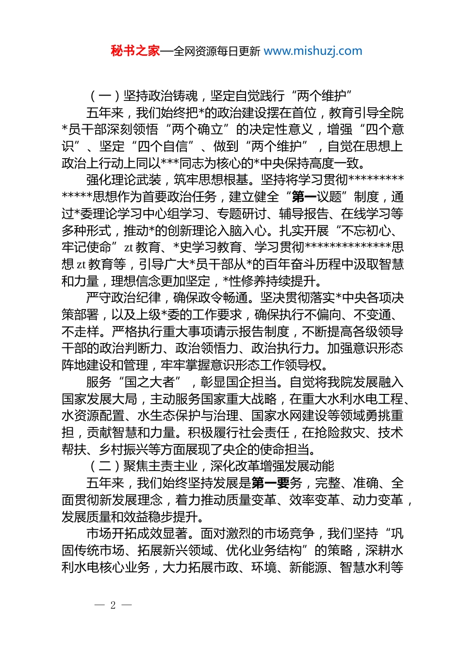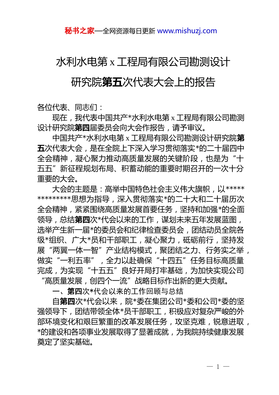 秘书之家—全网资源每日更新 www.mishuzj.com水利水电第 x 工程局有限公司勘测设计研究院第五次代表大会上的报告各位代表、同志们:现在,我代表中国共产*水利水电第 x 工程局有限公司勘测设计研究院第四届委员会向大会作报告,请予审议。中国共产*水利水电第 x 工程局有限公司勘测设计研究院第五次代表大会,是在全院上下深入学习贯彻落实*的二十届四中全会精神,凝心聚力推动高质量发展的关键阶段,也是为“十五五”新征程规划布局、积蓄动能的重要时期召开的一次十分重要的大会。大会的主题是:高举中国特色社会主义伟大旗帜,以**************思想为指导,深入贯彻落实*的二十大和二十届历次全会精神,紧紧围绕高质量发展首要任务,坚持和加强*的全面领导,总结第四次*代会以来的工作,谋划未来五年发展蓝图,选举产生新一届*的委员会和纪律检查委员会,团结动员全院各级*组织、广大*员和干部职工,凝心聚力,砥砺前行,坚持发展“两翼一体一智”产业结构模式,聚团结之力、行务实之举,做实“一利五率”,全力以赴确保“十四五”任务目标高质量完成,为实现“十五五”良好开局打牢基础,为加快实现公司“高质量发展,创四个一流”战略目标作出新的更大贡献。一、第四次*代会以来的工作回顾与总结自第四次*代会以来,院*委在集团公司*委和公司*委的坚强领导下,团结带领全体*员干部职工,积极应对复杂严峻的外部环境变化和艰巨繁重的改革发展任务,攻坚克难,锐意进取,*的建设和各项事业发展取得了显著成就,为我院持续健康发展奠定了坚实基础。— 1 —秘书之家—全网资源每日更新 www.mishuzj.com(一)坚持政治铸魂,坚定自觉践行“两个维护”五年来,我们始终把*的政治建设摆在首位,教育引导全院*员干部深刻领悟“两个确立”的决定性意义,增强“四个意识”、坚定“四个自信”、做到“两个维护”,自觉在思想上政治上行动上同以***同志为核心的*中央保持高度一致。强化理论武装,筑牢思想根基。坚持将学习贯彻**************思想作为首要政治任务,建立健全“第一议题”制度,通过*委理论学习中心组学习、专题研讨、辅导报告、在线学习等多种形式,推动*的创新理论入脑入心。扎实开展“不忘初心、牢记使命”zt 教育、*史学习教育、学习贯彻**************思想 zt 教育等,引导广大*员干部从*的百年奋斗历程中汲取智慧和力量,理想信念更加坚定,*性修养持续提升。严守政治纪律,确保政令畅通。坚决贯彻落实*中央各项决策部署,以及上级*委的工作要求,确保执行不偏向、不变通、不走样。严格执行重大事项请示报告制度,不断提高各级领导干部的政治判断力、政治领悟力、政治执行力。加强意识形态阵地建设和管理,牢牢掌握意识形态工作领导权。服务“国之大者”,彰显国企担当。自觉将我院发展融入国家发展大局,主动服务国家重大战略,在重大水利水电工程、水资源配置、水生态保护与治理、国家水网建设等领域勇挑重担,贡献智慧和力量。积极履行社会责任,在抢险救灾、技术帮扶、乡村振兴等方面展现了央企的使命担当。(二)聚焦主责主业,深化改革增强发展动能五年来,我们始终坚持发展是第一要务,完整、准确、全面贯彻新发展理念,着力推动质量变革、效率变革、动力变革,发展质量和效益稳步提升。市场开拓成效显著。面对激烈的市场竞争,我们坚持“巩固传统市场、拓展新兴领域、优化业务结构”的策略,深耕水利水电核心业务,大力拓展市政、环境、新能源、智慧水利等— 2 —秘书之家—全网资源每日更新 www.mishuzj.com新兴业务,市场布局不断优化,合同额、营业收入等关键指标稳步增长,发展基础更加牢固。深化改革纵深推进。按照上级部署,积极稳妥推进各项改革任务。优化内部组织结构,完善市场化经营机制,深化三项制度改革,激发企业内部活力。加强合规管理体系建设,风险防控能力不断增强。项目管理提质增效。全面推行精细化管理,加强项目全过程成本管控,提升项目履约能力和盈利水平。一批重点工程项目优质高效完成,获得了业主和社会各界的广泛好评,品牌影响力持续提升。“两翼一体一智”格局初步形成。坚定不移地推进产业结构优化升级,传统...