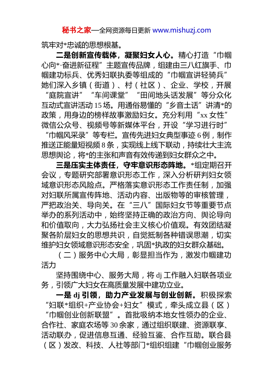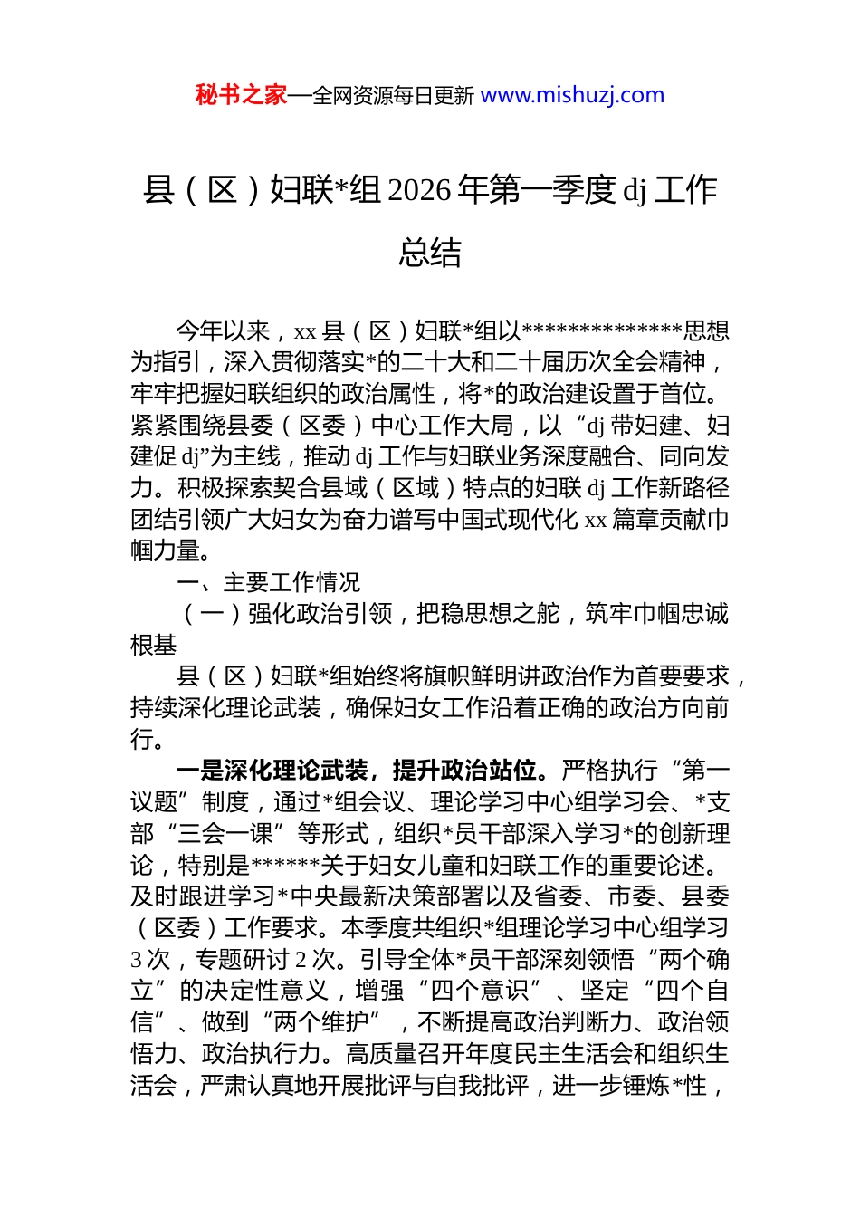 秘书之家—全网资源每日更新 www.mishuzj.com县(区)妇联*组 2026 年第一季度 dj 工作总结今年以来,xx 县(区)妇联*组以**************思想为指引,深入贯彻落实*的二十大和二十届历次全会精神,牢牢把握妇联组织的政治属性,将*的政治建设置于首位。紧紧围绕县委(区委)中心工作大局,以“dj 带妇建、妇建促 dj”为主线,推动 dj 工作与妇联业务深度融合、同向发力。积极探索契合县域(区域)特点的妇联 dj 工作新路径团结引领广大妇女为奋力谱写中国式现代化 xx 篇章贡献巾帼力量。一、主要工作情况(一)强化政治引领,把稳思想之舵,筑牢巾帼忠诚根基县(区)妇联*组始终将旗帜鲜明讲政治作为首要要求,持续深化理论武装,确保妇女工作沿着正确的政治方向前行。一是深化理论武装,提升政治站位。严格执行“第一议题”制度,通过*组会议、理论学习中心组学习会、*支部“三会一课”等形式,组织*员干部深入学习*的创新理论,特别是******关于妇女儿童和妇联工作的重要论述。及时跟进学习*中央最新决策部署以及省委、市委、县委(区委)工作要求。本季度共组织*组理论学习中心组学习3 次,专题研讨 2 次。引导全体*员干部深刻领悟“两个确立”的决定性意义,增强“四个意识”、坚定“四个自信”、做到“两个维护”,不断提高政治判断力、政治领悟力、政治执行力。高质量召开年度民主生活会和组织生活会,严肃认真地开展批评与自我批评,进一步锤炼*性,秘书之家—全网资源每日更新 www.mishuzj.com筑牢对*忠诚的思想根基。二是创新宣传载体,凝聚妇女人心。精心打造“巾帼心向*·奋进新征程”主题宣传品牌,组建由三八红旗手、巾帼建功标兵、优秀妇联执委等组成的“巾帼宣讲轻骑兵”她们深入乡镇(街道)、村(社区)、企业、学校,开展“庭院宣讲”“车间课堂”“田间地头话发展”等分众化互动式宣讲活动 15 场。用通俗易懂的“乡音土话”讲清*的政策,用身边的榜样故事激励妇女。充分利用“xx 女性”微信公众号、视频号等新媒体平台,开设“学习进行时”“巾帼风采录”等专栏。宣传先进妇女典型事迹 6 例,制作推送正能量短视频 8 条,实现线上线下联动,持续壮大主流思想舆论,将*的主张和声音有效传递到妇女群众之中。三是压实主体责任,守牢意识形态阵地。*组定期召开会议,专题研究部署意识形态工作,深入分析研判妇女领域意识形态风险点。严格落实意识形态工作责任制,加强对妇联所属宣传阵地、活动内容、出版物等的审核管理,严把政治关、导向关。在“三八”国际妇女节等重要节点举办的系列活动中,始终坚持正确的政治方向、舆论导向和价值取向,大力弘扬社会主义核心价值观。有效团结凝聚各阶层妇女的思想共识,自觉抵制各种错误思潮,切实维护妇女领域意识形态安全,巩固*执政的妇女群众基础。(二)服务中心大局,彰显担当作为,激发巾帼建功活力坚持围绕中心、服务大局,将 dj 工作融入妇联各项业务,引领广大妇女在高质量发展中建功立业。一是 dj 引领,助力产业发展与创业创新。积极探索“妇联*组织+产业协会+妇女”模式,牵头成立县(区)“巾帼创业创新联盟”。首批吸纳本地女性领办的企业、合作社、家庭农场等 30 余家,通过组织联建、资源联享、活动联办,促进信息互通、经验互鉴、合作互助。联合县(区)发改、科技、人社等部门*组织组建“巾帼创业服务秘书之家—全网资源每日更新 www.mishuzj.com团”,开展“送政策、送服务、送温暖”活动。举办女企业家座谈会 2 场,协调解决发展难题。积极培育和推荐县级“巾帼创业示范基地”4 个,组织参与市级相关评选与培训,切实将*的组织优势转化为服务妇女创业创新、助推产业发展的动力。二是聚焦民生,促进妇女就业与技能提升。将促进妇女更高质量更充分就业作为服务民生的重要着力点。联合县(区)人社局、总工会等单位,举办“春风送岗”女性专场招聘会 2 场,提供就业岗位 800 余个。创新推动设立“妈妈岗”“灵活就业岗”等特色岗位 100 余个,探索弹性工作制,着力缓解女性就业与育儿的矛盾。深化区域 dj 联建,与邻近县(区)妇联合作,共建共享家政服务、手...