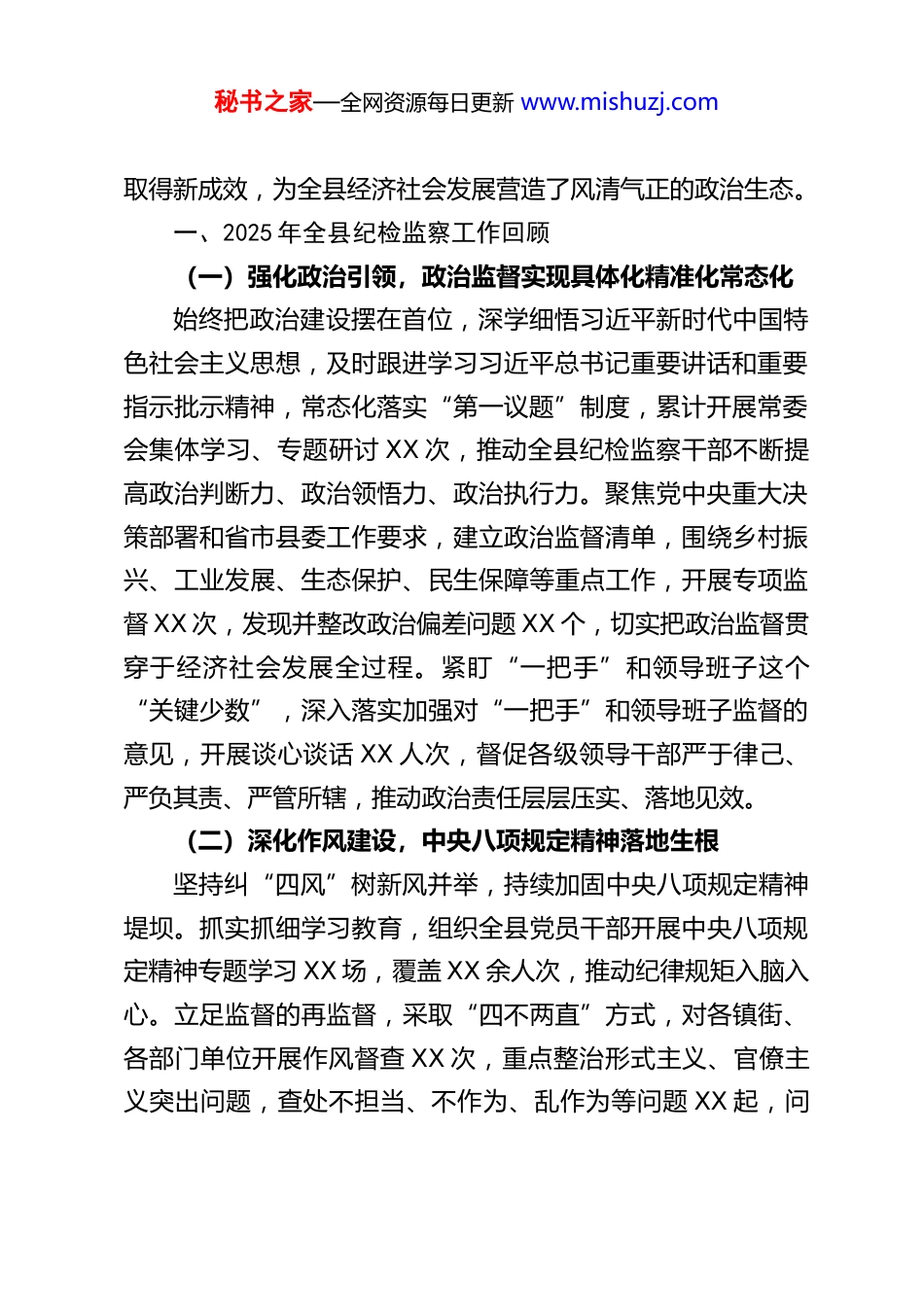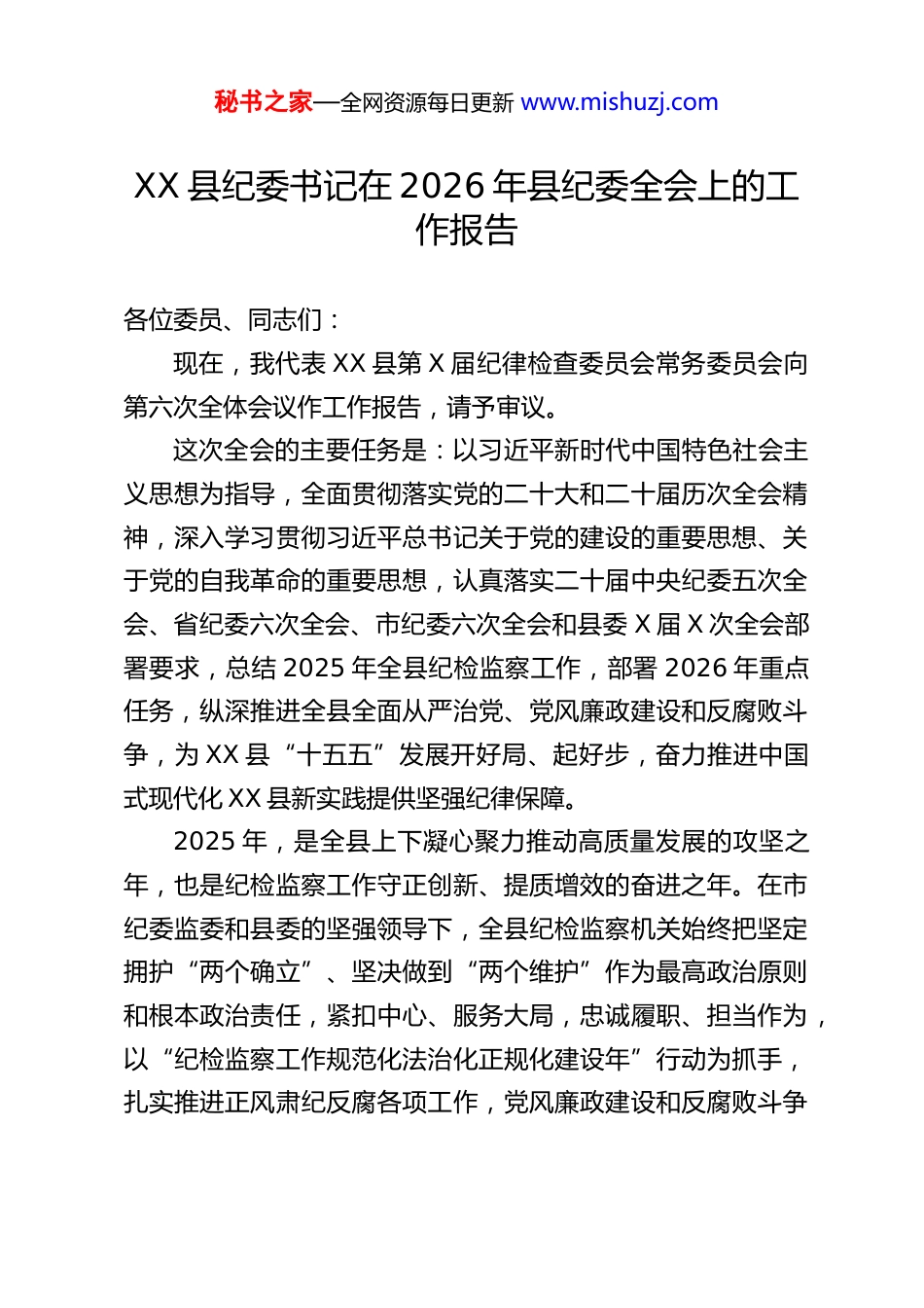 秘书之家—全网资源每日更新 www.mishuzj.comXX 县纪委书记在 2026 年县纪委全会上的工作报告各位委员、同志们:现在,我代表 XX 县第 X 届纪律检查委员会常务委员会向第六次全体会议作工作报告,请予审议。这次全会的主要任务是:以习近平新时代中国特色社会主义思想为指导,全面贯彻落实党的二十大和二十届历次全会精神,深入学习贯彻习近平总书记关于党的建设的重要思想、关于党的自我革命的重要思想,认真落实二十届中央纪委五次全会、省纪委六次全会、市纪委六次全会和县委 X 届 X 次全会部署要求,总结 2025 年全县纪检监察工作,部署 2026 年重点任务,纵深推进全县全面从严治党、党风廉政建设和反腐败斗争,为 XX 县“十五五”发展开好局、起好步,奋力推进中国式现代化 XX 县新实践提供坚强纪律保障。2025 年,是全县上下凝心聚力推动高质量发展的攻坚之年,也是纪检监察工作守正创新、提质增效的奋进之年。在市纪委监委和县委的坚强领导下,全县纪检监察机关始终把坚定拥护“两个确立”、坚决做到“两个维护”作为最高政治原则和根本政治责任,紧扣中心、服务大局,忠诚履职、担当作为,以“纪检监察工作规范化法治化正规化建设年”行动为抓手,扎实推进正风肃纪反腐各项工作,党风廉政建设和反腐败斗争秘书之家—全网资源每日更新 www.mishuzj.com取得新成效,为全县经济社会发展营造了风清气正的政治生态。一、2025 年全县纪检监察工作回顾(一)强化政治引领,政治监督实现具体化精准化常态化始终把政治建设摆在首位,深学细悟习近平新时代中国特色社会主义思想,及时跟进学习习近平总书记重要讲话和重要指示批示精神,常态化落实“第一议题”制度,累计开展常委会集体学习、专题研讨 XX 次,推动全县纪检监察干部不断提高政治判断力、政治领悟力、政治执行力。聚焦党中央重大决策部署和省市县委工作要求,建立政治监督清单,围绕乡村振兴、工业发展、生态保护、民生保障等重点工作,开展专项监督 XX 次,发现并整改政治偏差问题 XX 个,切实把政治监督贯穿于经济社会发展全过程。紧盯“一把手”和领导班子这个“关键少数”,深入落实加强对“一把手”和领导班子监督的意见,开展谈心谈话 XX 人次,督促各级领导干部严于律己、严负其责、严管所辖,推动政治责任层层压实、落地见效。(二)深化作风建设,中央八项规定精神落地生根坚持纠“四风”树新风并举,持续加固中央八项规定精神堤坝。抓实抓细学习教育,组织全县党员干部开展中央八项规定精神专题学习 XX 场,覆盖 XX 余人次,推动纪律规矩入脑入心。立足监督的再监督,采取“四不两直”方式,对各镇街、各部门单位开展作风督查 XX 次,重点整治形式主义、官僚主义突出问题,查处不担当、不作为、乱作为等问题 XX 起,问秘书之家—全网资源每日更新 www.mishuzj.com责 XX 人。严肃查处享乐主义、奢靡之风,紧盯节日节点开展专项检查,查处违规吃喝、违规收送礼品礼金等问题 XX 起,给予党纪政务处分 XX 人。深化风腐同查同治,从作风问题线索中深挖腐败问题,从腐败案件中倒查作风隐患,查处风腐交织问题 XX 起,切实斩断风腐相连的利益链条,推动党风政风持续向好。(三)保持高压态势,反腐败斗争纵深推进坚持无禁区、全覆盖、零容忍,重遏制、强高压、长震慑持续拓展反腐广度和深度。紧盯权力集中、资金密集、资源富集领域,深化整治工程建设、招标投标、金融、国企、医药卫生、教育体育等重点领域腐败问题,全年共立案审查调查 XX件,给予党纪政务处分 XX 人,采取留置措施 XX 人,移送司法机关 XX 人。严肃查处政商勾连、权力寻租等问题,深挖细查预期收益、约定代持、政商“旋转门”等新型腐败和隐性腐败,坚决清除政治隐患和腐败毒瘤。深化行贿受贿一起查,建立行贿人信息库,对行贿行为依法依规严肃处理,查处行贿人员 XX人,形成联合惩戒的强大震慑。同时,注重做好查办案件“后半篇文章”,针对案件暴露的问题,制发纪检监察建议书 XX份,督促相关单位建章立制、堵塞漏洞,推动以案促改、以案促治、以案促建。(四)坚守人民立场,群众身边...