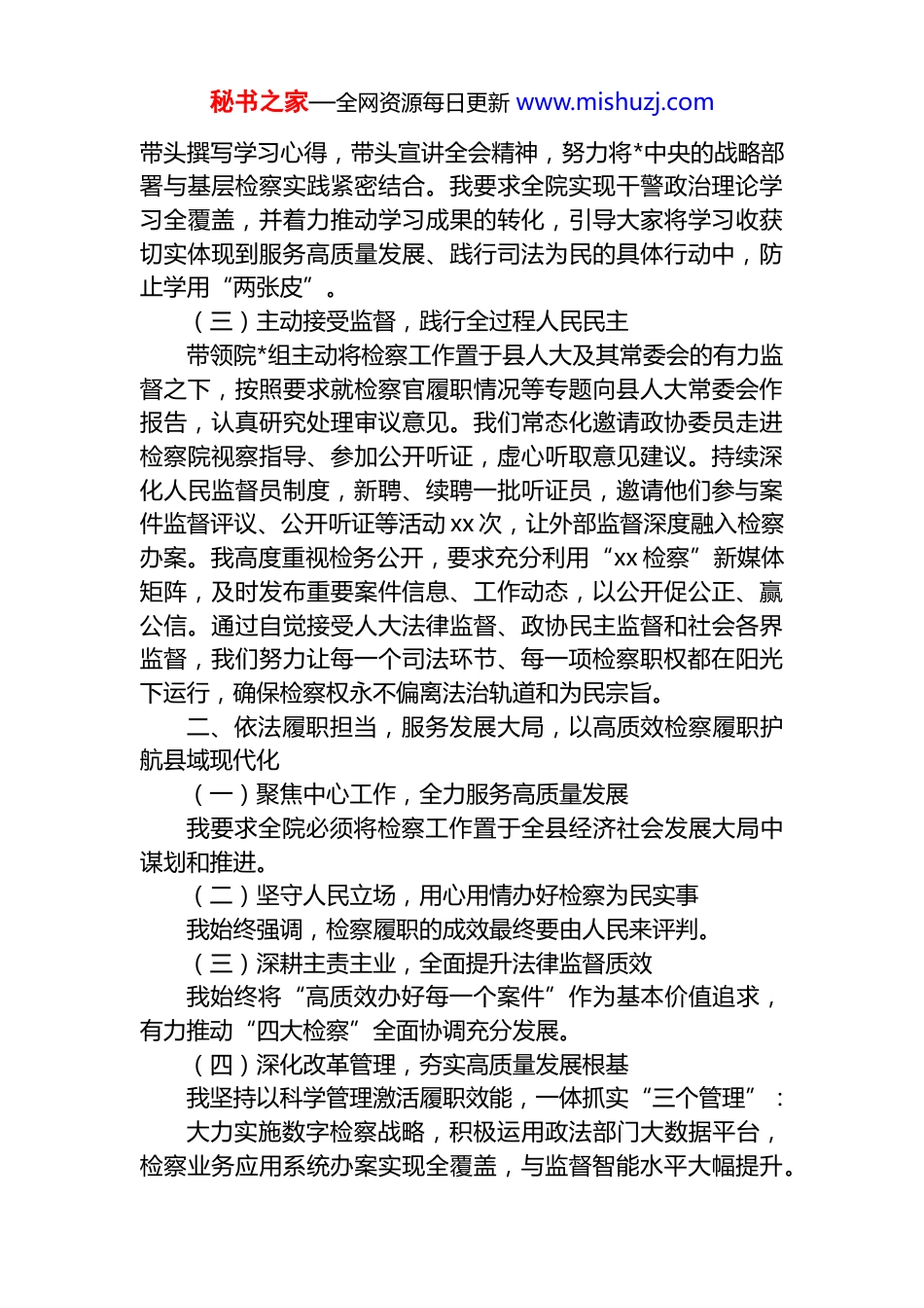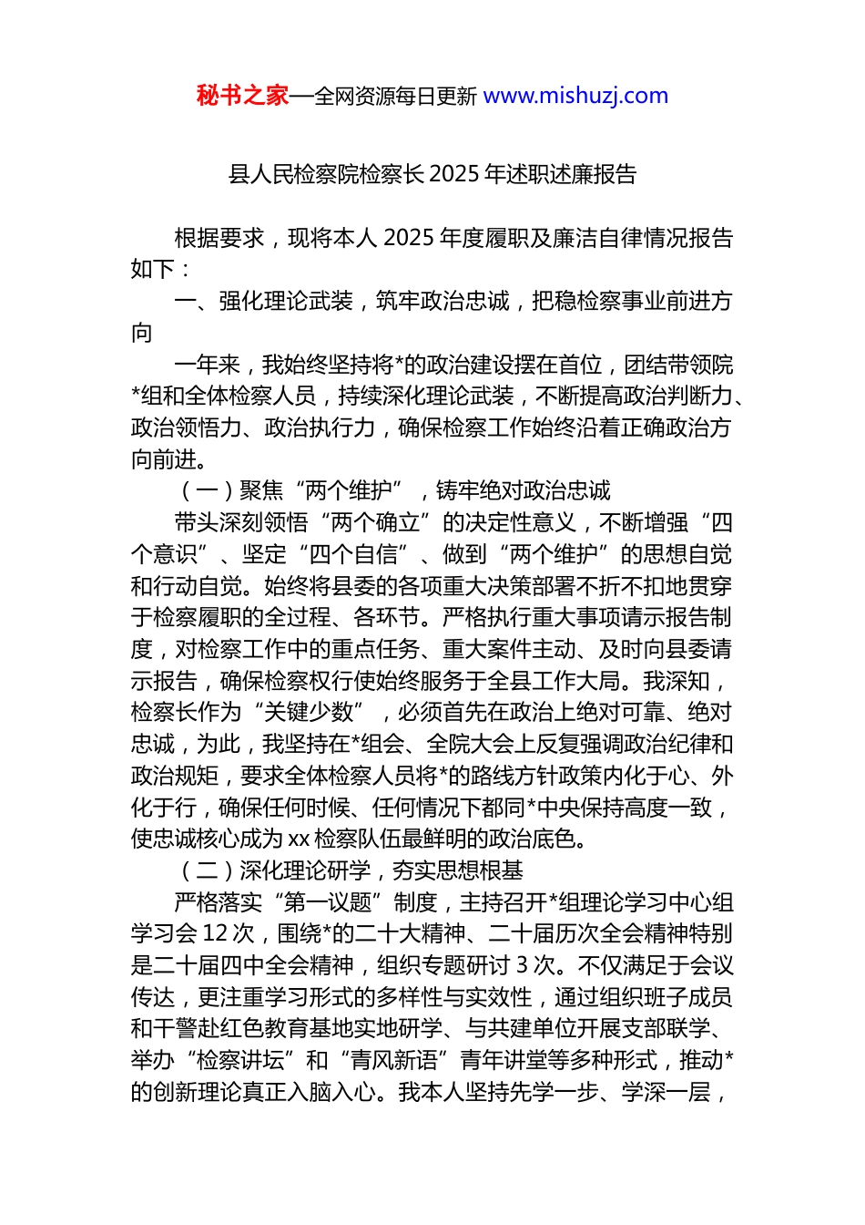 秘书之家—全网资源每日更新 www.mishuzj.com县人民检察院检察长 2025 年述职述廉报告根据要求,现将本人 2025 年度履职及廉洁自律情况报告如下:一、强化理论武装,筑牢政治忠诚,把稳检察事业前进方向一年来,我始终坚持将*的政治建设摆在首位,团结带领院*组和全体检察人员,持续深化理论武装,不断提高政治判断力、政治领悟力、政治执行力,确保检察工作始终沿着正确政治方向前进。(一)聚焦“两个维护”,铸牢绝对政治忠诚带头深刻领悟“两个确立”的决定性意义,不断增强“四个意识”、坚定“四个自信”、做到“两个维护”的思想自觉和行动自觉。始终将县委的各项重大决策部署不折不扣地贯穿于检察履职的全过程、各环节。严格执行重大事项请示报告制度,对检察工作中的重点任务、重大案件主动、及时向县委请示报告,确保检察权行使始终服务于全县工作大局。我深知,检察长作为“关键少数”,必须首先在政治上绝对可靠、绝对忠诚,为此,我坚持在*组会、全院大会上反复强调政治纪律和政治规矩,要求全体检察人员将*的路线方针政策内化于心、外化于行,确保任何时候、任何情况下都同*中央保持高度一致,使忠诚核心成为 xx 检察队伍最鲜明的政治底色。(二)深化理论研学,夯实思想根基严格落实“第一议题”制度,主持召开*组理论学习中心组学习会 12 次,围绕*的二十大精神、二十届历次全会精神特别是二十届四中全会精神,组织专题研讨 3 次。不仅满足于会议传达,更注重学习形式的多样性与实效性,通过组织班子成员和干警赴红色教育基地实地研学、与共建单位开展支部联学、举办“检察讲坛”和“青风新语”青年讲堂等多种形式,推动*的创新理论真正入脑入心。我本人坚持先学一步、学深一层,秘书之家—全网资源每日更新 www.mishuzj.com带头撰写学习心得,带头宣讲全会精神,努力将*中央的战略部署与基层检察实践紧密结合。我要求全院实现干警政治理论学习全覆盖,并着力推动学习成果的转化,引导大家将学习收获切实体现到服务高质量发展、践行司法为民的具体行动中,防止学用“两张皮”。(三)主动接受监督,践行全过程人民民主带领院*组主动将检察工作置于县人大及其常委会的有力监督之下,按照要求就检察官履职情况等专题向县人大常委会作报告,认真研究处理审议意见。我们常态化邀请政协委员走进检察院视察指导、参加公开听证,虚心听取意见建议。持续深化人民监督员制度,新聘、续聘一批听证员,邀请他们参与案件监督评议、公开听证等活动 xx 次,让外部监督深度融入检察办案。我高度重视检务公开,要求充分利用“xx 检察”新媒体矩阵,及时发布重要案件信息、工作动态,以公开促公正、赢公信。通过自觉接受人大法律监督、政协民主监督和社会各界监督,我们努力让每一个司法环节、每一项检察职权都在阳光下运行,确保检察权永不偏离法治轨道和为民宗旨。二、依法履职担当,服务发展大局,以高质效检察履职护航县域现代化(一)聚焦中心工作,全力服务高质量发展我要求全院必须将检察工作置于全县经济社会发展大局中谋划和推进。(二)坚守人民立场,用心用情办好检察为民实事我始终强调,检察履职的成效最终要由人民来评判。(三)深耕主责主业,全面提升法律监督质效我始终将“高质效办好每一个案件”作为基本价值追求,有力推动“四大检察”全面协调充分发展。(四)深化改革管理,夯实高质量发展根基我坚持以科学管理激活履职效能,一体抓实“三个管理”:大力实施数字检察战略,积极运用政法部门大数据平台,检察业务应用系统办案实现全覆盖,与监督智能水平大幅提升。秘书之家—全网资源每日更新 www.mishuzj.com我院大数据法律监督模型应用获全市竞赛优胜。三、严守纪律规矩,筑牢廉洁防线,永葆清正廉洁的政治本色作为*风廉政建设第一责任人,我始终坚持严的主基调,带头落实全面从严治*政治责任,努力打造忠诚干净担当的检察铁军。(一)严格落实主体责任,纵深推进全面从严治*我认真履行第一责任人职责,主持召开*风廉政建设专题会议,分析研判形势,部署工作任务,与班子成员、部门负责人层层签订责任书,压实“一岗双责”。坚持“五必谈”工...