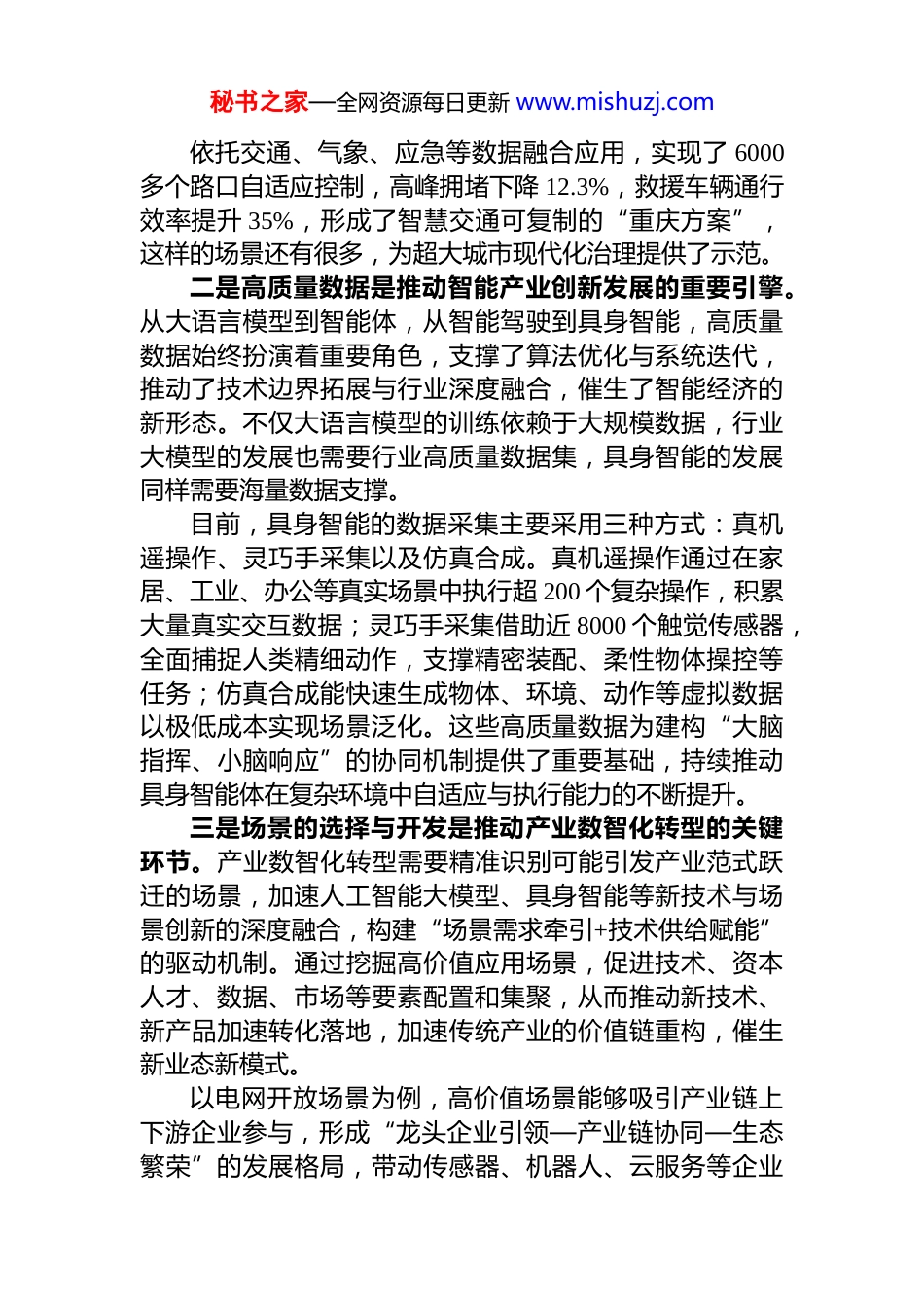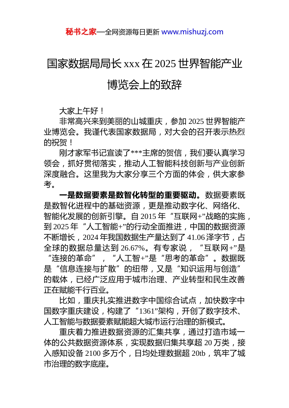 秘书之家—全网资源每日更新 www.mishuzj.com国家数据局局长 xxx 在 2025 世界智能产业博览会上的致辞大家上午好!非常高兴来到美丽的山城重庆,参加 2025 世界智能产业博览会。我谨代表国家数据局,对大会的召开表示热烈的祝贺!刚才家军书记宣读了***主席的贺信,我们要认真学习领会,抓好贯彻落实,推动人工智能科技创新与产业创新深度融合。这里我为大家分享三个方面的体会,供大家参考。一是数据要素是数智化转型的重要驱动。数据要素既是数智化进程中的基础资源,更是推动数字化、网络化、智能化发展的创新引擎。自 2015 年“互联网+”战略的实施,到 2025 年“人工智能+”的行动全面推进,中国的数据资源不断增长,2024 年我国数据生产量达到了 41.06 泽字节,占全球的数据总量达到 26.67%。有专家说,“互联网+”是“连接的革命”,“人工智+”是“思考的革命”。数据既是“信息连接与扩散”的纽带,又是“知识运用与创造”的载体,已经广泛应用于城市治理、产业转型和民生改善正在赋能千行百业。比如,重庆扎实推进数字中国综合试点,加快数字中国数字重庆建设,构建了“1361”架构,开创了数字技术、人工智能与数据要素赋能超大城市运行治理的新模式。重庆着力推进数据资源的汇集共享,通过打造市域一体的公共数据资源体系,实现数据归集共享超 20 万类,接入感知设备 2100 多万个,日均处理数据超 20tb,筑牢了城市治理的数字底座。秘书之家—全网资源每日更新 www.mishuzj.com依托交通、气象、应急等数据融合应用,实现了 6000多个路口自适应控制,高峰拥堵下降 12.3%,救援车辆通行效率提升 35%,形成了智慧交通可复制的“重庆方案”,这样的场景还有很多,为超大城市现代化治理提供了示范。二是高质量数据是推动智能产业创新发展的重要引擎。从大语言模型到智能体,从智能驾驶到具身智能,高质量数据始终扮演着重要角色,支撑了算法优化与系统迭代,推动了技术边界拓展与行业深度融合,催生了智能经济的新形态。不仅大语言模型的训练依赖于大规模数据,行业大模型的发展也需要行业高质量数据集,具身智能的发展同样需要海量数据支撑。目前,具身智能的数据采集主要采用三种方式:真机遥操作、灵巧手采集以及仿真合成。真机遥操作通过在家居、工业、办公等真实场景中执行超 200 个复杂操作,积累大量真实交互数据;灵巧手采集借助近 8000 个触觉传感器,全面捕捉人类精细动作,支撑精密装配、柔性物体操控等任务;仿真合成能快速生成物体、环境、动作等虚拟数据以极低成本实现场景泛化。这些高质量数据为建构“大脑指挥、小脑响应”的协同机制提供了重要基础,持续推动具身智能体在复杂环境中自适应与执行能力的不断提升。三是场景的选择与开发是推动产业数智化转型的关键环节。产业数智化转型需要精准识别可能引发产业范式跃迁的场景,加速人工智能大模型、具身智能等新技术与场景创新的深度融合,构建“场景需求牵引+技术供给赋能”的驱动机制。通过挖掘高价值应用场景,促进技术、资本人才、数据、市场等要素配置和集聚,从而推动新技术、新产品加速转化落地,加速传统产业的价值链重构,催生新业态新模式。以电网开放场景为例,高价值场景能够吸引产业链上下游企业参与,形成“龙头企业引领—产业链协同—生态繁荣”的发展格局,带动传感器、机器人、云服务等企业秘书之家—全网资源每日更新 www.mishuzj.com协同创新,提升整个产业智能化水平。自国家数据局成立以来,我们以数据要素市场化配置改革为主线,系统谋划、精准发力,会同各部门、各地区持续完善数据基础制度,加快建设数据基础设施,加强数据场景应用,推动数据流通交易,促进数据产业发展,加快释放数据要素价值,赋能经济社会高质量发展。在工作中,我们也清醒地认识到,行业高质量数据集建设工作总体上还处于起步阶段,尚存在为数据付费的意识不强、数据价格机制尚未有效形成、参与主体不够广泛行业高质量数据供给质量有待提高等亟需解决和完善的问题。下一步,我们将把深化数据要素赋能人工智能创新发展作为数据领域的重点工作,通过建立健全数据基础制度加快建设数...