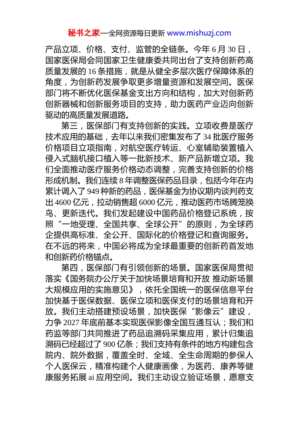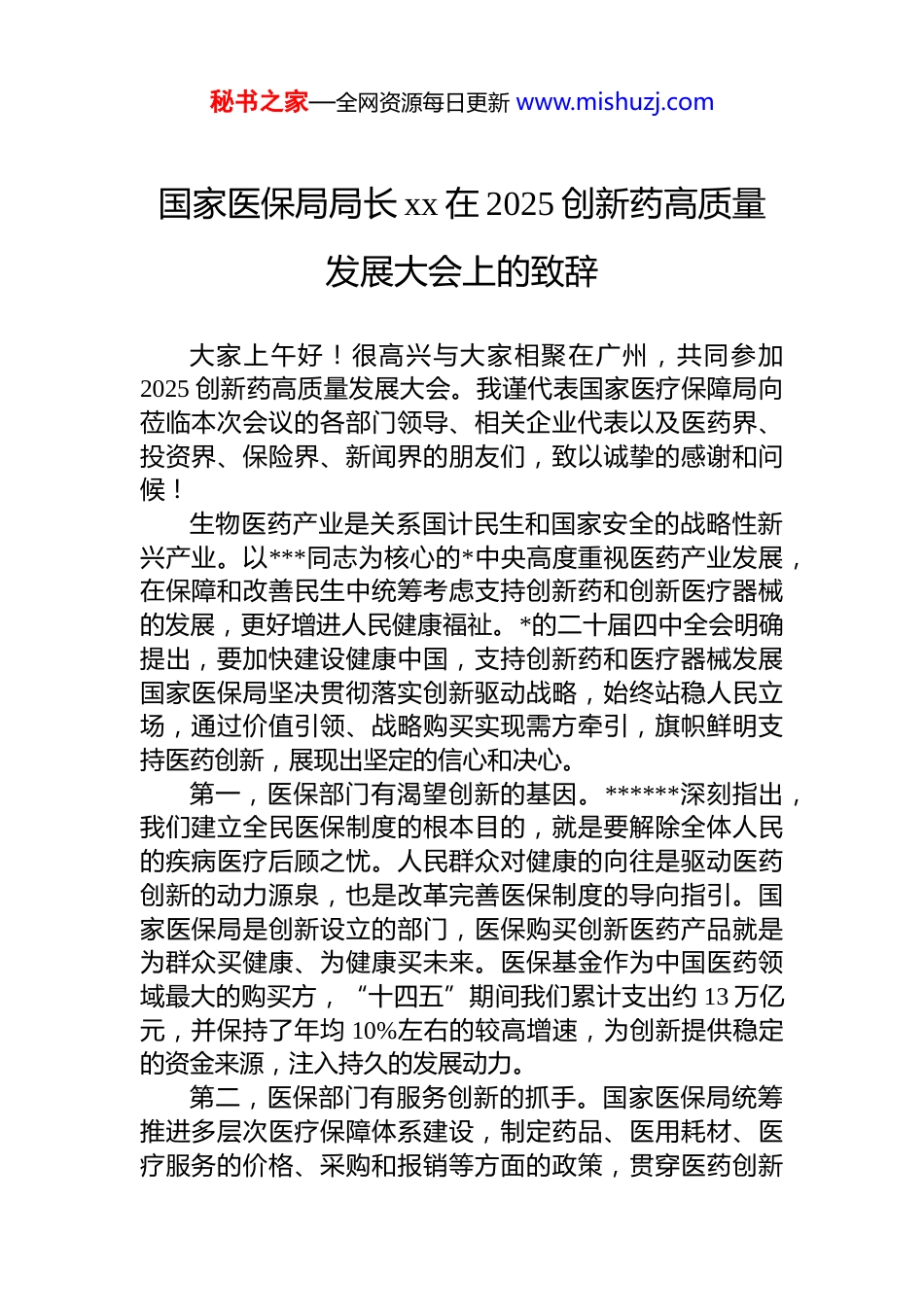 秘书之家—全网资源每日更新 www.mishuzj.com国家医保局局长 xx 在 2025 创新药高质量发展大会上的致辞大家上午好!很高兴与大家相聚在广州,共同参加2025 创新药高质量发展大会。我谨代表国家医疗保障局向莅临本次会议的各部门领导、相关企业代表以及医药界、投资界、保险界、新闻界的朋友们,致以诚挚的感谢和问候!生物医药产业是关系国计民生和国家安全的战略性新兴产业。以***同志为核心的*中央高度重视医药产业发展,在保障和改善民生中统筹考虑支持创新药和创新医疗器械的发展,更好增进人民健康福祉。*的二十届四中全会明确提出,要加快建设健康中国,支持创新药和医疗器械发展国家医保局坚决贯彻落实创新驱动战略,始终站稳人民立场,通过价值引领、战略购买实现需方牵引,旗帜鲜明支持医药创新,展现出坚定的信心和决心。第一,医保部门有渴望创新的基因。******深刻指出,我们建立全民医保制度的根本目的,就是要解除全体人民的疾病医疗后顾之忧。人民群众对健康的向往是驱动医药创新的动力源泉,也是改革完善医保制度的导向指引。国家医保局是创新设立的部门,医保购买创新医药产品就是为群众买健康、为健康买未来。医保基金作为中国医药领域最大的购买方,“十四五”期间我们累计支出约 13 万亿元,并保持了年均 10%左右的较高增速,为创新提供稳定的资金来源,注入持久的发展动力。第二,医保部门有服务创新的抓手。国家医保局统筹推进多层次医疗保障体系建设,制定药品、医用耗材、医疗服务的价格、采购和报销等方面的政策,贯穿医药创新秘书之家—全网资源每日更新 www.mishuzj.com产品立项、价格、支付、监管的全链条。今年 6 月 30 日,国家医保局会同国家卫生健康委共同出台了支持创新药高质量发展的 16 条措施,就是从健全多层次医疗保障体系的角度,为创新药发展争取更多增量资源和发展空间。医保部门将不断优化医保基金支出方向和结构,加大对创新药创新器械和创新服务项目的支持,助力医药产业迈向创新驱动的高质量发展道路。第三,医保部门有支持创新的实践。立项收费是医疗技术应用的基础,去年以来我们密集发布了 34 批医疗服务价格项目立项指南,对航空医疗转运、心室辅助装置植入侵入式脑机接口植入等一批新技术、新产品新增立项。我们全面推动医疗服务价格动态调整,完善支持创新的价格形成机制。我们连续 8 年调整医保药品目录,包括今年在内累计调入了 949 种新的药品,医保基金为协议期内谈判药支出 4600 亿元,拉动销售超 6000 亿元,推动医药市场腾笼换鸟、更新迭代。我们发起建设中国药品价格登记系统,按照“一地受理、全国共享、全球公开”的原则,为全球药企提供高标准、全公开、国际化的价格登记和查询服务。在不远的将来,中国必将成为全球最重要的创新药首发地和创新药价格锚点。第四,医保部门有引领创新的场景。国家医保局贯彻落实《国务院办公厅关于加快场景培育和开放 推动新场景大规模应用的实施意见》,依托全国统一的医保信息平台加快基于医保数据、医保立项和医保支付的场景培育和开放。我们主动搭建预设场景,加快医保“影像云”建设,力争 2027 年底前基本实现医保影像全国互通互认;我们和药监等部门共同推进了药品追溯码采集应用,累计归集追溯码已经超过了 900 亿条;我们支持有条件的地方构建包含院内、院外数据,覆盖全时、全域、全生命周期的参保人个人医保云,精准构建个人健康画像,为医药、康养等健康服务拓展 ai 应用空间。我们主动设立验证场景,愿意支秘书之家—全网资源每日更新 www.mishuzj.com持有条件的地方根据技术成熟度开展分病种多模态 ai 辅助诊疗、医保影像云 ai 识图、模拟人和健康传感器智能感知、非侵入式脑机接口医保应用等场景验证比赛,推动科技创新与医疗保障深度融合。我们主动构建评价场景,探索建立医保综合价值评价体系,将真实世界数据作为医保在医药产品准入、动态管理、移出和立项等方面的重要决策依据。通过新场景大规模应用,医保部门正在努力为医药的新技术新方法新产品铺就一条从“概念-实验室产品-医保预备立项-医保验证-医保立项-医保评价-...