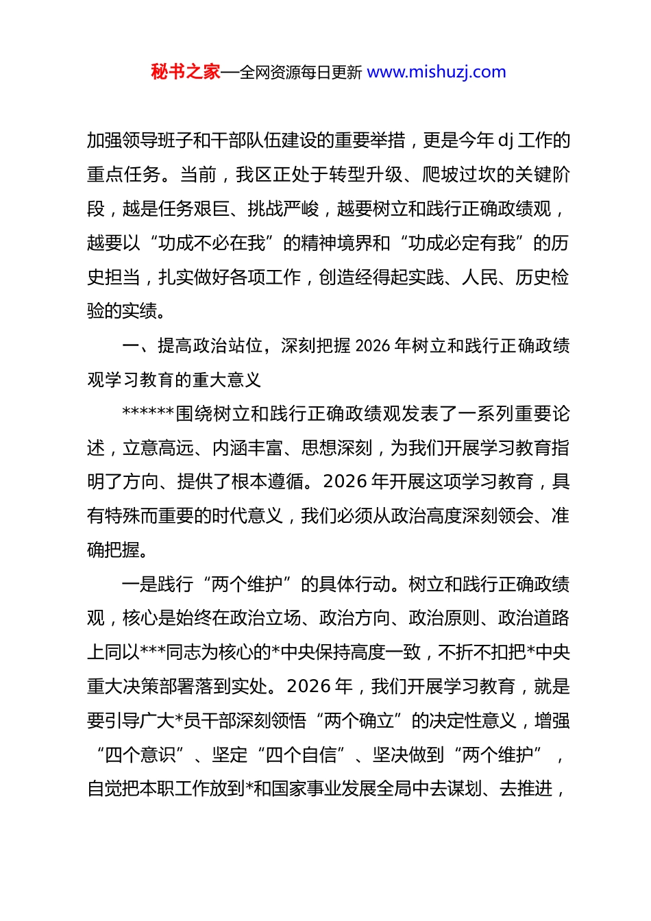 秘书之家—全网资源每日更新 www.mishuzj.com2026 年树立和践行正确政绩观学习教育宣讲稿同志们:根据*中央统一部署和区委工作安排,今天我们开展树立和践行正确政绩观学习教育专题宣讲,主要目的是深入学习贯彻******关于树立和践行正确政绩观的重要论述,全面落实中共中央办公厅印发的《关于在全*开展树立和践行正确政绩观学习教育的通知》要求,结合区内外实践案例和我区工作实际,引导广大*员干部深刻把握正确政绩观的核心要义、实践要求,切实把思想和行动统一到*中央决策部署和区委工作安排上来,以正确政绩观引领干事创业,为推动我区“十五五”开好局、起好步,加快建设美丽 xx 先行区和美丽暖城示范区提供坚强保障。2026 年,是全面贯彻*的二十届四中全会精神、确保基本实现社会主义现代化取得决定性进展的关键一年,也是开展树立和践行正确政绩观学习教育的重要一年。此次学习教育以县处级以上领导班子和领导干部特别是“一把手”为重点,于2026 年春节假期后启动、7 月底基本结束,是*中央从*和国家事业发展战略全局出发所作的重大决策部署,是新时代新征程秘书之家—全网资源每日更新 www.mishuzj.com加强领导班子和干部队伍建设的重要举措,更是今年 dj 工作的重点任务。当前,我区正处于转型升级、爬坡过坎的关键阶段,越是任务艰巨、挑战严峻,越要树立和践行正确政绩观,越要以“功成不必在我”的精神境界和“功成必定有我”的历史担当,扎实做好各项工作,创造经得起实践、人民、历史检验的实绩。一、提高政治站位,深刻把握 2026 年树立和践行正确政绩观学习教育的重大意义******围绕树立和践行正确政绩观发表了一系列重要论述,立意高远、内涵丰富、思想深刻,为我们开展学习教育指明了方向、提供了根本遵循。2026 年开展这项学习教育,具有特殊而重要的时代意义,我们必须从政治高度深刻领会、准确把握。一是践行“两个维护”的具体行动。树立和践行正确政绩观,核心是始终在政治立场、政治方向、政治原则、政治道路上同以***同志为核心的*中央保持高度一致,不折不扣把*中央重大决策部署落到实处。2026 年,我们开展学习教育,就是要引导广大*员干部深刻领悟“两个确立”的决定性意义,增强“四个意识”、坚定“四个自信”、坚决做到“两个维护”,自觉把本职工作放到*和国家事业发展全局中去谋划、去推进,秘书之家—全网资源每日更新 www.mishuzj.com确保*中央关于高质量发展、民生保障、生态保护等各项部署在我区落地生根、开花结果。正如 xx 区委在*的建设工作领导小组会议上强调的,开展学习教育是贯彻落实*的二十届四中全会战略部署、巩固拓展*内集中学习教育成果、持之以恒推进全面从严治*的有效途径,必须提高政治站位,自觉将思想和行动统一到*中央、市委各项安排部署上来。二是推动高质量发展的必然要求。当前,我国发展进入战略机遇和风险挑战并存、不确定难预料因素增多的时期,我区发展也面临着诸多新机遇、新挑战。2026 年是我区“十五五”规划实施的开局之年,推动高质量发展,关键在于引导广大*员干部树立正确政绩观,摒弃急功近利、急于求成的思想,坚持实事求是、求真务实,自觉贯彻新发展理念,加快构建新发展格局。康巴什区委在举办树立和践行正确政绩观学习教育读书班时明确提出,要切实把学习成果转化为干事创业的强大动力,推动康巴什“十五五”开好局、起好步,全力建设美丽xx 先行区和美丽暖城示范区,这正是我们以正确政绩观引领高质量发展的生动实践。三是践行*的根本宗旨的重要举措。民心是最大的政治,为民造福是最大的政绩。我们*为人民而生、因人民而兴,共产*人干事业、创政绩,为的就是造福人民。2026 年开展学习教秘书之家—全网资源每日更新 www.mishuzj.com育,就是要引导广大*员干部始终站稳人民立场,牢记全心全意为人民服务的根本宗旨,聚焦人民群众最关心最直接最现实的利益问题,采取更多可感可及的具体举措,在幼有所育、学有所教、劳有所得、病有所医、老有所养、住有所居、弱有所扶等方面持续用力,让现代化建设成果更多更公平惠及全体人民。正如人民网 dj 频道文章所强调的,*员干部应...