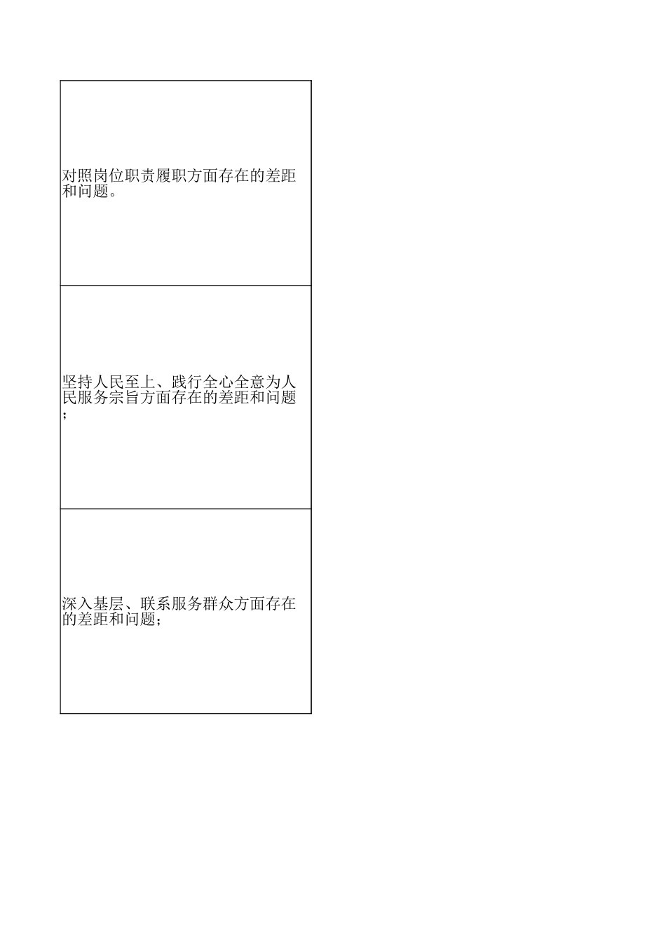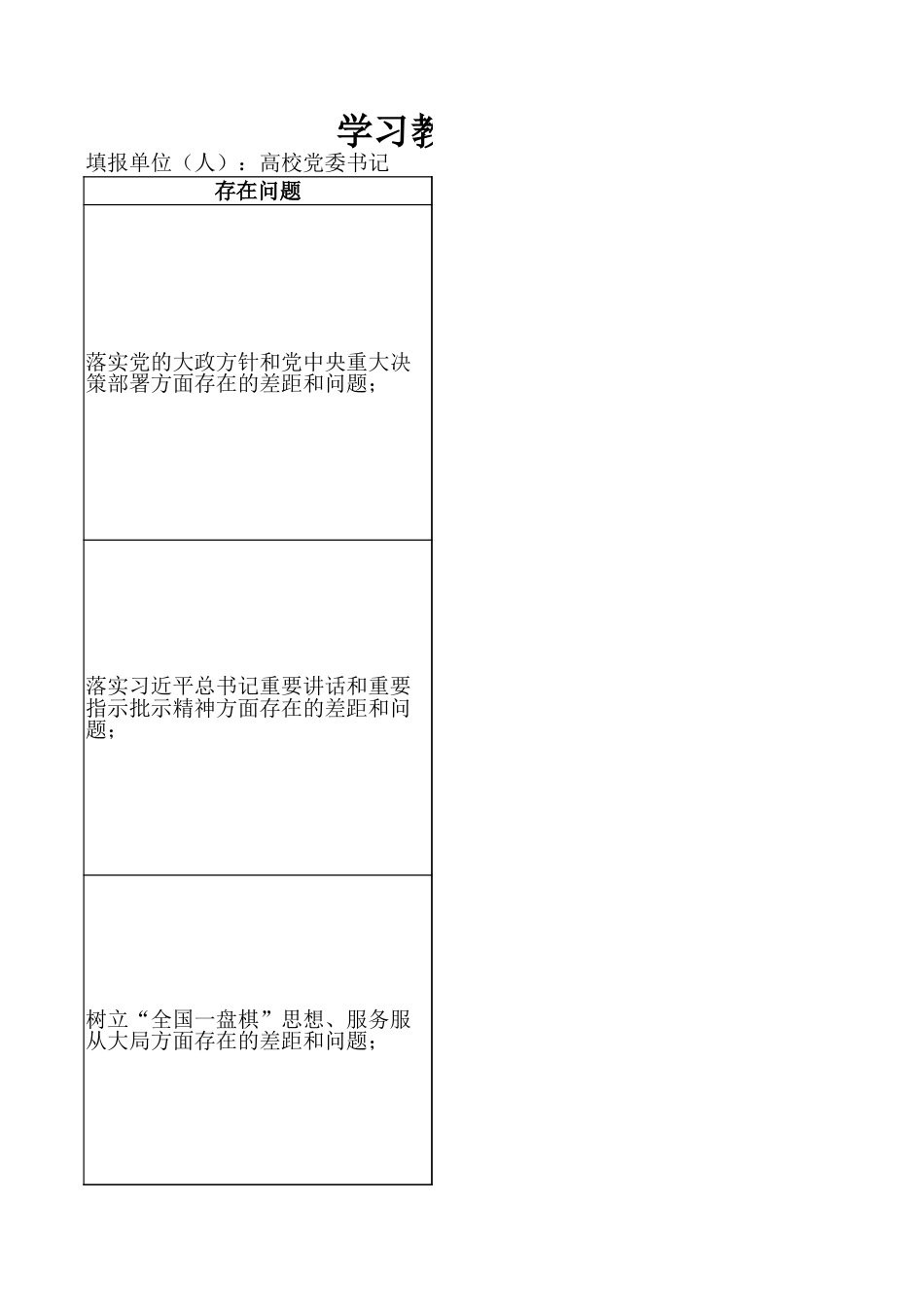 学习教育查摆问题清单(高校党委书填报单位(人):高校党委书记 填报时间:存在问题落实党的大政方针和党中央重大决策部署方面存在的差距和问题;落实习近平总书记重要讲话和重要指示批示精神方面存在的差距和问题;树立“全国一盘棋”思想、服务服从大局方面存在的差距和问题;对照岗位职责履职方面存在的差距和问题。坚持人民至上、践行全心全意为人民服务宗旨方面存在的差距和问题;深入基层、联系服务群众方面存在的差距和问题;政策规划“翻烧饼”的问题;推动解决民生、信访、群众急难愁盼问题方面存在的差距和不足;贯彻执行民主集中制方面存在的差距和问题;违反群众意愿不切实际决策的问题;新官不理旧账方面存在的具体问题;急功近利、盲目蛮干、违规新增地方政府隐性债务的问题;弄虚作假方面存在的具体问题;畏难避责、斗争精神不强的问题;搞“形象工程”、“政绩工程”的问题;工作方法简单、搞“一刀切”的问题;学习教育查摆问题清单(高校党委书记个人)书记 填报时间:具体表现1. 作为党委书记,对党中央关于教育强国建设、高校党建和立德树人等重大部署,虽然能时组织学习传达,但亲自研究、亲自谋划、亲自推动还不够经常,结合学校特点把中央要化为具体思路和务实举措还不够深入。2. 在抓党中央重大决策部署落实上,第一责任人职责压得还不够实,对重点任务的责任分推进节奏、督查问效和结果运用盯得还不够紧,个别事项存在部署后跟踪不够、推进不均问题。3. 从政治高度和全局角度把方向、管大局、作决策、保落实做得还不够充分,对一些事关改革发展稳定的重要事项前瞻性谋划不够,对末端落实情况掌握还不够及时全面。1. 对习近平总书记关于教育、科技、人才工作以及高校党的建设、思想政治工作的重要讲重要指示批示精神,系统学、跟进学、联系实际学做得还不够,专题研究和深度思考还需步加强。2. 在推动总书记重要讲话和重要指示批示精神落地方面,有时更多停留在传达部署和原则层面,转化为制度安排、工作清单、任务闭环和具体抓手还不够有力,示范带动作用发挥够充分。3. 对贯彻落实情况的督查督办和“回头看”还不够严格,对哪些工作推进到位、哪些落实在偏差掌握得不够及时,对责任链条压实和问题整改跟踪还不够紧。1. 站在服务国家战略和区域发展大局的高度思考学校工作还不够主动,对高校在服务现代设中的职责使命把握还需进一步深化,有时更多从学校自身发展需要出发考虑问题。2. 在统筹学校学科布局、人才培养、科技创新和社会服务与国家重大战略需求、区域发展相衔接方面,前瞻性谋划和主动对接还不够,亲自推动重大合作、重点事项的力度仍需加3. 对一些涉及全校层面、跨部门协同的重点工作,统筹调度和协调推动还不够有力,破条割、形成全校“一盘棋”推进格局上还存在差距。1. 作为党委书记,在履行抓班子、带队伍、强党建、促发展职责方面还不够严实,对一些事项亲自研究、关键环节亲自把关、重点任务亲自督办还不够到位,以上率下作用还需进发挥。2. 对党委领导下的校长负责制落实情况统筹把握还不够精准,对党政沟通协调、议事规则、权责边界衔接等方面抓得还不够细,推动形成高效顺畅运行机制还有不足。3. 对学校改革发展中的重点难点问题,抓宏观谋划较多,抓具体推进和末端落实较少,对工作中存在的梗阻点、风险点和薄弱环节掌握不够及时。1. 对坚持师生至上、办学为民的理念还需进一步深化,在研究重大事项和推动重点工作时时从学校整体运行和管理要求考虑较多,从师生立场换位思考还不够充分。2. 对师生关心关注的教育教学、就业发展、后勤服务、待遇保障等问题,虽然能够重视,自过问、专题研究、持续推动解决还不够到位,解决问题的系统性和穿透力还需加强。3. 在评价工作成效时,对师生感受度、满意度和获得感关注还不够充分,对一些工作“师么看、基层怎么评”考虑得还不够细,群众路线践行还不够扎实。1. 深入基层联系师生还不够经常,到院系、实验室、课堂、学生社区和服务窗口了解情况结合会议和调研安排进行,随机走访、蹲点调研、沉到一线听真话还不够。2. 与基层干部、教师和学生面对面交流还不够深入,听...