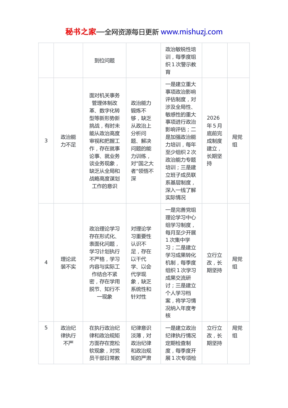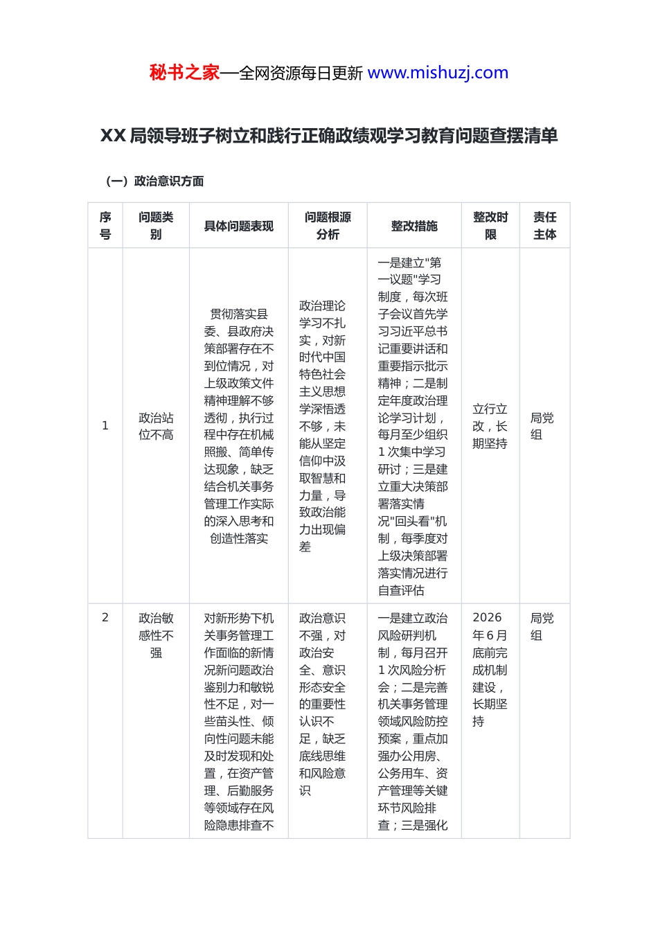 秘书之家—全网资源每日更新 www.mishuzj.comXX 局领导班子树立和践行正确政绩观学习教育问题查摆清单(一)政治意识方面序号问题类别具体问题表现问题根源分析整改措施整改时限责任主体1政治站位不高贯彻落实县委、县政府决策部署存在不到位情况,对上级政策文件精神理解不够透彻,执行过程中存在机械照搬、简单传达现象,缺乏结合机关事务管理工作实际的深入思考和创造性落实政治理论学习不扎实,对新时代中国特色社会主义思想学深悟透不够,未能从坚定信仰中汲取智慧和力量,导致政治能力出现偏差一是建立"第一议题"学习制度,每次班子会议首先学习习近平总书记重要讲话和重要指示批示精神;二是制定年度政治理论学习计划,每月至少组织1 次集中学习研讨;三是建立重大决策部署落实情况"回头看"机制,每季度对上级决策部署落实情况进行自查评估立行立改,长期坚持局党组2政治敏感性不强对新形势下机关事务管理工作面临的新情况新问题政治鉴别力和敏锐性不足,对一些苗头性、倾向性问题未能及时发现和处置,在资产管理、后勤服务等领域存在风险隐患排查不政治意识不强,对政治安全、意识形态安全的重要性认识不足,缺乏底线思维和风险意识一是建立政治风险研判机制,每月召开1 次风险分析会;二是完善机关事务管理领域风险防控预案,重点加强办公用房、公务用车、资产管理等关键环节风险排查;三是强化2026年 6 月底前完成机制建设,长期坚持局党组秘书之家—全网资源每日更新 www.mishuzj.com到位问题政治敏锐性培训,每季度组织 1 次警示教育3政治能力不足面对机关事务管理体制改革、数字化转型等新形势新挑战,有时未能从政治高度审视和把握工作,存在就事论事、就业务谈业务现象,缺乏从全局和战略高度谋划工作的意识政治能力锻炼不够,缺乏从政治上分析问题、解决问题的能力训练,对"国之大者"领悟不深一是建立重大事项政治影响评估制度,对涉及全局性、敏感性的重大事项进行政治影响评估;二是加强政治能力培训,每年至少组织 2 次政治能力专题培训;三是建立班子成员联系基层制度,深入一线了解实际情况2026年 5 月底前完成制度建立,长期坚持局党组4理论武装不实政治理论学习存在形式化、表面化问题,学习计划执行不严格,学习内容与实际工作结合不紧密,存在学用脱节、知行不一现象对理论学习重要性认识不足,存在以干代学、以会代学现象,缺乏系统性和针对性一是完善党组理论学习中心组学习制度,每月至少开展1 次集中学习;二是建立学习成果转化机制,每季度组织 1 次学习成果交流研讨;三是建立个人学习档案,将学习情况纳入年度考核立行立改,长期坚持局党组5政治纪律执行不严在执行政治纪律和政治规矩方面存在宽松软现象,对党员干部日常教纪律意识淡薄,对政治纪律和政治规矩的严肃一是建立政治纪律执行情况定期检查制度,每季度开展 1 次专项检立行立改,长期坚持局党组秘书之家—全网资源每日更新 www.mishuzj.com育管理监督不够严格,存在"老好人"思想,对一些违规违纪苗头未能及时提醒和纠正性认识不足,存在"小节无害"的错误认识查;二是完善党员干部日常监督机制,建立廉政谈话制度;三是严格执纪问责,对违反政治纪律的行为"零容忍"(二)宗旨观念方面序号问题类别具体问题表现问题根源分析整改措施整改时限责任主体6宗旨意识淡化存在官僚主义倾向,宗旨意识淡化,以管理者自居,缺乏服务意识,对机关干部职工的实际需求关注不够,在餐饮服务、物业服务等方面存在质量不高、回应不及时问题群众观念淡薄,忘记了"我是谁、为了谁、依靠谁"的根本问题,缺乏以人民为中心的发展思想一是开展"换位思考、用心服务"主题活动,每月组织 1 次服务对象座谈会;二是建立服务质量满意度测评机制,每季度开展 1 次满意度调查;三是完善服务投诉处理机制,确保投诉件件有回音、事事有落实立行立改,长期坚持局党组7群众观念淡薄服务意识差,群众观念淡薄,服务意识不强,主动性不强,对机关干部职工反映的问题存在推诿扯皮、敷衍脱离群众、脱离实际,缺乏深入基层、深入一线的工作作风,对群众急难愁盼问题了解不一是建立班子成员定期走访制度,...