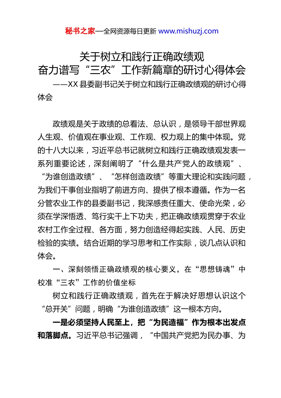 秘书之家—全网资源每日更新 www.mishuzj.com关于树立和践行正确政绩观奋力谱写“三农”工作新篇章的研讨心得体会——XX 县委副书记关于树立和践行正确政绩观的研讨心得体会政绩观是关于政绩的总看法、总认识,是领导干部世界观人生观、价值观在事业观、工作观、权力观上的集中体现。党的十八大以来,习近平总书记就树立和践行正确政绩观发表一系列重要论述,深刻阐明了“什么是共产党人的政绩观”、“为谁创造政绩”、“怎样创造政绩”等重大理论和实践问题,为我们干事创业指明了前进方向、提供了根本遵循。作为一名分管农业工作的县委副书记,我深感责任重大、使命光荣,必须在学深悟透、笃行实干上下功夫,把正确政绩观贯穿于农业农村工作全过程、各方面,努力创造经得起实践、人民、历史检验的实绩。结合近期的学习思考和工作实际,谈几点认识和体会。一、深刻领悟正确政绩观的核心要义,在“思想铸魂”中校准“三农”工作的价值坐标树立和践行正确政绩观,首先在于解决好思想认识这个“总开关”问题,明确“为谁创造政绩”这一根本方向。一是必须坚持人民至上,把“为民造福”作为根本出发点和落脚点。习近平总书记强调,“中国共产党把为民办事、为秘书之家—全网资源每日更新 www.mishuzj.com民造福作为最重要的政绩”。农业农村工作直接面向广大农民群众,关乎亿万农民的切身利益。分管的每一项工作,无论是粮食生产、乡村产业发展,还是人居环境整治、乡村治理,最终都要看农民群众是否真正受益、是否真正满意。要始终站稳人民立场,把群众的呼声作为第一信号,把群众的需求作为第一选择,把群众的满意作为第一标准。绝不能搞“形象工程”、“面子工程”,绝不能为了个人升迁或一时轰动效应,而忽视了农民群众的实际感受和长远利益。要深入田间地头、农家院落,与群众面对面、心贴心,真正了解他们在想什么、盼什么、急什么、怨什么,把工作做到群众心坎上,让农业强、农村美、农民富的成果惠及每一位父老乡亲。二是必须坚持实事求是,把“符合实际”作为谋划工作的基本前提。正确政绩观要求我们想问题、作决策、办事情,必须一切从实际出发,尊重客观规律。我县是农业大县,但不同乡镇、不同村庄的自然禀赋、产业基础、发展水平千差万别。在推进农业现代化、实施乡村振兴战略过程中,绝不能搞“一刀切”、“齐步走”,不能盲目攀比、急于求成。要大兴调查研究之风,把情况摸清、把问题找准、把对策提实。比如,发展特色产业,不能看到其他地方种什么赚钱就一哄而上,而要立足本地资源禀赋和市场需求,宜种则种、宜养则养、宜林则林、宜游则游,走差异化、特色化发展之路。制定政策措施,要充分考虑基层的承受能力和群众的接受程度,确保各项决策秘书之家—全网资源每日更新 www.mishuzj.com部署符合客观规律、符合县情实际、符合群众期盼。三是必须坚持着眼长远,把“利在千秋”作为检验成效的重要标尺。农业是基础产业,也是“慢工出细活”的事业。农业生产的周期性、农业基础设施建设的长期性、农业生态环境修复的艰巨性,决定了“三农”工作不可能一蹴而就,必须保持历史耐心和战略定力。树立正确政绩观,就要有“功成不必在我”的精神境界和“功成必定有我”的历史担当。要正确处理当前与长远、显绩与潜绩的关系。既要立足当前,解决好农民群众急难愁盼的问题,抓好粮食稳产保供、农民增收致富等当务之急;更要着眼长远,多做打基础、利长远、惠子孙的事情,比如扎实推进高标准农田建设、持续改善农村水利设施、加强农业种质资源保护利用、久久为功抓好农村生态环境保护等。绝不能为了短期“显绩”而透支资源、破坏环境、留下后患。二、准确把握正确政绩观的实践要求,在“实干笃行”中推动“三农”工作高质量发展树立和践行正确政绩观,最终要落脚到推动发展、造福于民的实干实绩上。结合分管工作,我将重点在以下几个方面发力:(一)聚焦“国之大者”,在保障粮食安全和重要农产品供给上展现新担当。粮食安全是“国之大者”,是农业农村工作的首要任务,也是衡量我们政绩的底线要求。秘书之家—全网资源每日更新 www.mishuzj.com一是坚决扛牢粮食安全政治责...