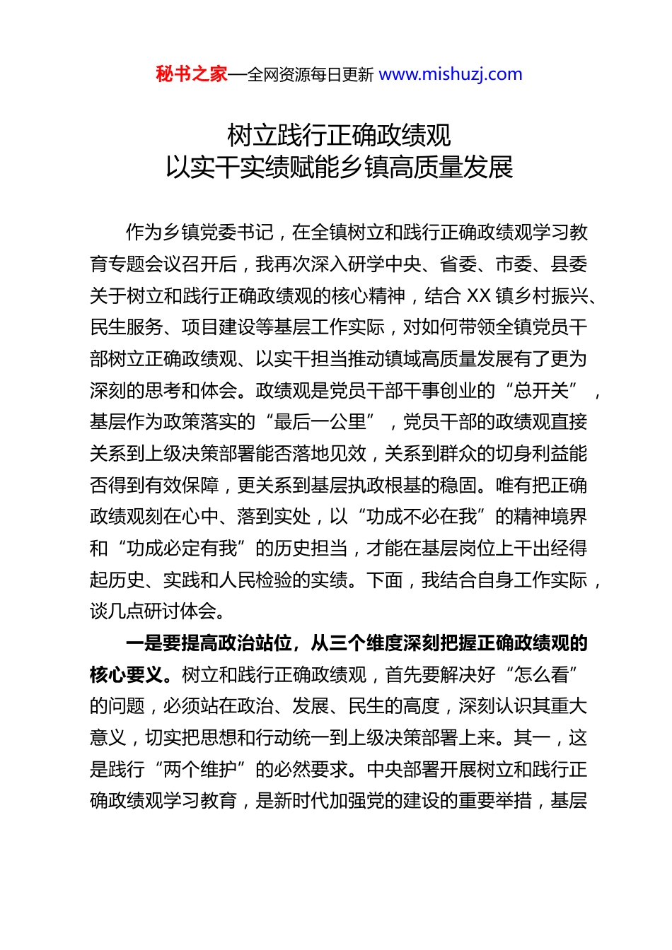 秘书之家—全网资源每日更新 www.mishuzj.com树立践行正确政绩观以实干实绩赋能乡镇高质量发展作为乡镇党委书记,在全镇树立和践行正确政绩观学习教育专题会议召开后,我再次深入研学中央、省委、市委、县委关于树立和践行正确政绩观的核心精神,结合 XX 镇乡村振兴、民生服务、项目建设等基层工作实际,对如何带领全镇党员干部树立正确政绩观、以实干担当推动镇域高质量发展有了更为深刻的思考和体会。政绩观是党员干部干事创业的“总开关”,基层作为政策落实的“最后一公里”,党员干部的政绩观直接关系到上级决策部署能否落地见效,关系到群众的切身利益能否得到有效保障,更关系到基层执政根基的稳固。唯有把正确政绩观刻在心中、落到实处,以“功成不必在我”的精神境界和“功成必定有我”的历史担当,才能在基层岗位上干出经得起历史、实践和人民检验的实绩。下面,我结合自身工作实际,谈几点研讨体会。一是要提高政治站位,从三个维度深刻把握正确政绩观的核心要义。树立和践行正确政绩观,首先要解决好“怎么看”的问题,必须站在政治、发展、民生的高度,深刻认识其重大意义,切实把思想和行动统一到上级决策部署上来。其一,这是践行“两个维护”的必然要求。中央部署开展树立和践行正确政绩观学习教育,是新时代加强党的建设的重要举措,基层秘书之家—全网资源每日更新 www.mishuzj.com党员干部作为党的政策执行者,只有深刻领会核心精神、吃透上级部署,才能确保工作始终沿着正确政治方向前进,杜绝思想上松懈、行动上滞后的问题,以思想自觉引领行动自觉,把“两个维护”体现在实干实绩中。其二,这是赋能镇域高质量发展的现实需要。当前 XX 镇正处于推进乡村振兴、攻坚重点项目、补齐民生短板的关键阶段,紧扣“项目攻坚年”和“扬优强能、建功支点”主线推动发展,需要全镇上下树立一盘棋思想,以正确的政绩观破除发展中的思想障碍、解决工作中的突出问题,凝聚起干事创业的强大合力。其三,这是扎牢基层执政根基的关键所在。乡镇工作直面群众,村社政治生态直接影响党群干群关系,树立正确政绩观是涵养风清气正基层政治生态的重要抓手,能引导党员干部摒弃私心杂念、聚焦为民服务,让基层干部的工作思路、工作举措始终与群众期盼同频共振,切实赢得群众的信任和支持。二是要聚焦核心要求,从四个方面精准纠治政绩观偏差问题。树立和践行正确政绩观,关键要把握好“干什么”的方向,紧扣“立党为公、为民造福、科学决策、真抓实干”总要求,结合基层工作特点靶向发力,坚决防范和纠治政绩观偏差问题。其一,锚定为民初心,把“为民造福”作为政绩的根本标尺。政绩好不好,群众最有发言权,基层工作的出发点和落脚点始终是为人民群众谋幸福,要坚决摒弃“为了政绩干工作”的错误思维,始终把群众的急难愁盼放在心上,聚焦就业、教育、秘书之家—全网资源每日更新 www.mishuzj.com医疗、养老、人居环境整治等民生领域,把群众的“小事”当作“大事”来办,让发展成果更多更公平惠及全镇群众。其二,坚持科学决策,以“精准谋划”筑牢政绩的坚实基础。基层工作千头万绪,各村社资源禀赋、发展基础各不相同,切忌拍脑袋决策、搞“一刀切”,要立足 XX 镇实际,统筹推进深学细悟、对标检视、整改提升、标本兼治、开门纳谏各项工作,广泛听取群众意见、汲取基层智慧,让决策更符合实际、更贴合民心,避免出现“劳民伤财的形象工程”“脱离实际的政绩工程”。其三,突出实干导向,坚决摒弃“重显绩轻潜绩、重形式轻实效”的误区。基层发展既要抓看得见、摸得着的显性政绩,比如重点项目建设、民生工程落地,更要抓打基础、利长远的隐性政绩,比如产业培育、人才培养、生态保护、基层治理体系建设,要以“钉钉子”精神做实做细各项工作,坚决杜绝形式主义、官僚主义,让工作成效体现在实际发展变化中。其四,强化问题导向,以“对标整改”推动政绩观走深走实。要对照正确政绩观的要求,组织全镇党员干部、村社干部深入开展自我检视,全面排查工作中存在的政绩观偏差问题,细化问题清单、任务清单、责任清单,明确整改时限、整改措施,做到责任到人、落地见效,...